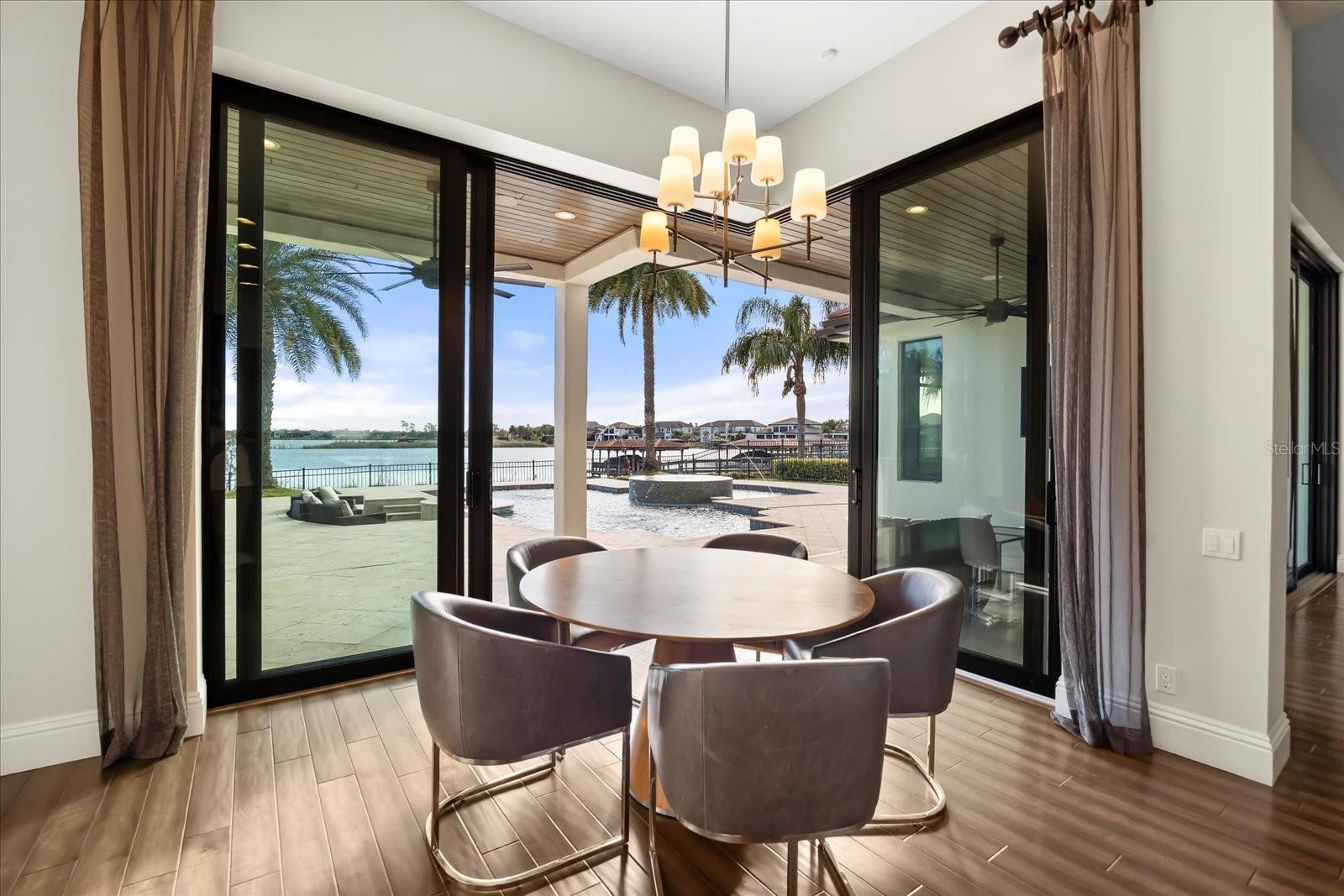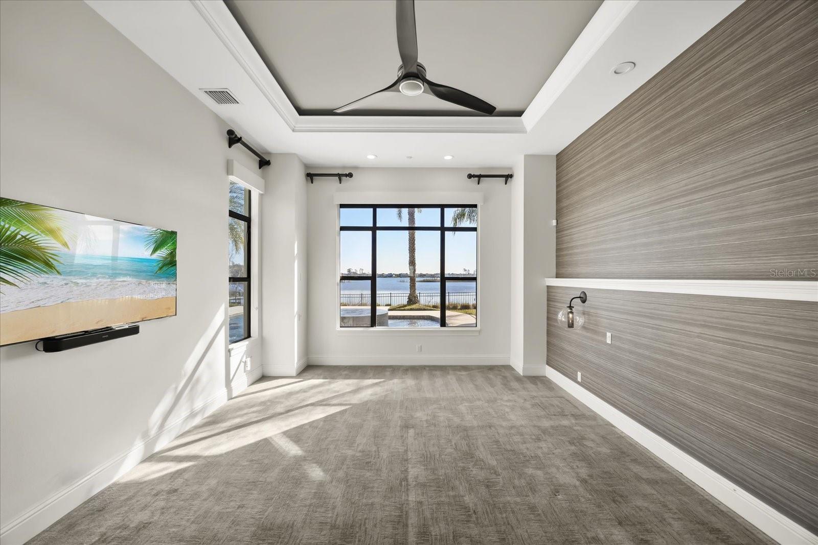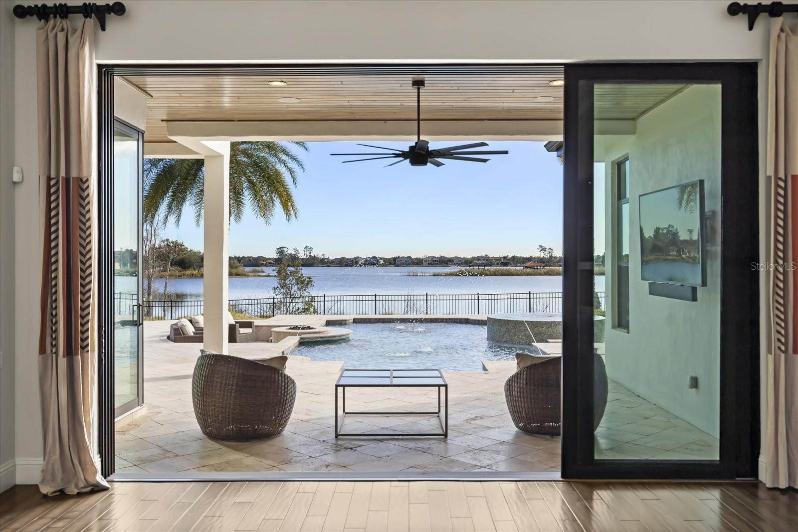 One or more photo(s) has been virtually staged. Experience elevated lakefront luxury living in Windermere with this professionally designed former model home ideally positioned on the shores of Lake Burden. Showcasing 4 bedrooms, 4 full baths, and 2 half baths — including a dedicated pool bath and club room bath — this stunning estate blends timeless architecture, designer finishes, and resort-style outdoor living. Inside, the palatial great room is framed by rich millwork, intricate ceiling details, wood flooring, a circular wet bar, and a stone-accented wine room, while dramatic 10-foot pocket sliding glass doors open completely to the expansive lanai for seamless indoor-outdoor entertaining. The chef’s gourmet kitchen impresses with a massive waterfall-edge island, chef-grade appliances, and two oversized walk-in pantries, flowing effortlessly into the formal dining room highlighted by a statement mirrored ceiling and the light-filled morning room. The first-floor primary suite offers tranquil lake views and a spa-inspired bath with a freestanding soaking tub and oversized walk-in shower. A private den and guest bedroom complete the main level. Upstairs, enjoy a spacious club room with wet bar, dedicated media room/home theater, two additional bedrooms, generous storage space, and a covered balcony overlooking the pool and Lake Burden. Step outside to your private backyard oasis featuring a custom resort-style pool and spa, sunken fire pit lounge, and a fully equipped outdoor kitchen with gas grill, sink, beverage center, and “L”-shaped bar seating — perfect for entertaining or relaxing while enjoying nightly sunset views and Disney fireworks over the water. Recent updates provide peace of mind, including exterior paint (2021), interior paint (2021 & 2025), new carpet (2021), and tankless water heater (2024). A rare opportunity to own a luxury waterfront estate in Windermere, this exceptional home delivers elegance, comfort, and unforgettable views in one of Central Florida’s most desirable lakefront communities.
