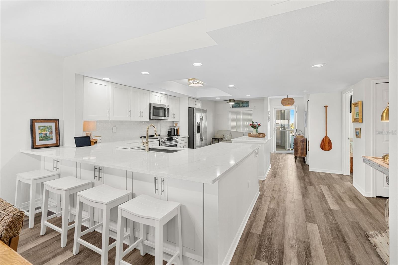 Wake up to the sound of the waves and end your day with salty sunsets in this breathtaking, fully renovated, direct oceanfront condo. Designed for everyday luxury, the kitchen showcases a rare double-island layout, quartz counters throughout, eat-in space, breakfast bar, and a built-in wine & beverage nook. Tile floors run seamlessly throughout. Impact windows and hurricane shutters provide peace of mind, and the in-unit washer/dryer adds convenience. Enjoy premium amenities including a heated pool, clubhouse, private beach access, under-building garage parking with private storage, and the ability to install an EV charger. All within a well-run building known for a proactive board and strong financials. Coastal living that feels elevated without the luxury price tag. Stop paying for vacations to paradise and buy your forever paradise today! Close to all things dinging, shopping, & travel.