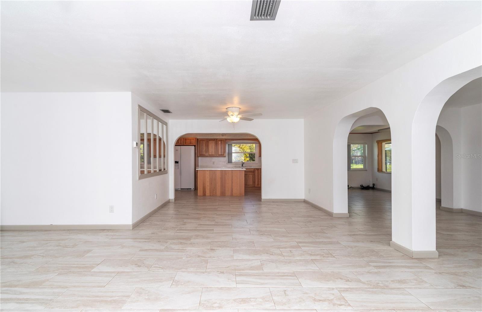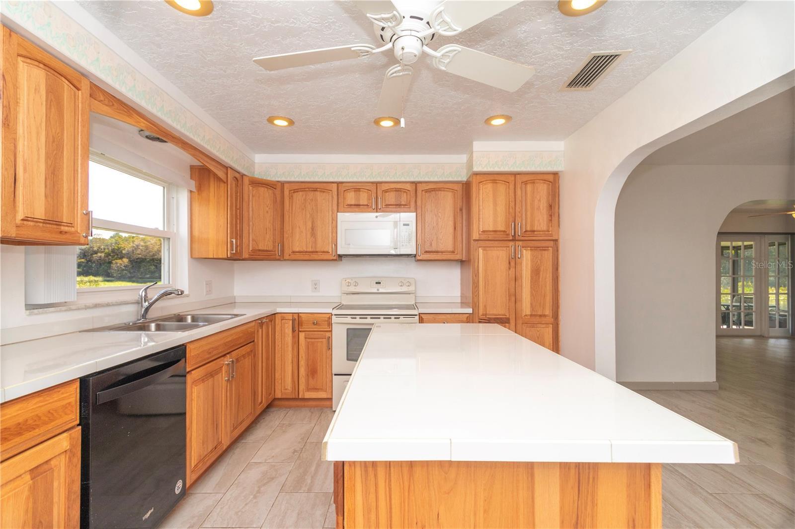 - Ceiling Fans(s), Eat-in Kitchen, High Ceilings, Living Room/Dining Room Combo, Open Floorplan, Primary Bedroom Main Floor, Solid Surface Counters, Solid Wood Cabinets, Split Bedroom, Thermostat, Walk-In Closet(s)