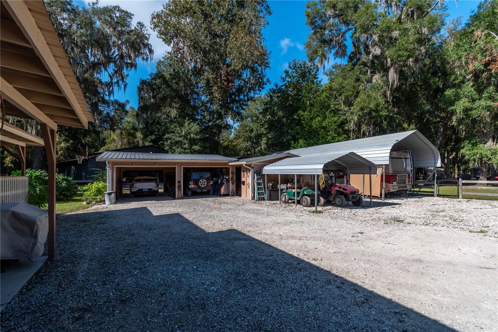 Experience the perfect blend of rustic charm and modern functionality at this unique rural prairie retreat! Expansive spaces meet unparalleled work and recreational amenities on this picturesque 50+ acre property, which is situated on a quiet stretch of Central Florida countryside. The main residence is a lovely country-style cypress wood construction that offers a total of 4-bedrooms and 2-baths with over 2,000 sqft and custom cypress inclusions throughout. A variety of custom touches can be found throughout including a black walnut and cypress staircase, black walnut cabinetry in the kitchen and 2nd floor bath, stone and pecky cypress wood accent walls, skylights, large windows, and more. Both of the upstairs bedrooms include private balconies, offering quiet spaces to enjoy the surrounding property’s stunning natural beauty. The home also features a full unfinished basement that doubles as a storm shelter, providing peace of mind and extra storage flexibility. Recreational features abound, beginning with a sauna by the pool, an inviting gazebo, and a second-story pool patio complete with fans and electric, creating a space well-suited for relaxation or outdoor entertaining. An enchanting one-bedroom, one-bath tree house overlooks the prairie, offering an exclusive retreat for potential Airbnb guests, or a unique getaway right on the property. This property includes a remarkable second-floor apartment in a Quonset barn, featuring two bedrooms, two bathrooms, a newer A/C unit, and brand-new appliances, all complemented by a spacious deck with sweeping prairie views. The main level of the Quonset building also includes three stalls connected to a small paddock, along with a bathroom and laundry room, making it ideal for flexible use. For RV enthusiasts or those seeking rental potential, the property is equipped with two RV hook-ups with septic, one of which hosts a permanent RV. Expansive workshop spaces further enhance this property’s utility, starting with a 3,000-square-foot shop garage adjacent to two container storage units, ideal for equipment and supplies. A second, larger 4,000-square-foot workshop offers 200-amp service, water, and a concrete floor, providing an excellent setup for heavy-duty projects or business needs. Additionally, a detached two-car garage with an air-conditioned office offers further storage or workspace options, perfect for a dedicated office setup or additional hobby space. For those interested in both privacy and natural beauty, the property’s landscape includes 300 cypress trees planted 20 years ago, now fully mature and ready for potential harvest. An airboat ramp is also in place on the property, making this a dream for those who enjoy spending time on the water. Both Ocala and Gainesville are a scenic drive from the property, opening up a huge variety of shopping, dining, and entertainment options to explore year-round. With an ideal mix of residential comfort, expansive workspace, and recreational features, this property offers a unique lifestyle with abundant possibilities, all in a peaceful prairie setting.