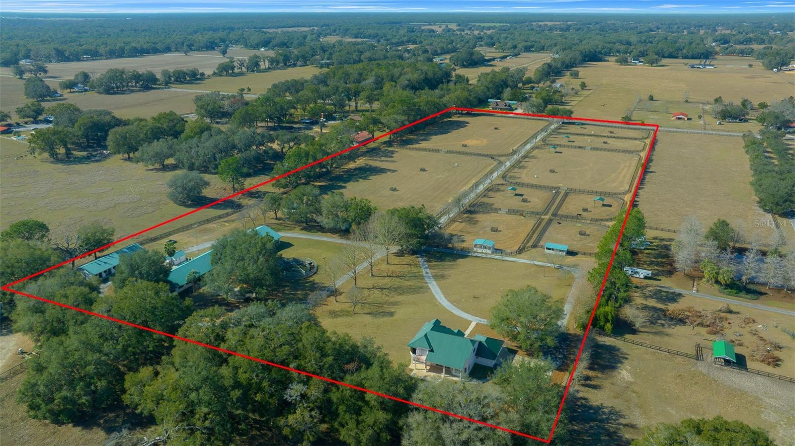 Spanning 16 acres, this picturesque horse farm is a true equestrian paradise. Nestled in rolling hills, it combines functionality with comfort, offering everything needed for horse training, boarding, or private enjoyment. Located in southern Marion County, only 15 minutes from the Florida Horse Park and I-75, 30 min from WEC and close to the Villages. This property is ready to go to work with upgrades including fencing with CenFlex, 2 Concrete Barns with a total of 20 stalls each outfitted with durable rubber mats to enhance horse comfort and safety. Led lighting Energy-efficient, providing bright and even illumination, commercial-grade fans ensure proper ventilation and air circulation for a healthy barn environment. 4 additional wood barns (two are 12 x 24 and two 12x12) with 6 additional stalls designed for overflow or isolation, creating a total of 26 stalls across all barns. These rustic structures add a touch of charm while still providing practical horse accommodations. Among equestrian amenities are Covered Round Pen with a little sitting area on either side, ideal for observing training or giving lessons in any weather and a Horse Walker for cooling down or low-impact exercise. The 9 paddocks are spacious and well maintained, equipped with automatic waterers, ensuring horses stay hydrated and comfortable. The main barns feature a large, covered entertainment area with a modern outdoor kitchen and top of the line grill and a bathroom. After you’ve entered the property through the long driveway and passed the paddocks you now approach the custom-built home sitting high on a hill, a peaceful and elevated location with sweeping views of the surrounding pastures, creating a tranquil retreat at the heart of the farm. The open and airy 3-bed, 2-bath main home has interior high ceilings throughout with plenty of natural light, vinyl plank flooring, and hardwood floors on all bedrooms and stairs. Its kitchen includes custom cabinets, granite countertops, and a breakfast bar with a built-in wine rack. The Bright and Roomy Master Bedroom features a garden tub, his/her closet, extra-long vanity with double sink. Among improvements to the house within the last 4 years are New metal roof, separate HVAC for the master bedroom on the second floor, new well, pump and tank, gutters, Garage motor with remote control and Water Softener. Schedule your showing today.
