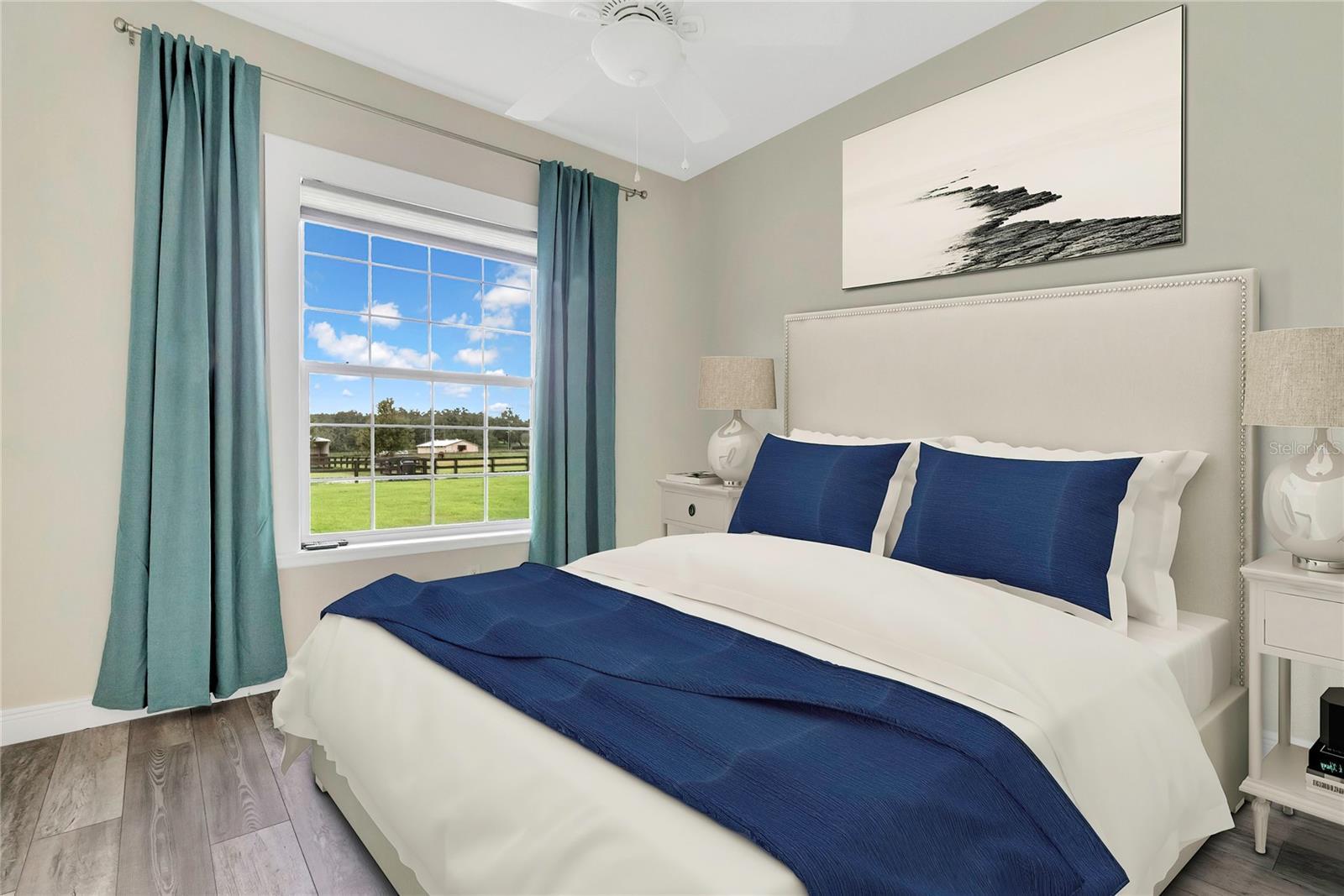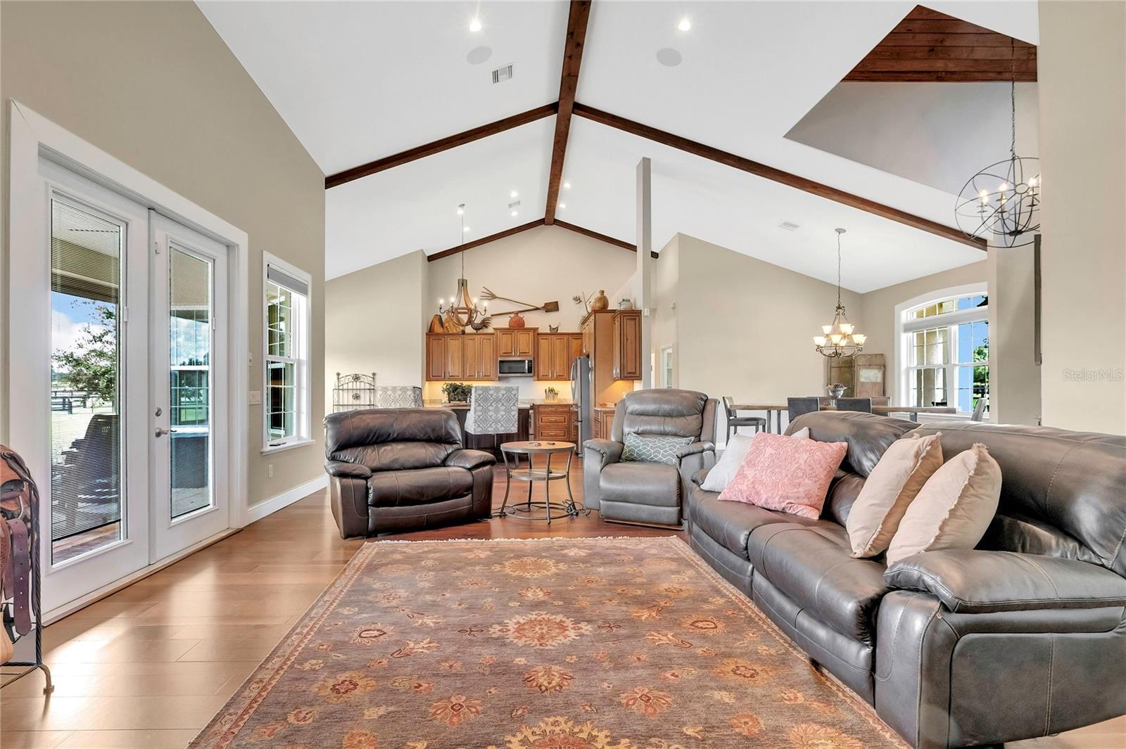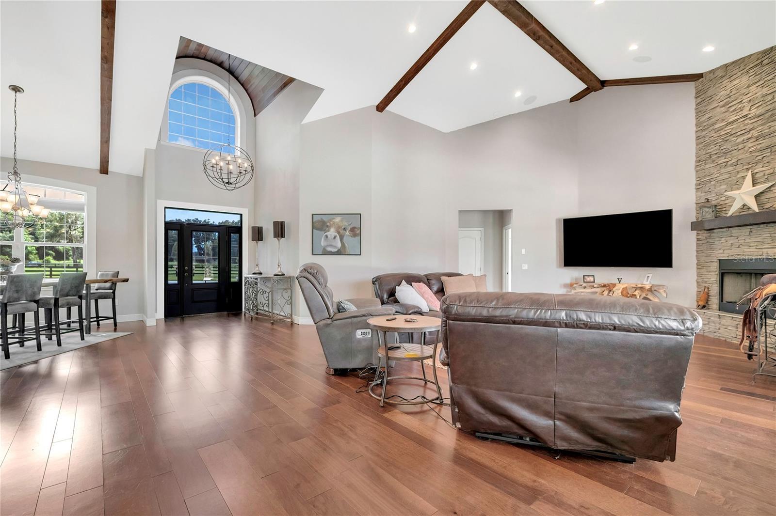DEEDED GREENWAY ACCESS TO THE FLORIDA GREENWAYS AND TRAILS - Unlock the door to unparalleled living with this extraordinary estate nestled on over 10 acres of pristine Central Florida countryside. This is not just a home; it is a statement of luxury living designed for those who demand the absolute best in both style and equestrian. This stunning property offers the perfect blend of luxury living and equestrian amenities designed to provide serenity and function. A custom electric gate welcomes you as you drive to the elegant circular driveway that greets you at the residence. At the center of this magnificent property lies a beautifully crafted 4-bedroom, 3.5-bath home, thoughtfully surrounded by exquisite landscaping. Inside, the open, split-bedroom design is enhanced by soaring cathedral ceilings, creating a refreshing and spacious ambiance. Expansive windows invite natural light into every corner while offering spectacular views of the surrounding landscape. The main living area boasts a striking floor-to-ceiling stacked stone gas fireplace, complemented by charming wood-beamed ceilings. French doors seamlessly connect you to the expansive back patio, perfect for outdoor relaxation or entertaining. For culinary enthusiasts, the eat-in kitchen is a dream come true, featuring modern stainless-steel appliances, custom wood cabinetry, and generous counter space that includes an island, along with a cozy breakfast nook. The bonus is the Generac whole-house generator and two propane tanks. The Starlink hardware and ring will remain also. Indulge in the owner's suite, a haven for tranquility, featuring two spacious walk-in closets with custom shelving and an en-suite luxurious bathroom complete with dual vanities, a walk-in shower, and a garden tub for ultimate relaxation. If you love hosting gatherings, the expansive back patio will not disappoint. It offers a large, covered area with plenty of space for seating, a full summer kitchen, a built-in fire pit, and inviting outdoor lighting, ensuring enjoyment both day and night. Adding to the enjoyment is a heated saltwater pool, spa, and waterfall with a self-cleaning system. For equestrian enthusiasts, the property boasts a new, 100 x 200 all-weather arena with perimeter rails and a built-in watering system, making it perfect for training and riding year-round. Three fully fenced pastures with high-quality three-rail no-climb fencing. There are also two open barns totaling four stalls, each with corner feeders. Additional outbuildings include a feed and tack barn with a wash rack to accommodate all your equestrian needs. Beautiful Spanish Moss-draped oaks surround the property, adding charm and tranquility to the landscape. This property also presents many opportunities for horse enthusiasts, with the potential to create the barn of your dreams and set up paddocks. Additionally, you will have recorded access to the extensive Florida Greenway trail system, providing convenient riding access to the nearby Florida Horse Park! This Central Florida estate offers an unparalleled opportunity to experience luxury living, privacy, and equestrian excellence. Do not miss the chance to make this exceptional property your own!
