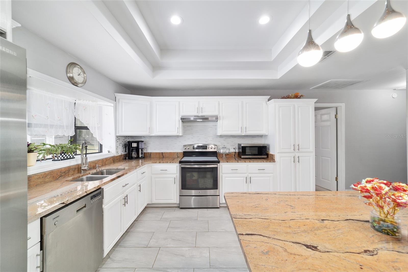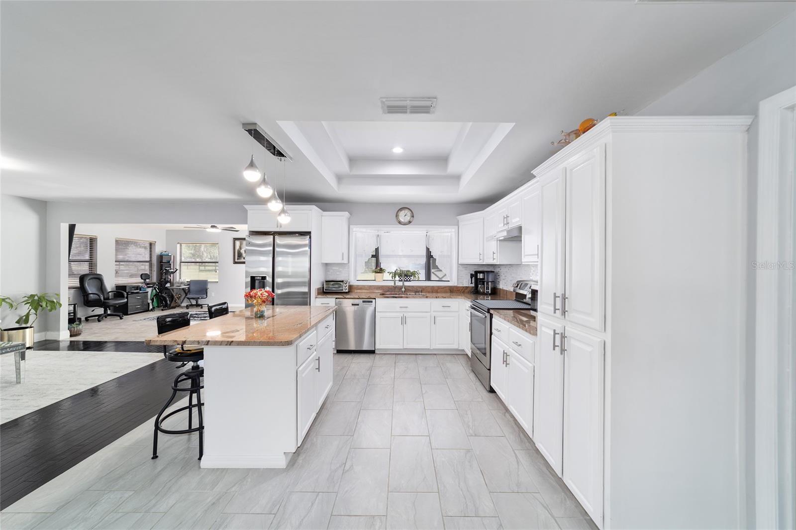 - Ceiling Fans(s), Coffered Ceiling(s), Eat-in Kitchen, Kitchen/Family Room Combo, Open Floorplan, Primary Bedroom Main Floor, Solid Surface Counters, Solid Wood Cabinets, Thermostat, Walk-In Closet(s)