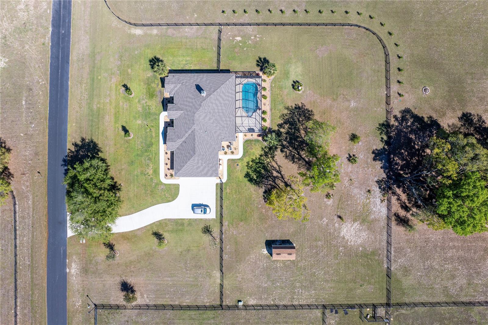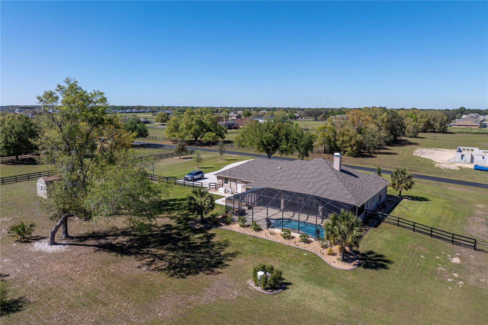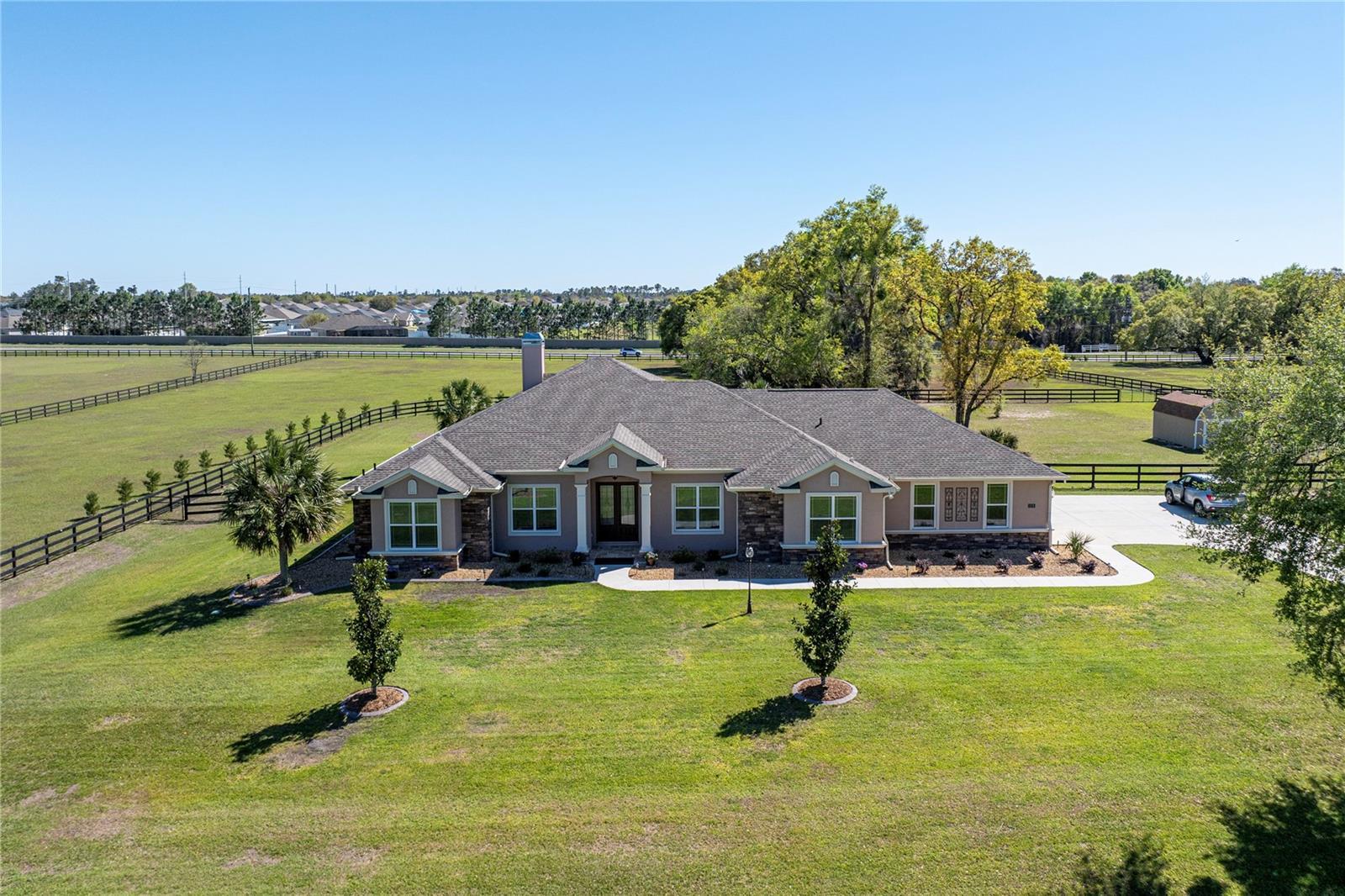 Under contract-accepting backup offers. Welcome to Bradford Farms Equestrian community! – 5.32 +/- acre equestrian estate in a gated equine community. This luxurious 4-bedroom, 3-bathroom home offers an open floor plan with stunning views of the screened-in outdoor pool and Central Florida countryside. The residence is bright and inviting, with an office and triple split-bedroom layout, cathedral ceilings, and a cozy fireplace. For culinary enthusiasts, the eat-in kitchen is a dream come true, featuring a large eat-in kitchen with Cherry cabinets, granite countertops, a large island with seating, Bosch 800 Series appliances, a 5-Burner gas cooktop, a built-in wine rack, accent lighting, and a walk-in pantry. The great room has an 11’ pop ceiling, built-in features, a gas fireplace, built-ins, plus French doors leading to the lanai and pool area. The primary suite boasts two walk-in closets and a luxurious en-suite bathroom with dual vanities, a walk-in shower, and a soaking tub. Spacious laundry room with a laundry sink, granite countertops, and built-in cabinets. The expansive back patio is ideal for hosting gatherings, with a generous covered area that provides ample seating, creating a warm and inviting atmosphere for entertaining, whether during the day or evening. To enhance your experience, a heated saltwater pool adds an extra layer of enjoyment to your outdoor space. 3-Bay heated and cooled garage. 12’ x 20’ cook barn-style outbuilding for the use of your choice. The property has some pet-fenced areas and two fenced paddocks. Additionally, the property includes a whole-house generator, 2 On Demand LP water heaters, and a Lightning arrestor system. It is located close to shopping, medical facilities, and restaurants. Equestrian enthusiasts will enjoy the nearby Florida Greenway trail system. Experience luxury living and equestrian excellence in this exceptional estate!