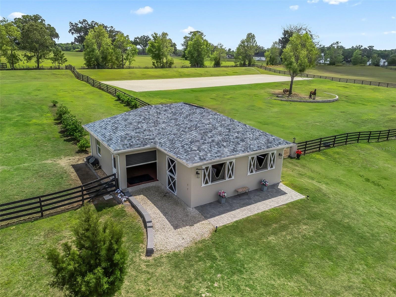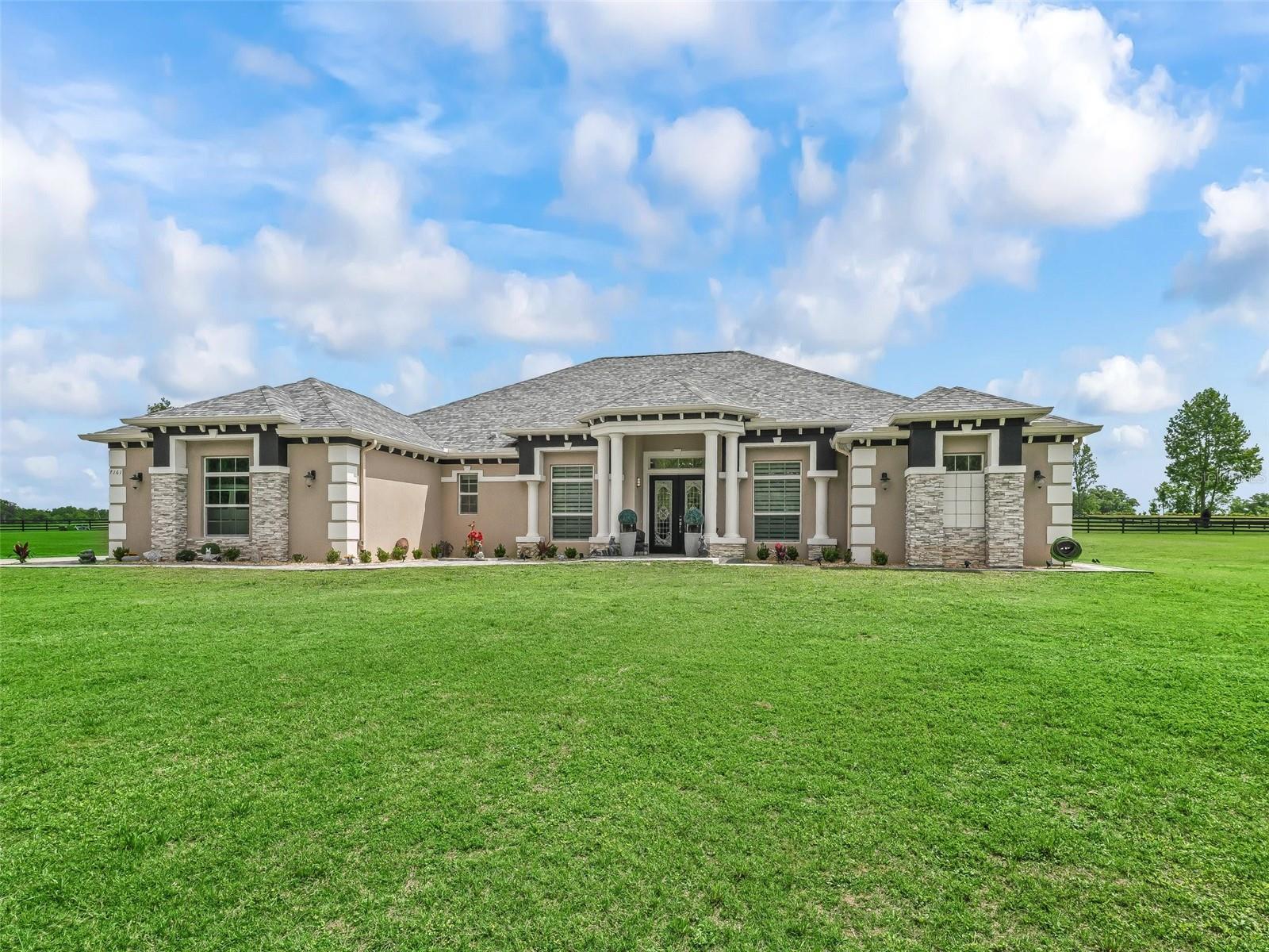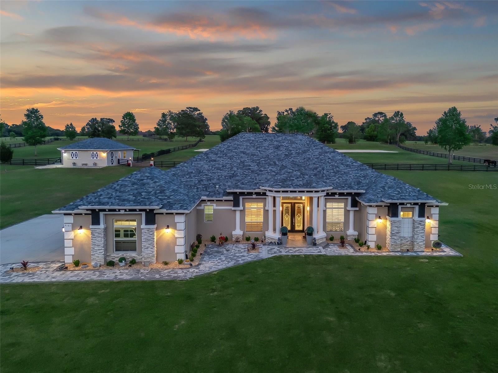 Welcome to your dream estate—where timeless elegance meets equestrian excellence on 5.25 impeccably maintained acres. Just minutes from downtown Ocala, under 20 minutes to the World Equestrian Center, and within 1.5 hours of Tampa and Orlando. Enter through a new solar-powered gated entrance with custom columns to find a private, fully fenced sanctuary with three pastures. The 2023 custom block barn offers oversized stalls, A/C tack room, chandeliers, wash stall, premium mats, vapor tight fan(s) inside and outdoor, luxury rubber pavers—designed for comfort and function. A 2024 professional-grade arena (approx. 80x220 ft) features year-round footing, sprinkler system, and drainage for ideal riding. The main residence welcomes you with stately pillars and handicap-accessible French doors. Inside: faux marble floors, Restoration Hardware chandeliers, 10–11 ft tray ceilings, and a split-bedroom layout with private primary suite. The chef’s kitchen shines with Bosch appliances, farmhouse sink, custom cabinetry, dry bar, and rollout counters—perfect for entertaining. The living room opens to rolling pasture views and a screened lanai with a saltwater pool (dual waterfalls, overflow system) and full outdoor kitchen. Recent upgrades: interior/exterior paint, hardwired POE cameras, alarm system, 2022 whole-home generator with 500-gal propane tank, water softener/filtration, Tesla charging station, extra electrical panels, and new RV hookup. With low utilities, high-end finishes, and equestrian amenities in a prime location, this estate offers luxury and functionality. MOVE-IN READY—furnishings optional, video walk-through available, inspection July 2025