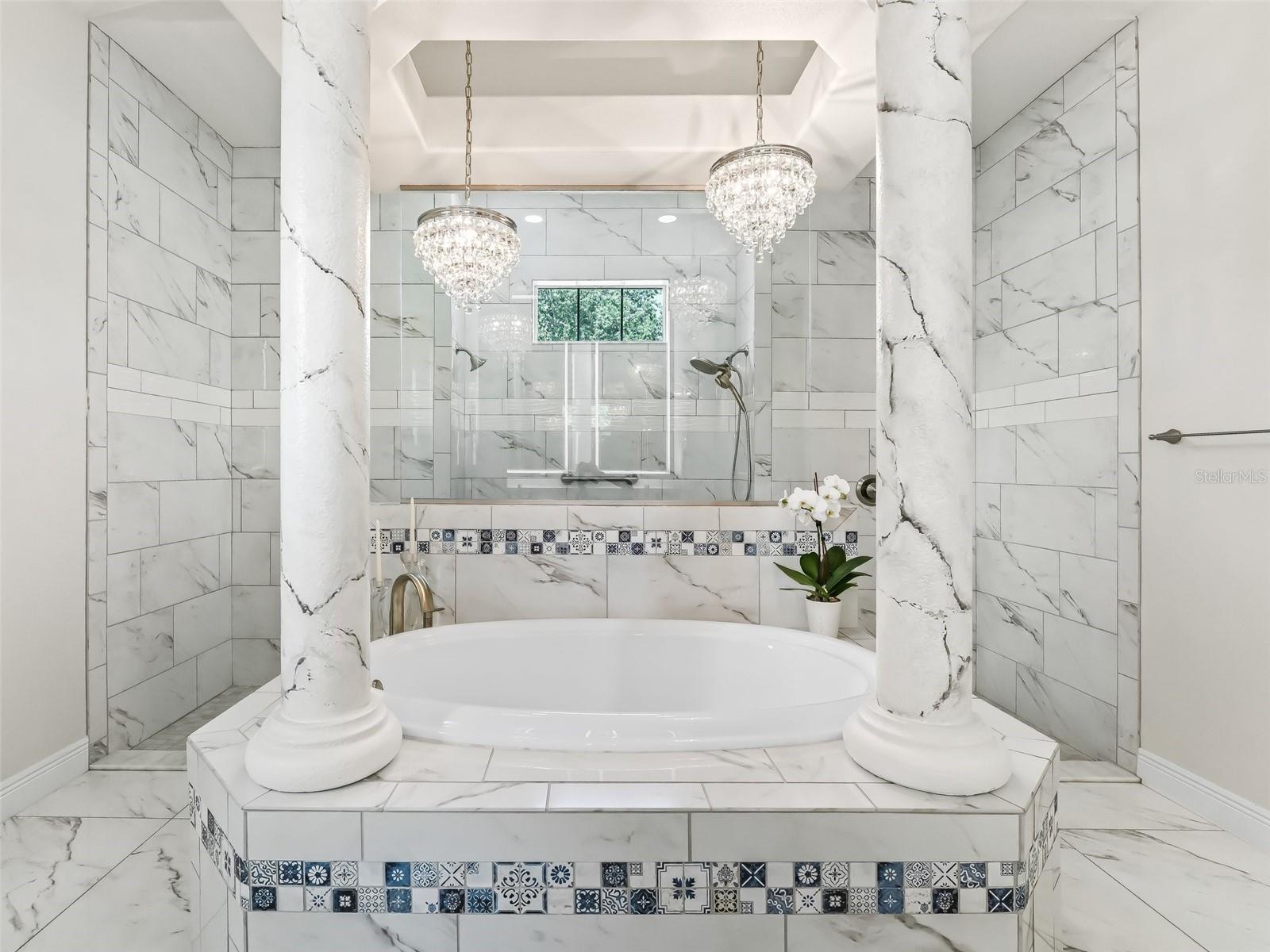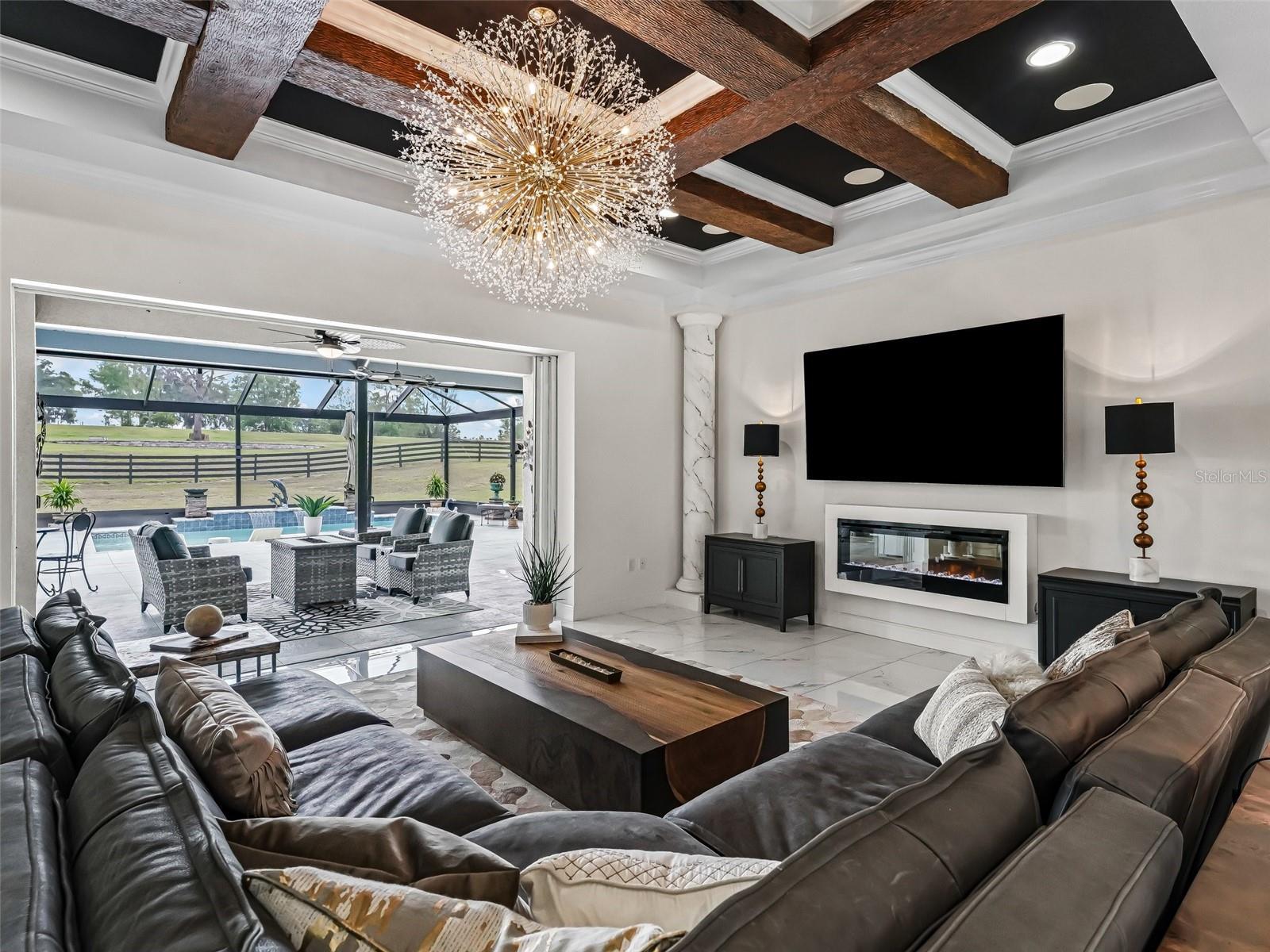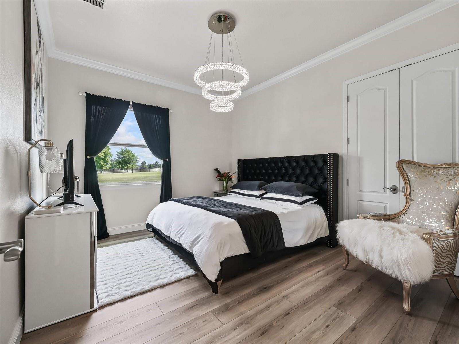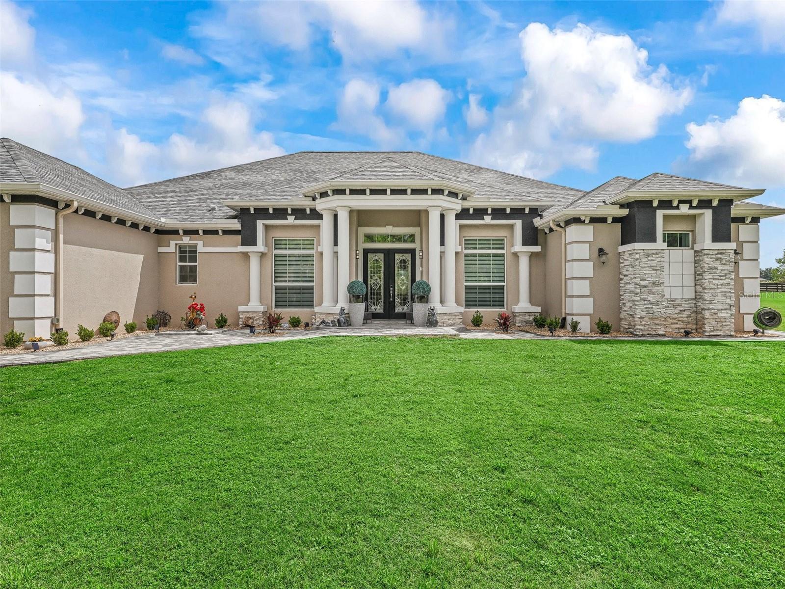 Welcome to your dream estate—where timeless elegance meets equestrian excellence on 5.25 impeccably maintained acres. Just minutes from downtown Ocala, under 20 minutes to the World Equestrian Center, and within 1.5 hours of Tampa and Orlando. Enter through a new solar-powered gated entrance with custom columns to find a private, fully fenced sanctuary with three pastures. The 2023 custom block barn offers oversized stalls, A/C tack room, chandeliers, wash stall, premium mats, vapor tight fan(s) inside and outdoor, luxury rubber pavers—designed for comfort and function. A 2024 professional-grade arena (approx. 80x220 ft) features year-round footing, sprinkler system, and drainage for ideal riding. The main residence welcomes you with stately pillars and handicap-accessible French doors. Inside: faux marble floors, Restoration Hardware chandeliers, 10–11 ft tray ceilings, and a split-bedroom layout with private primary suite. The chef’s kitchen shines with Bosch appliances, farmhouse sink, custom cabinetry, dry bar, and rollout counters—perfect for entertaining. The living room opens to rolling pasture views and a screened lanai with a saltwater pool (dual waterfalls, overflow system) and full outdoor kitchen. Recent upgrades: interior/exterior paint, hardwired POE cameras, alarm system, 2022 whole-home generator with 500-gal propane tank, water softener/filtration, Tesla charging station, extra electrical panels, and new RV hookup. With low utilities, high-end finishes, and equestrian amenities in a prime location, this estate offers luxury and functionality. MOVE-IN READY—furnishings optional, video walk-through available, inspection July 2025