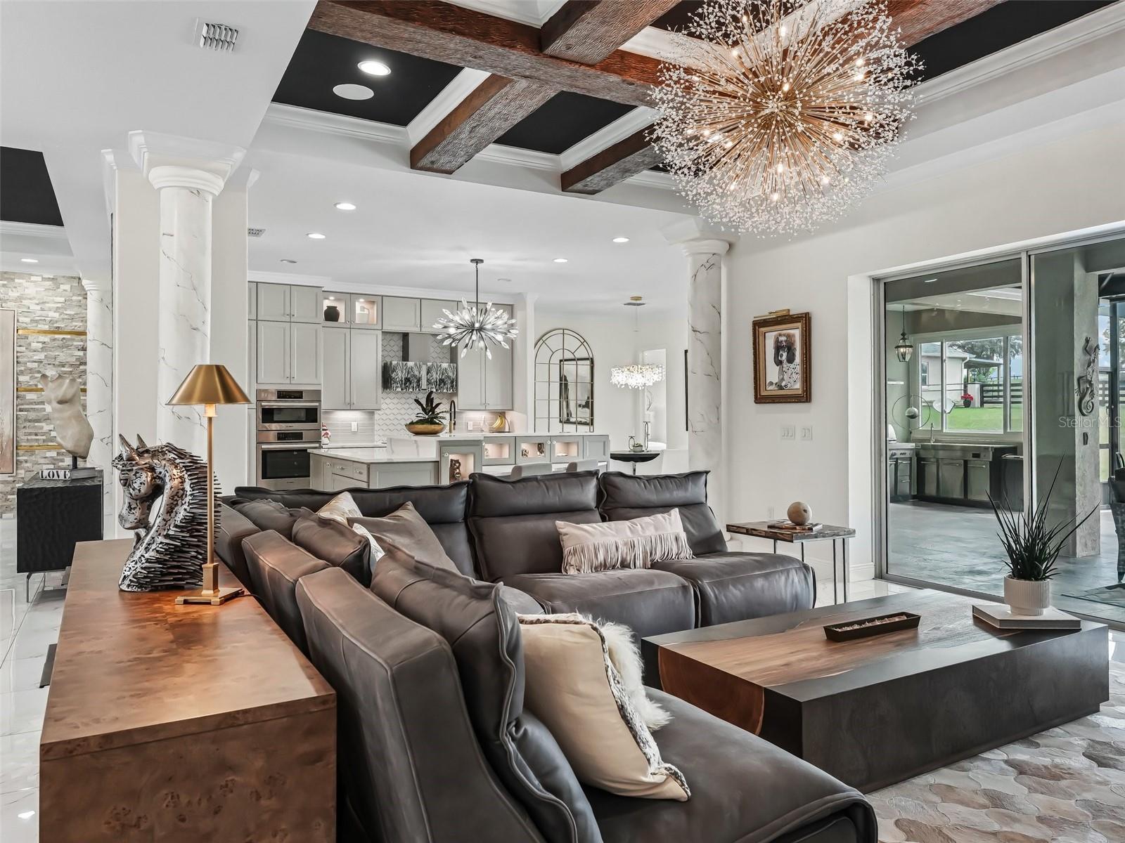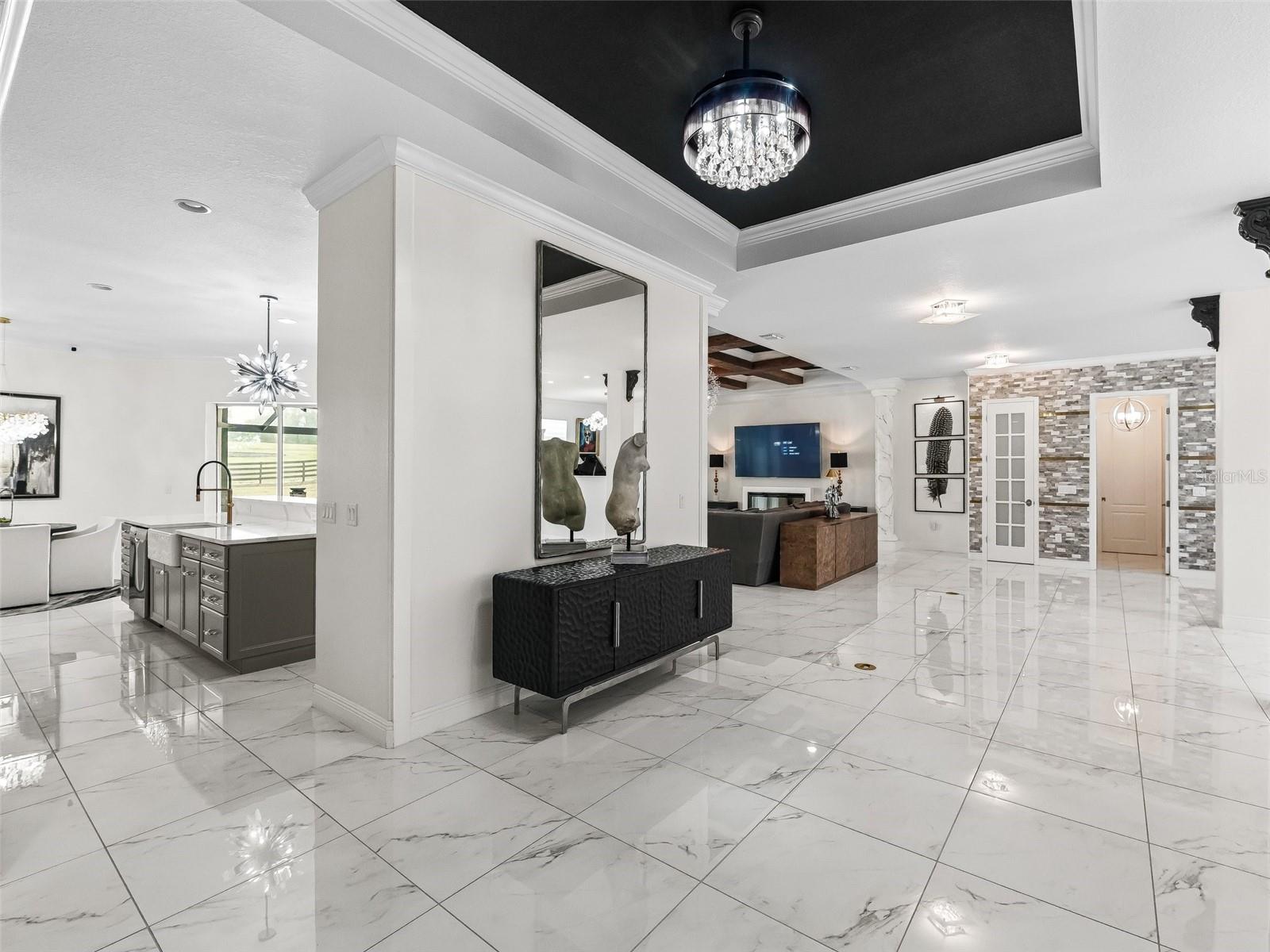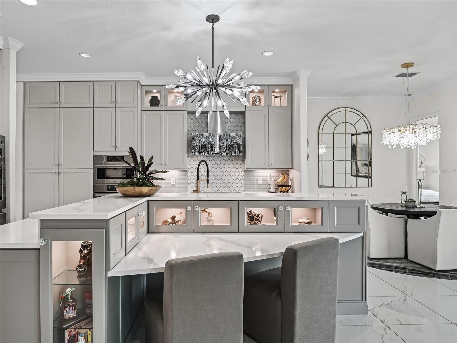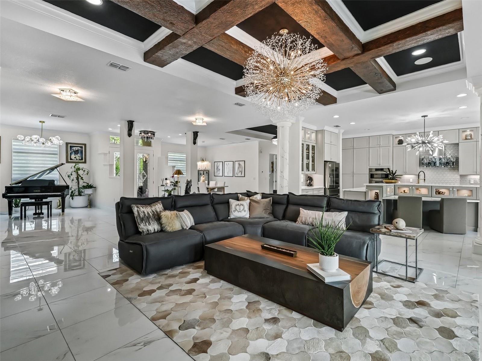 - Accessibility Features, Built-in Features, Ceiling Fans(s), Coffered Ceiling(s), Crown Molding, Dry Bar, Eat-in Kitchen, High Ceilings, Kitchen/Family Room Combo, L Dining, Living Room/Dining Room Combo, Open Floorplan, Primary Bedroom Main Floor, Smart Home, Solid Surface Counters, Solid Wood Cabinets, Split Bedroom, Stone Counters, Thermostat, Tray Ceiling(s), Walk-In Closet(s), Window Treatments