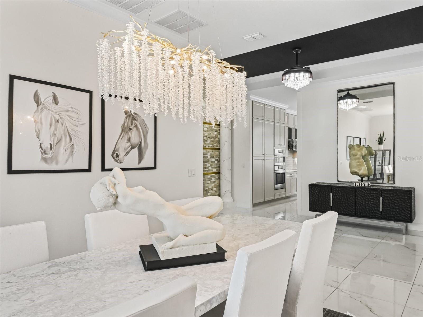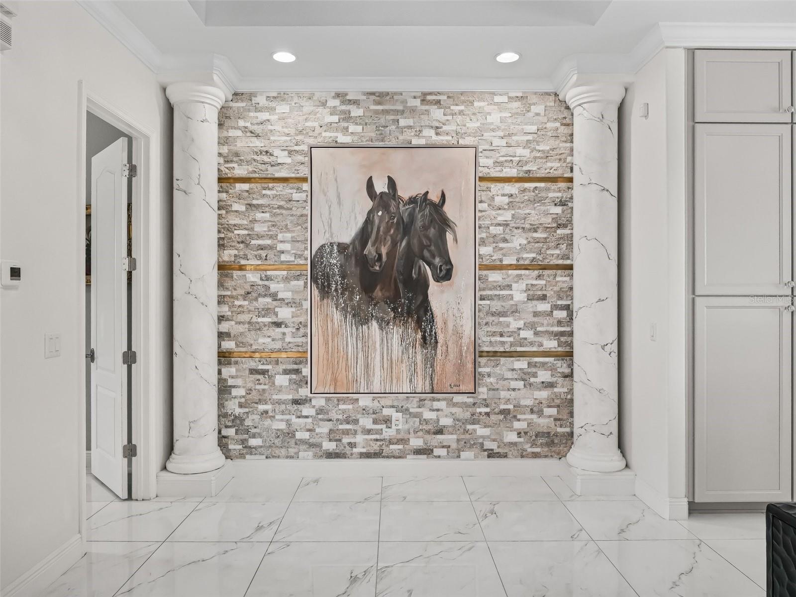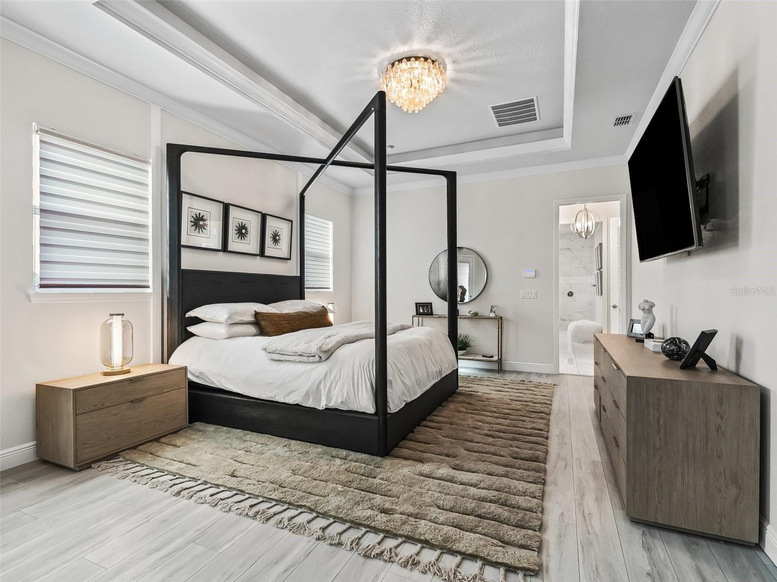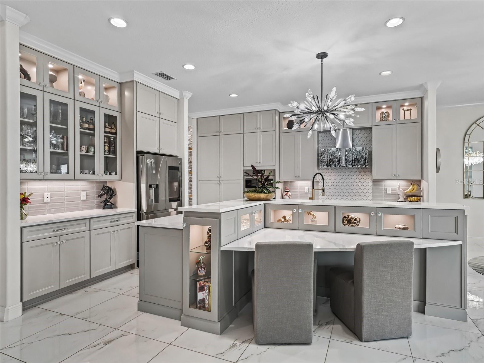 - Accessibility Features, Built-in Features, Ceiling Fans(s), Coffered Ceiling(s), Crown Molding, Dry Bar, Eat-in Kitchen, High Ceilings, Kitchen/Family Room Combo, L Dining, Living Room/Dining Room Combo, Open Floorplan, Primary Bedroom Main Floor, Smart Home, Solid Surface Counters, Solid Wood Cabinets, Split Bedroom, Stone Counters, Thermostat, Tray Ceiling(s), Walk-In Closet(s), Window Treatments