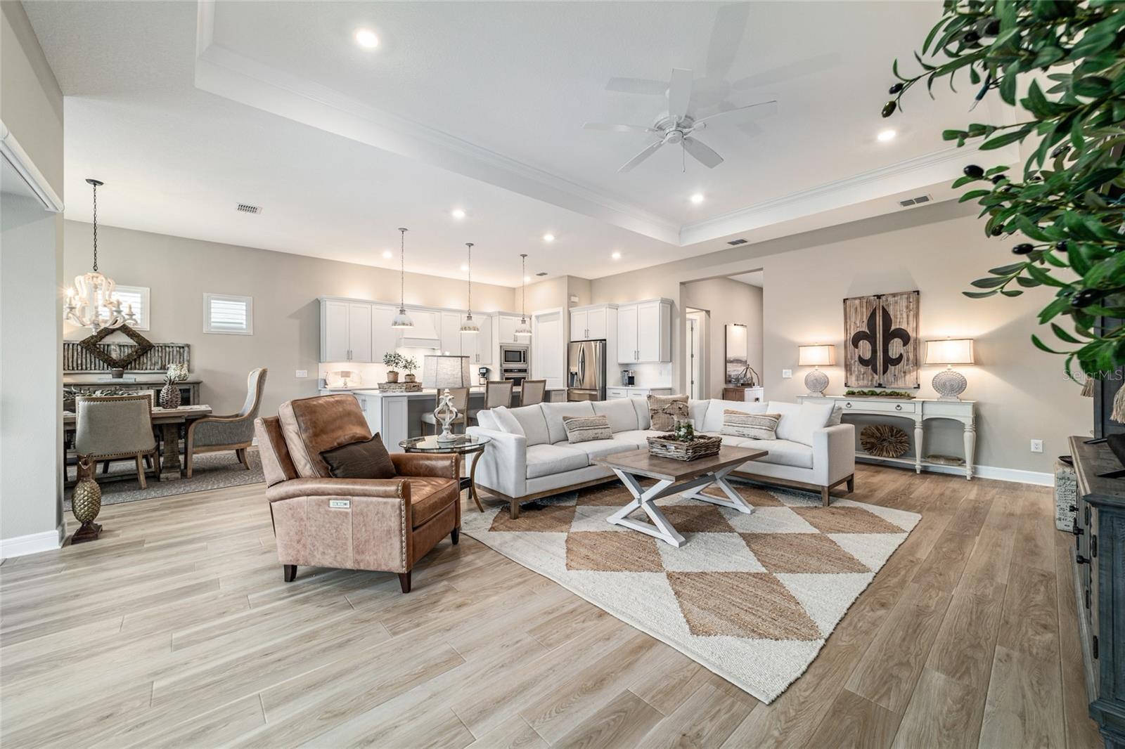 - Ceiling Fans(s), Crown Molding, Eat-in Kitchen, High Ceilings, Kitchen/Family Room Combo, Living Room/Dining Room Combo, Open Floorplan, Primary Bedroom Main Floor, Stone Counters, Thermostat, Tray Ceiling(s), Walk-In Closet(s)
