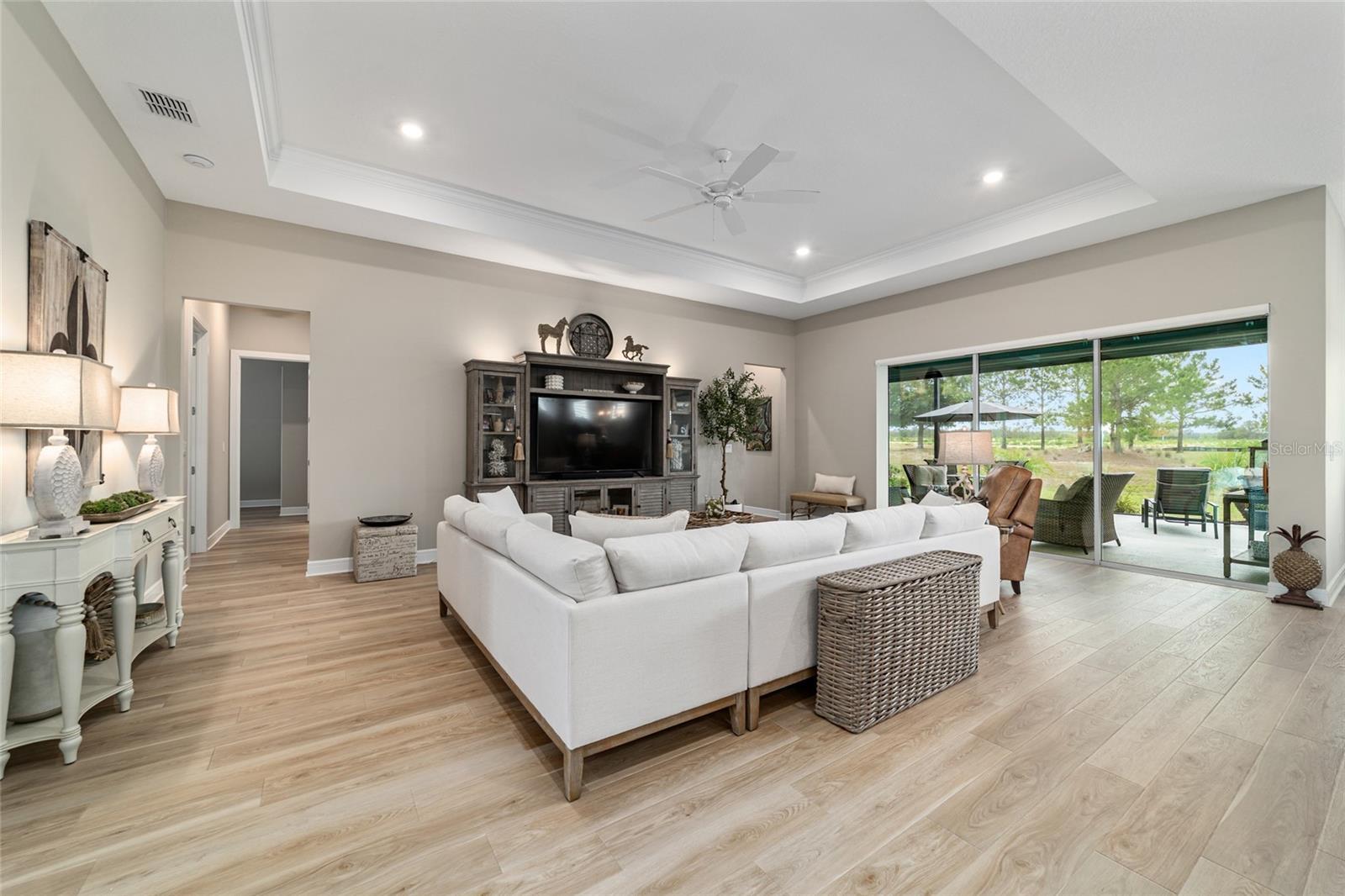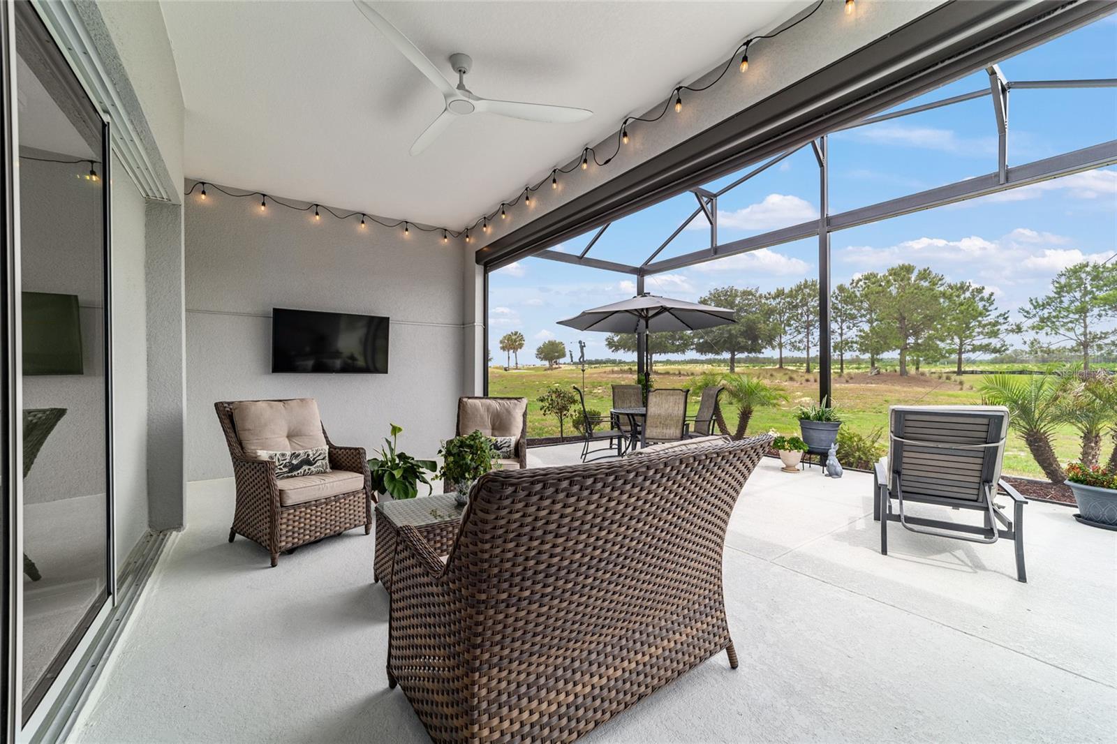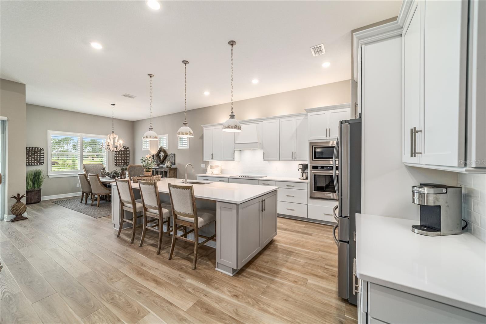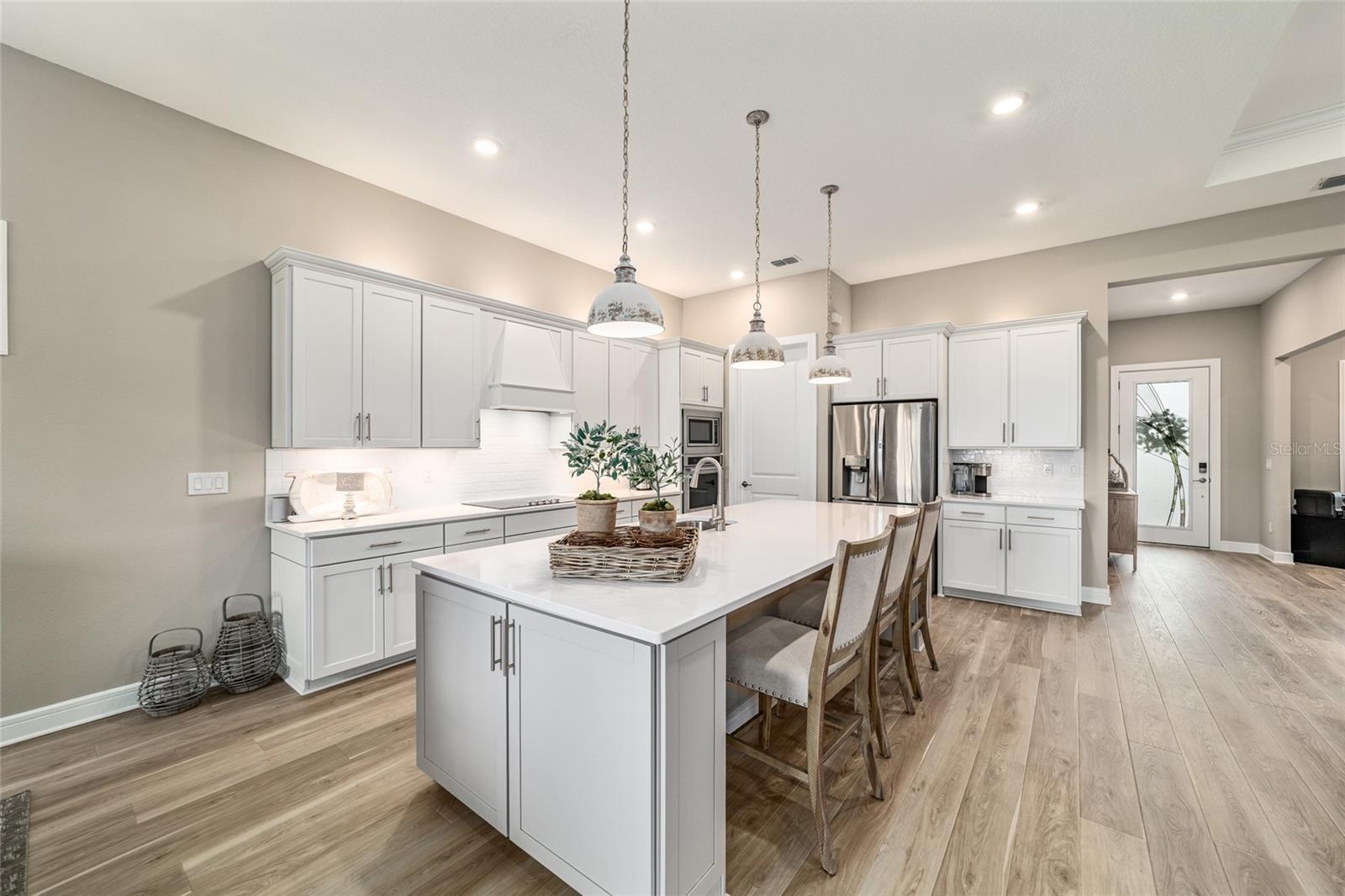 Golf Course Views and Luxury Await! Experience resort-style living at its finest in this almost-new 3-bedroom, 3-bath Stellar model home, complete with a bonus flex room and designer-inspired upgrades throughout. Nestled on a premium golf course lot within the gated 55+ Stone Creek golf community, this meticulously designed residence offers elegance, comfort, and breathtaking views. From the moment you arrive, you’ll be captivated by custom-designed landscaping, stacked stone accents, and charming Craftsman architectural details. A glass inset front door and covered entryway lead into a sophisticated and versatile open-plan living space featuring soaring 10'8" ceilings, LED downlighting, Plantation shutters, and stunning luxury vinyl plank flooring throughout—perfect for both everyday living and entertaining. The gourmet kitchen is a chef’s dream, showcasing designer Shaker-style white cabinetry with crown molding, quartz countertops, upgraded KitchenAid built-in stainless appliances with a wooden canopy hood, under and over-cabinet lighting, and a walk-in pantry for storage needs. A large island with pendant lighting overlooks the inviting gathering room, boasting a tray ceiling and recessed glass sliders leading to the covered lanai and birdcage patio—an ideal setting for relaxing or entertaining while enjoying priceless golf course views. The Owner's suite is a true retreat, offering serene golf course views, abundant natural light, a spacious walk-in closet, and a luxurious en suite bath. Pamper yourself in the spa-inspired bathroom, complete with a large, comfort-height double sink vanity and a Roman-style walk-in shower with a striking glass tile inlay, transom window, and seating ledge. Designed for versatility, the front guest bedroom with a bay window offers privacy with an en suite bath while the second guest bedroom provides flexible space for a hobby room. Additional features to appreciate include a laundry room equipped with a laundry tub, cabinets for storage and a folding area, and a catch-all mudroom leading to the three-car garage with epoxy-covered flooring, overhead storage, and ample space for a golf cart or workshop. This exceptional home is more than just a place to live—it’s a gateway to an active and engaging lifestyle. Immerse yourself in the vibrant community offerings, from championship golf and resort-style pools to a state-of-the-art health spa, a lifestyle department offering exciting excursions, entertainment, and so much more. Don't miss the opportunity to make this dream home yours!