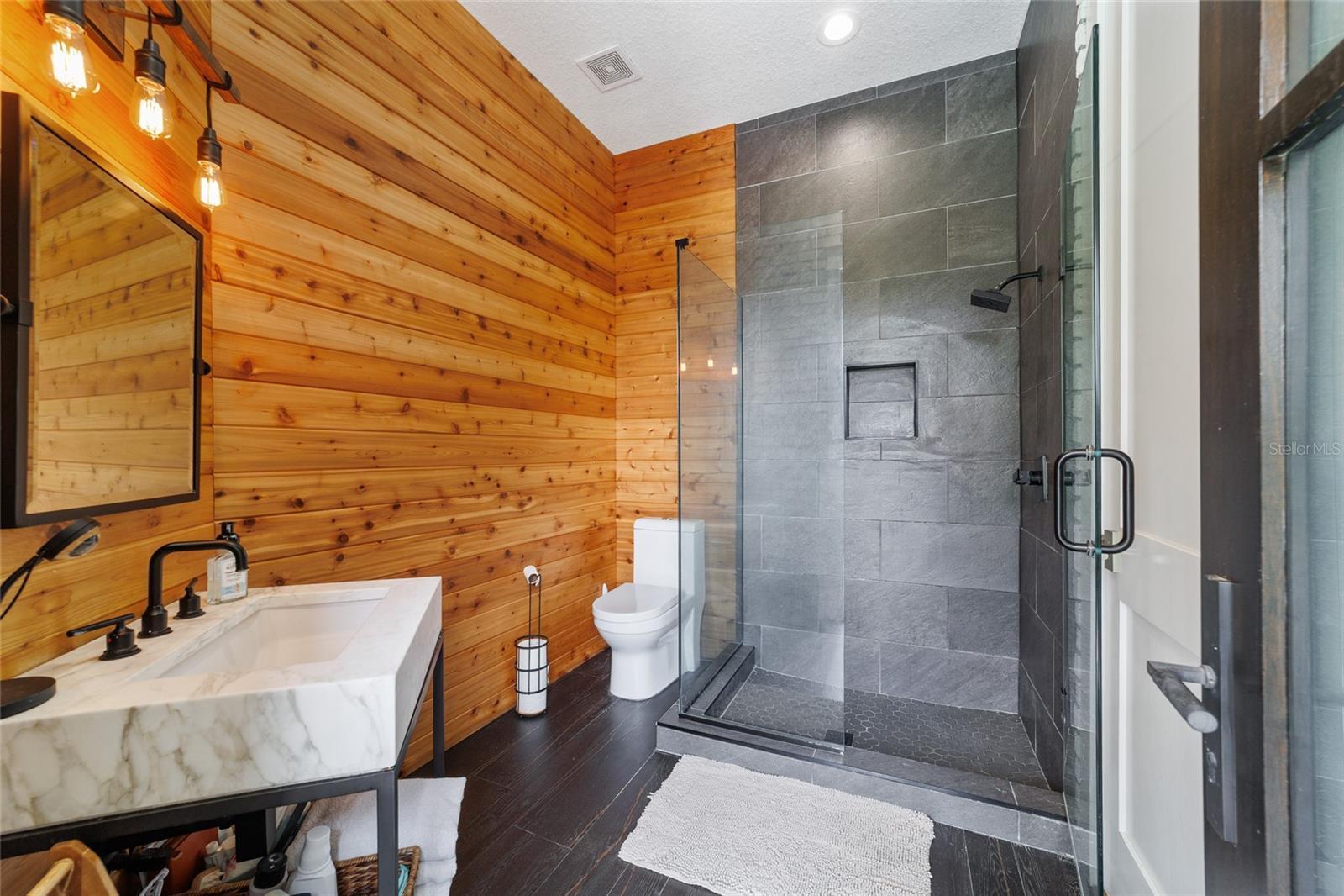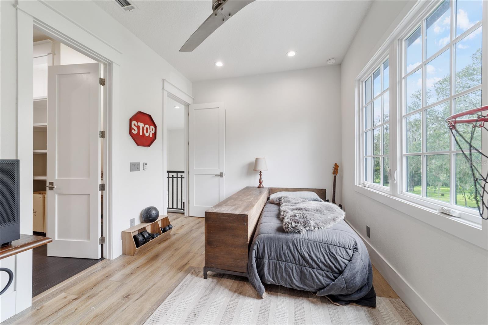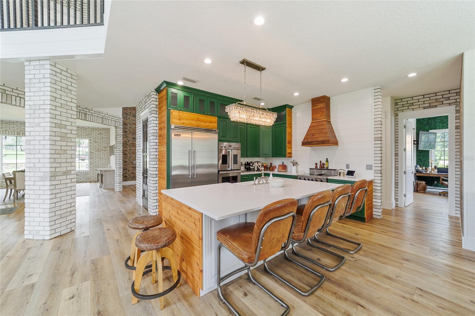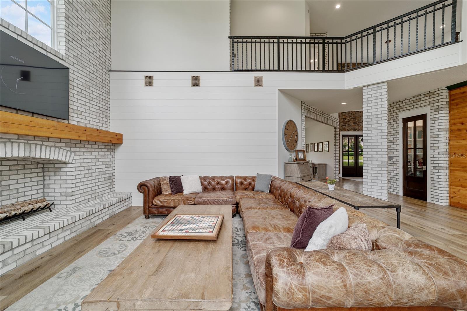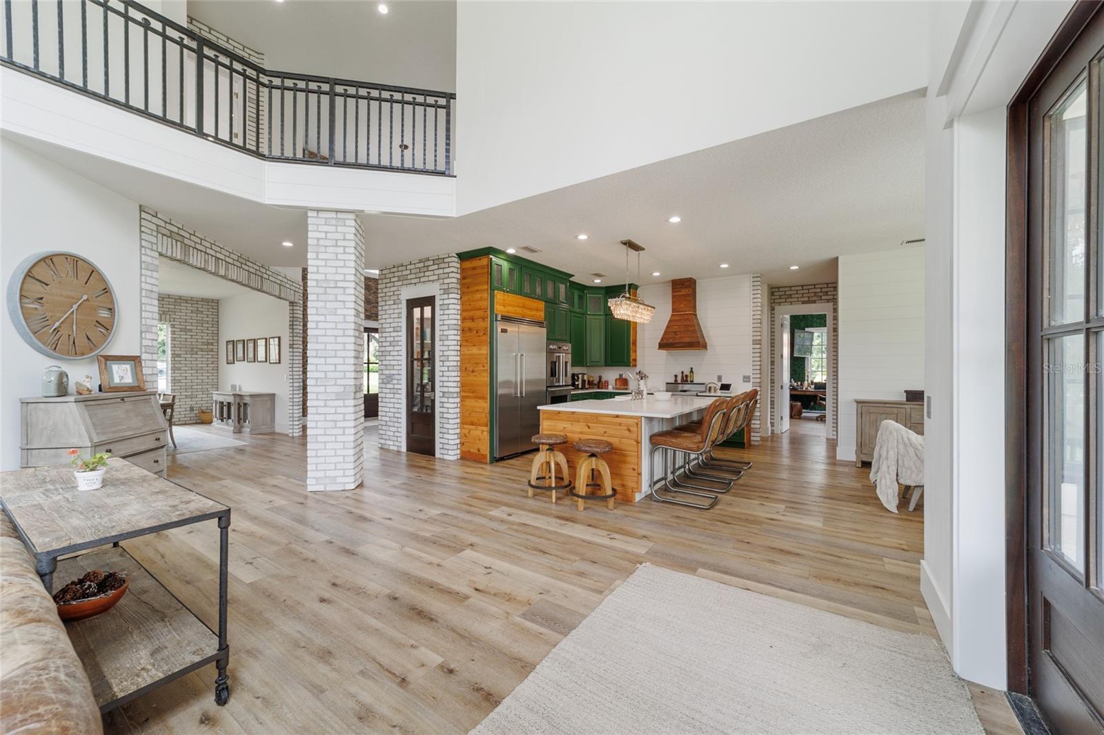 Nestled in the Country Club of Ocala, this beautifully renovated 5-bedroom, 4.5-bathroom home offers luxurious living, thoughtful design and sweeping views of the golf course—best enjoyed from the upstairs balcony off the expansive primary suite. With over 5,000 square feet of updated interior space and premium outdoor amenities, this home is truly one of a kind. Completely reimagined in a multi-year renovation, this home was taken down to the studs and rebuilt with high-end finishes and energy-efficient upgrades throughout, including all-new insulation, upgraded windows and mahogany exterior doors. Step into a grand 2-story foyer with soaring ceilings, a dramatic stone feature wall and a handcrafted wrought iron staircase that immediately sets the tone for this home. The family room is a showstopper with its floor-to-ceiling windows, brick feature wall, and inviting fireplace—flooding the home with natural light and warmth. The open-concept kitchen is a chef’s dream, featuring custom cabinetry, new quartz countertops, top-of-the-line appliances and a large center island—all framed by stylish shiplap walls that continue into the charming breakfast room. The adjacent formal dining room impresses with another brick accent wall. Opposite the formal dining room, a versatile flex room with custom built-ins, a wet bar, and beverage refrigerator is ideal for use as a game room, home office, or study. Two generously sized guest bedrooms with private en-suite baths, a powder room for guests, and a well-appointed laundry room with two sets of washers and dryers complete the first floor. Upstairs, a landing overlooks the living space below and leads to the primary suite, which features a sitting area and direct access to a private balcony overlooking the golf course. The spa-like primary bathroom includes a large tiled shower, round soaking tub, dual vanities and custom his-and-hers closets. Two additional upstairs bedrooms share a Jack-and-Jill bath with double vanities and a tub/shower combo. A large bonus room, already wired for a home theater, could also easily be converted into s a sixth bedroom, with space and plumbing available to add an additional bath. Enjoy Florida living at its finest in the thoughtfully designed outdoor space, which includes a covered patio, resurfaced pool (remarcited just a few years ago), new pool pump, built-in fire pit and an updated cabana with full bath and new split-unit A/C—all surrounded by aluminum fencing. Additional updates include: new air conditioning units (both in 2020), new roof (2018), premium LVP wood-look flooring throughout and fully remodeled bathrooms and kitchen. This exceptional property offers comfort, flexible living spaces, and unbeatable views—all within one of Ocala’s most desirable gated communities. Don’t miss the chance to own this extraordinary home in the heart of the Country Club of Ocala—where every detail has been thoughtfully curated.
