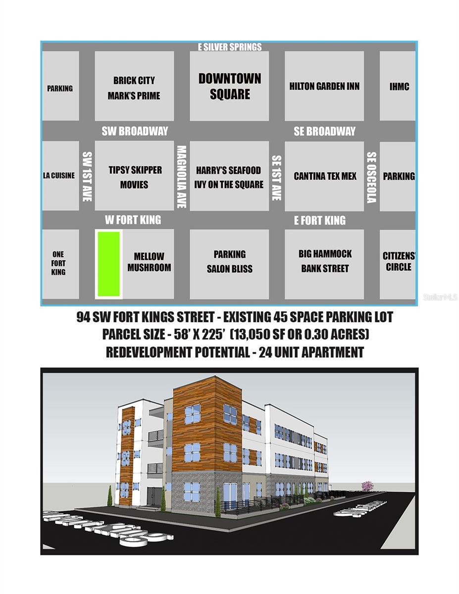 In the heart of fast growing downtown Ocala for sale is this fully functioning 45 space parking lot. This parking lot is vital to the downtown area and provides a great location for visitors. Weekends, holidays and events bring parking challenges with the towns main garage even reaching full capacity. The parking equipment is currently leased and the buyer can continue the lease or have the equipment removed. The parking lot can be redeveloped into 12 Town homes, 20+ condos, Mixed-Use, Restaurant, Bar, Brewery, Spa Salon, Boutique Hotel, Event Venue and more if desired. The owner has designed the site for a future 24 unit apartment project but you could do whatever you want with the property. The Concept design is included with the sale. The seller has a recent survey available which also would be transferred with the sale along with an Environmental study indicating the site is clean. Across the street, 110 SW Fort King (vacant lot) is also for sale by the same owner. See MLS listing OM707230 The property value for this property will only increase with time as more nearby land gets redeveloped. The seller has a concept design and 3D images for the proposed design available.