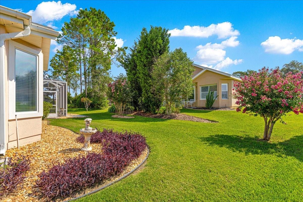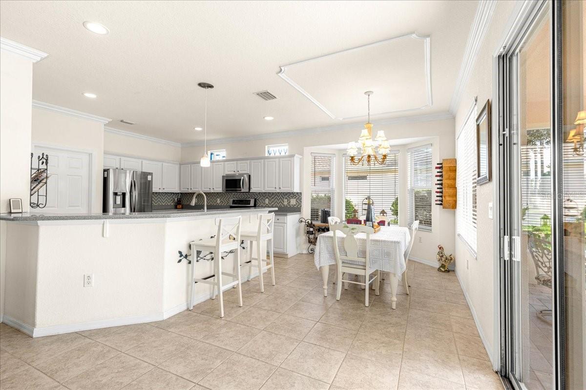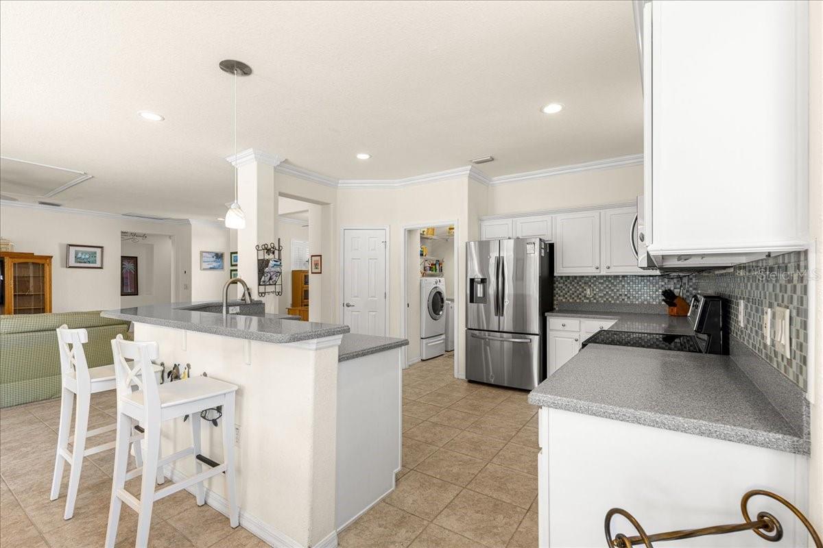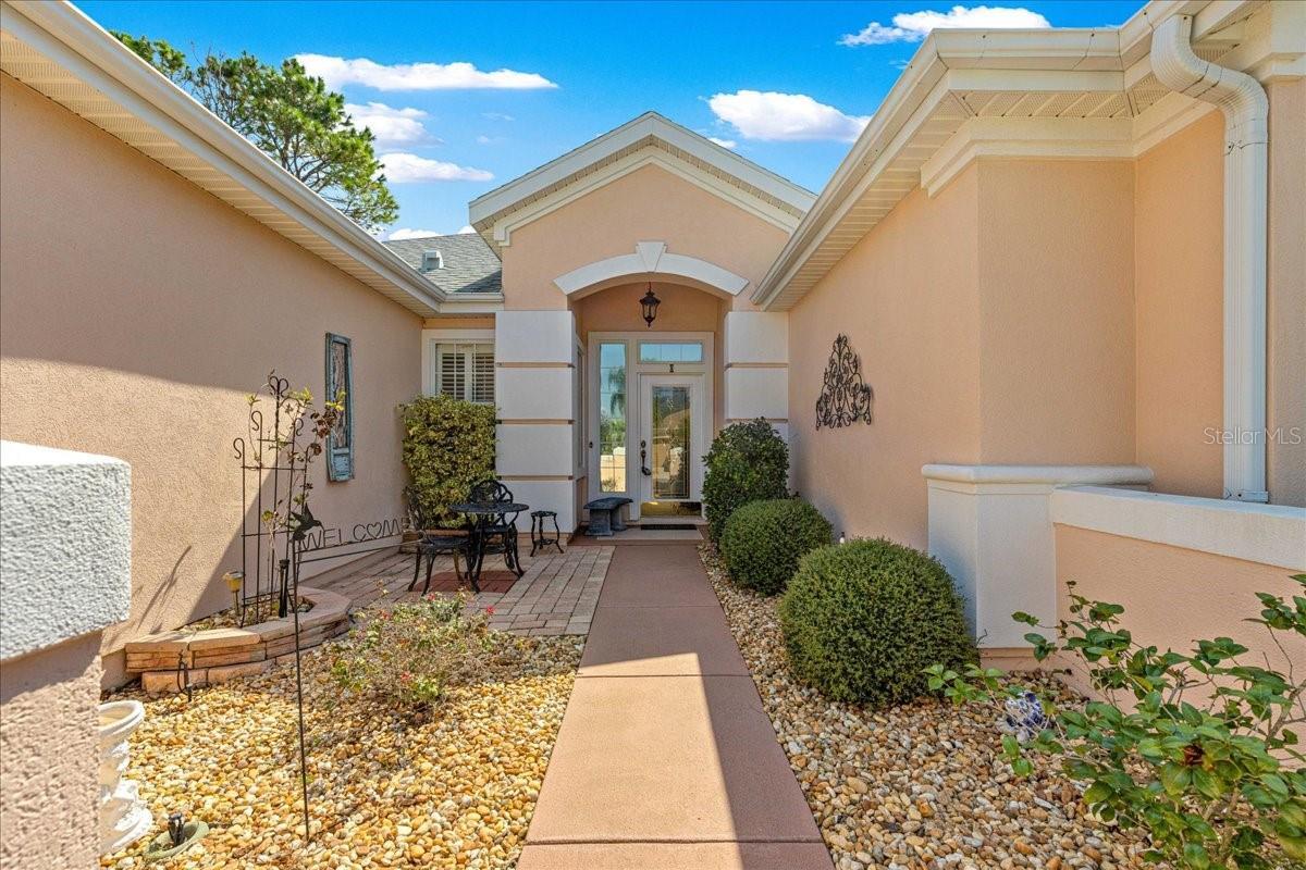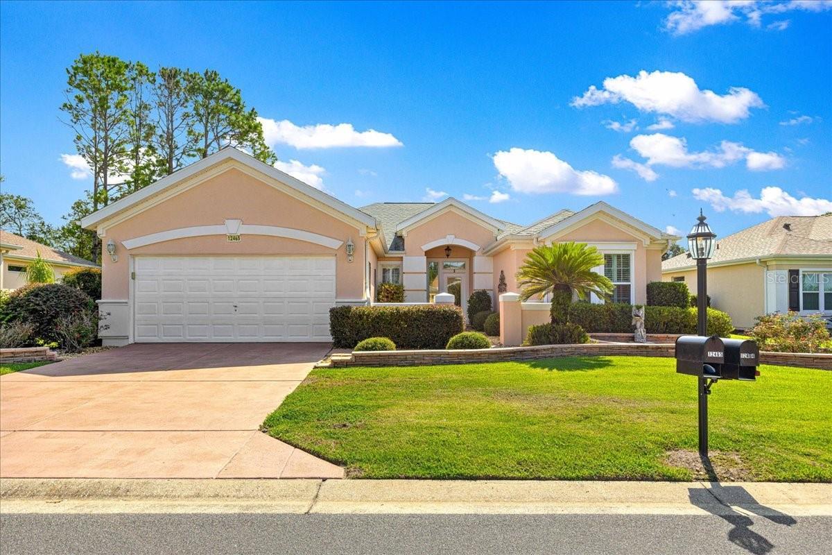 Discover this well-maintained 2 bedroom, 2 bath home plus a den in the highly sought after 55 plus premier golf community of Del Webb Spruce Creek Golf & Country Club. This stunning Madeira floor plan offers exceptional curb appeal with a stained driveway, stacked-stone landscape walls, and a welcome and inviting courtyard entry leading to an elegant leaded glass entry door. Step inside to find touches such as crown molding and plantation shutters, adding sophistication to every room. Tile flooring graces the foyer and all wet areas, while the separate den features parquet wood flooring, making it a perfect home office or flex space. The updated kitchen is a true showstopper, boasting white cabinetry, glass tile backsplash, Corian countertops, newer stainless-steel appliances, recessed lighting, and pendant lighting above the breakfast bar, while above-cabinet recipe windows allow for added light. Enjoy anytime dining in the breakfast nook with a charming bow window. The inside laundry and garage have added overhead storage. The spacious primary suite includes crown molding, plush carpet, a large walk-in closet, and a bow window for added space. The updated ensuite bath includes stone wainscoting, dual raised sinks, and a walk-in shower. The guest bedroom and bath are equally impressive, with crown molding and updates that include stone accents, a raised sink, and a therapeutic soaking tub. Additional highlights include extended garage for extra storage and housing the HVAC system, a tankless water heater for efficiency, and re-shingled roof in 2022. Designed for entertaining, the open floor plan flows seamlessly to the split Lania with one side having an expansive birdcage overlooking the well-landscaped backyard allowing for some privacy, while the other side is an enclosed lanai with a bonus second refrigerator and television. Furniture is available for purchase as a separate package. Enjoy resort-style living with golf, pools, fitness, dining, and endless activities in one of Florida’s premier active adult communities.