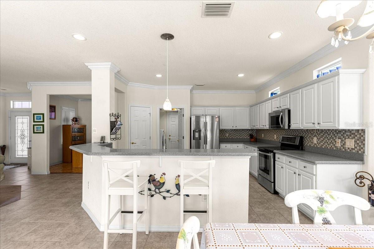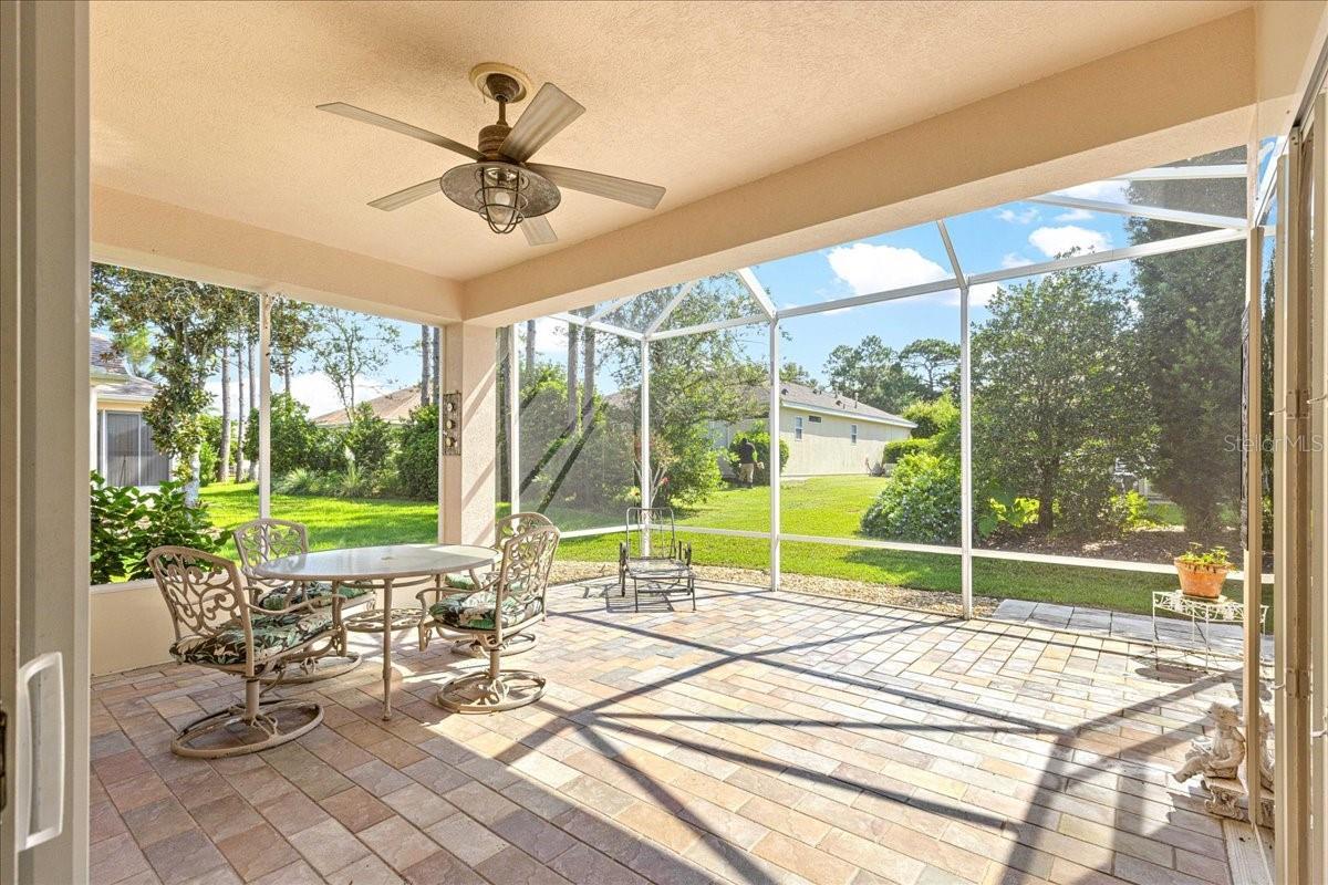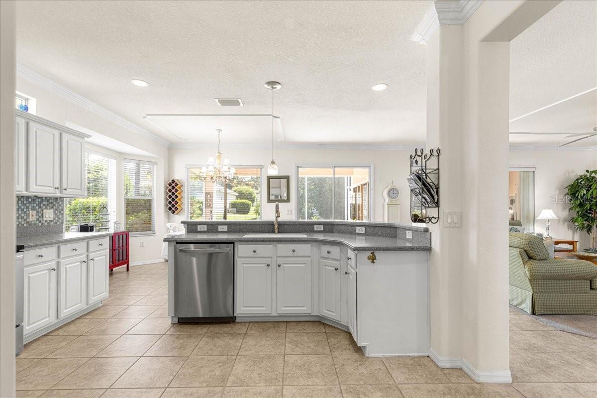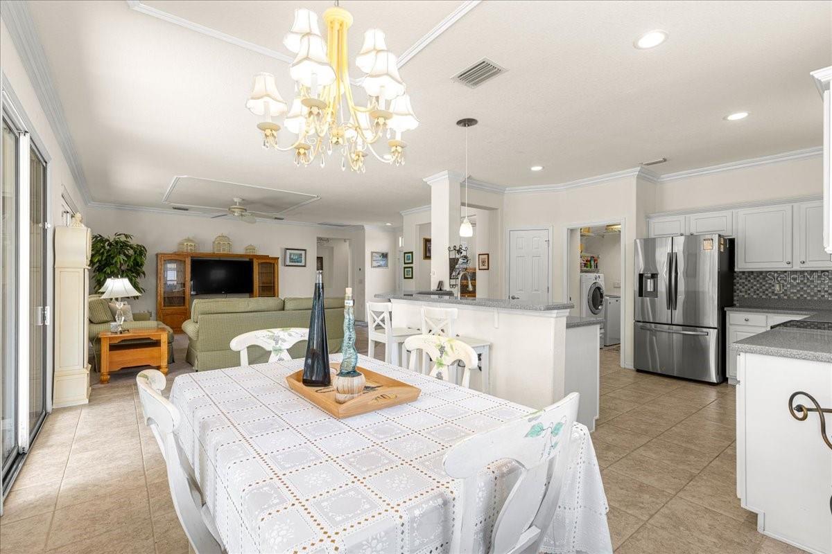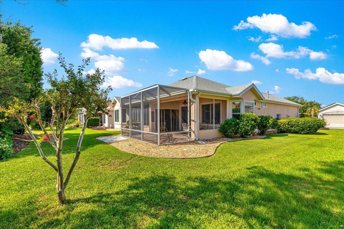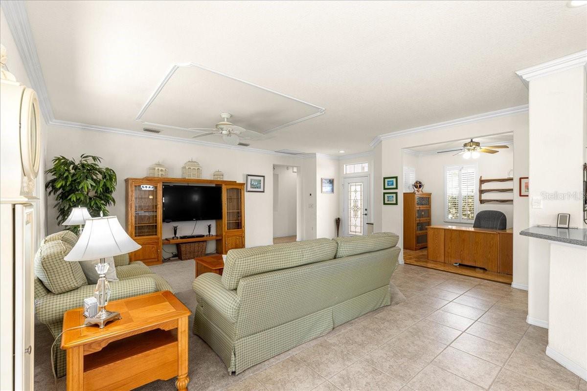 Discover this well-maintained 2 bedroom, 2 bath home plus a den in the highly sought after 55 plus premier golf community of Del Webb Spruce Creek Golf & Country Club. This stunning Madeira floor plan offers exceptional curb appeal with a stained driveway, stacked-stone landscape walls, and a welcome and inviting courtyard entry leading to an elegant leaded glass entry door. Step inside to find touches such as crown molding and plantation shutters, adding sophistication to every room. Tile flooring graces the foyer and all wet areas, while the separate den features parquet wood flooring, making it a perfect home office or flex space. The updated kitchen is a true showstopper, boasting white cabinetry, glass tile backsplash, Corian countertops, newer stainless-steel appliances, recessed lighting, and pendant lighting above the breakfast bar, while above-cabinet recipe windows allow for added light. Enjoy anytime dining in the breakfast nook with a charming bow window. The inside laundry and garage have added overhead storage. The spacious primary suite includes crown molding, plush carpet, a large walk-in closet, and a bow window for added space. The updated ensuite bath includes stone wainscoting, dual raised sinks, and a walk-in shower. The guest bedroom and bath are equally impressive, with crown molding and updates that include stone accents, a raised sink, and a therapeutic soaking tub. Additional highlights include extended garage for extra storage and housing the HVAC system, a tankless water heater for efficiency, and re-shingled roof in 2022. Designed for entertaining, the open floor plan flows seamlessly to the split Lania with one side having an expansive birdcage overlooking the well-landscaped backyard allowing for some privacy, while the other side is an enclosed lanai with a bonus second refrigerator and television. Furniture is available for purchase as a separate package. Enjoy resort-style living with golf, pools, fitness, dining, and endless activities in one of Florida’s premier active adult communities.