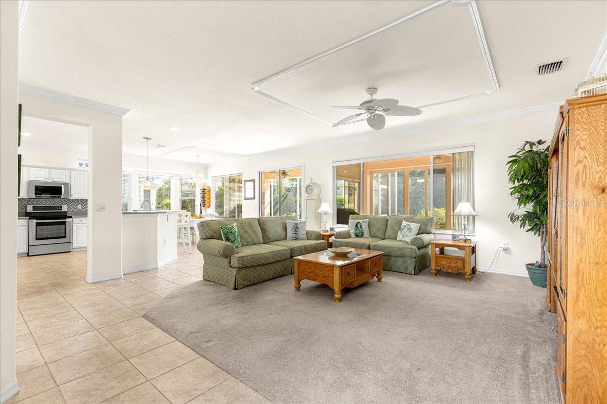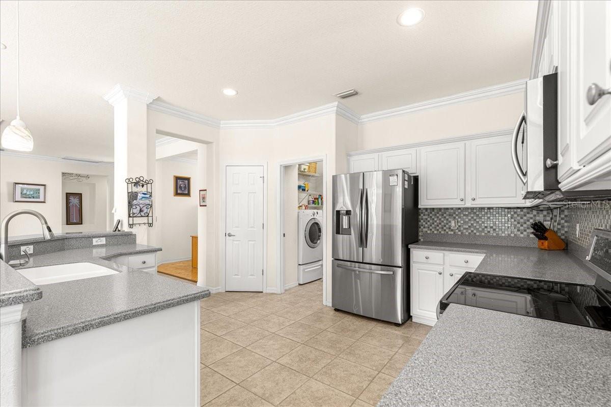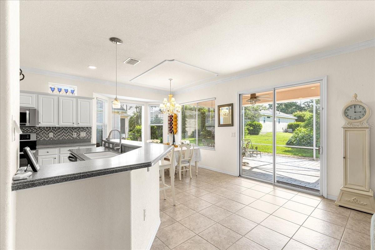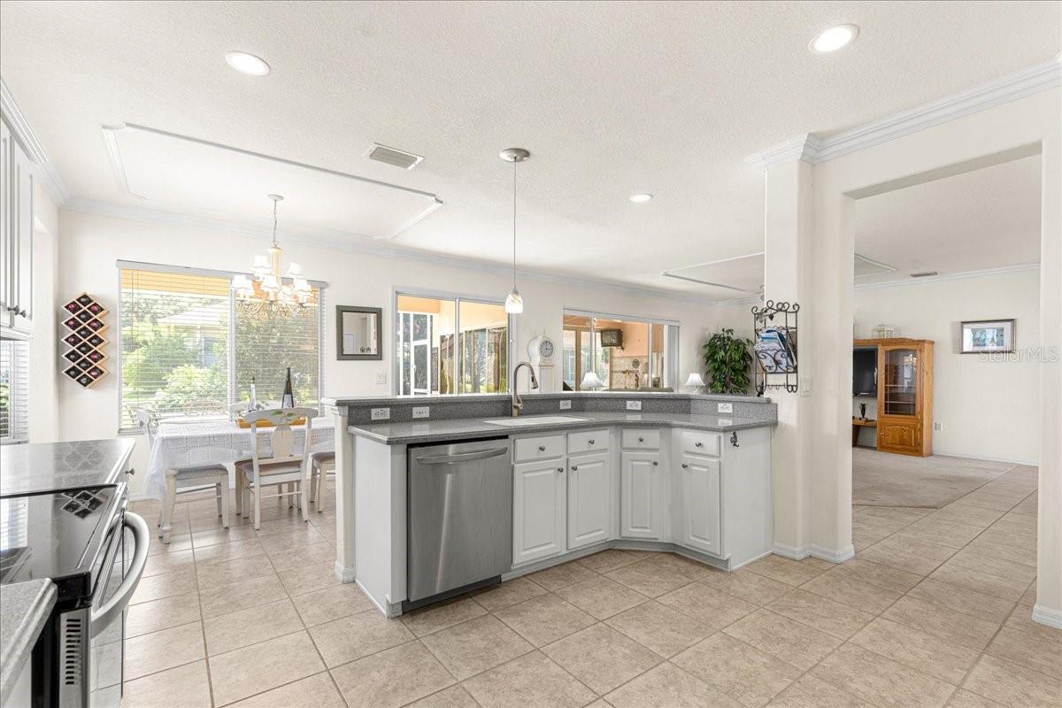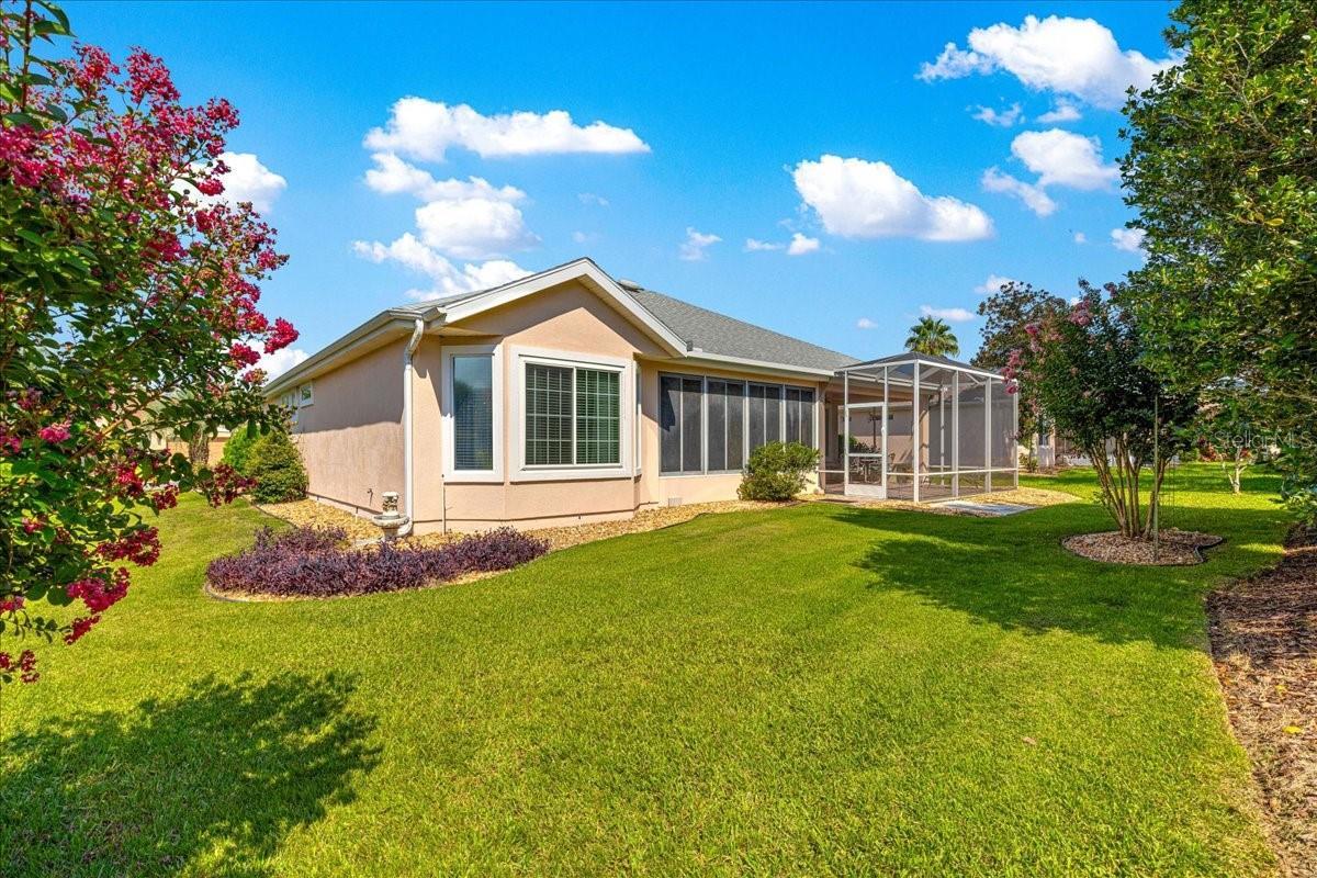 Discover this well-maintained 2 bedroom, 2 bath home plus a den in the highly sought after 55 plus premier golf community of Del Webb Spruce Creek Golf & Country Club. This stunning Madeira floor plan offers exceptional curb appeal with a stained driveway, stacked-stone landscape walls, and a welcome and inviting courtyard entry leading to an elegant leaded glass entry door. Step inside to find touches such as crown molding and plantation shutters, adding sophistication to every room. Tile flooring graces the foyer and all wet areas, while the separate den features parquet wood flooring, making it a perfect home office or flex space. The updated kitchen is a true showstopper, boasting white cabinetry, glass tile backsplash, Corian countertops, newer stainless-steel appliances, recessed lighting, and pendant lighting above the breakfast bar, while above-cabinet recipe windows allow for added light. Enjoy anytime dining in the breakfast nook with a charming bow window. The inside laundry and garage have added overhead storage. The spacious primary suite includes crown molding, plush carpet, a large walk-in closet, and a bow window for added space. The updated ensuite bath includes stone wainscoting, dual raised sinks, and a walk-in shower. The guest bedroom and bath are equally impressive, with crown molding and updates that include stone accents, a raised sink, and a therapeutic soaking tub. Additional highlights include extended garage for extra storage and housing the HVAC system, a tankless water heater for efficiency, and re-shingled roof in 2022. Designed for entertaining, the open floor plan flows seamlessly to the split Lania with one side having an expansive birdcage overlooking the well-landscaped backyard allowing for some privacy, while the other side is an enclosed lanai with a bonus second refrigerator and television. Furniture is available for purchase as a separate package. Enjoy resort-style living with golf, pools, fitness, dining, and endless activities in one of Florida’s premier active adult communities.