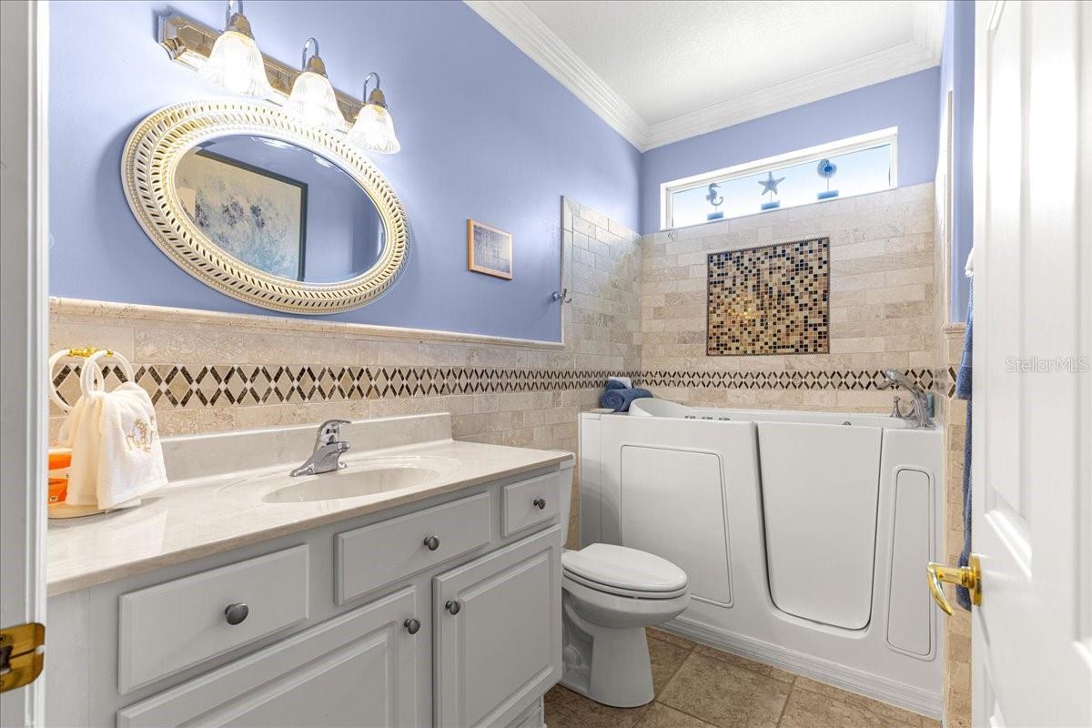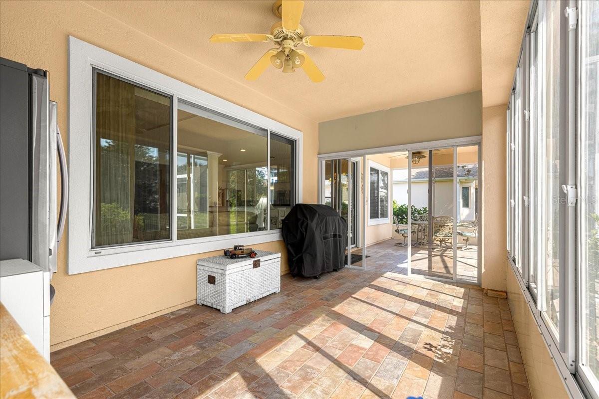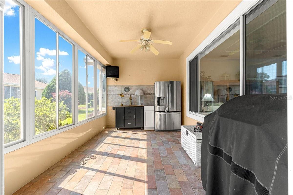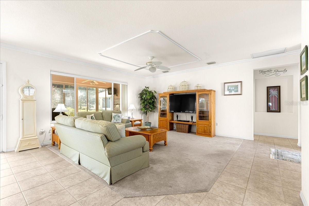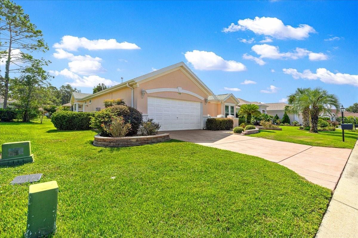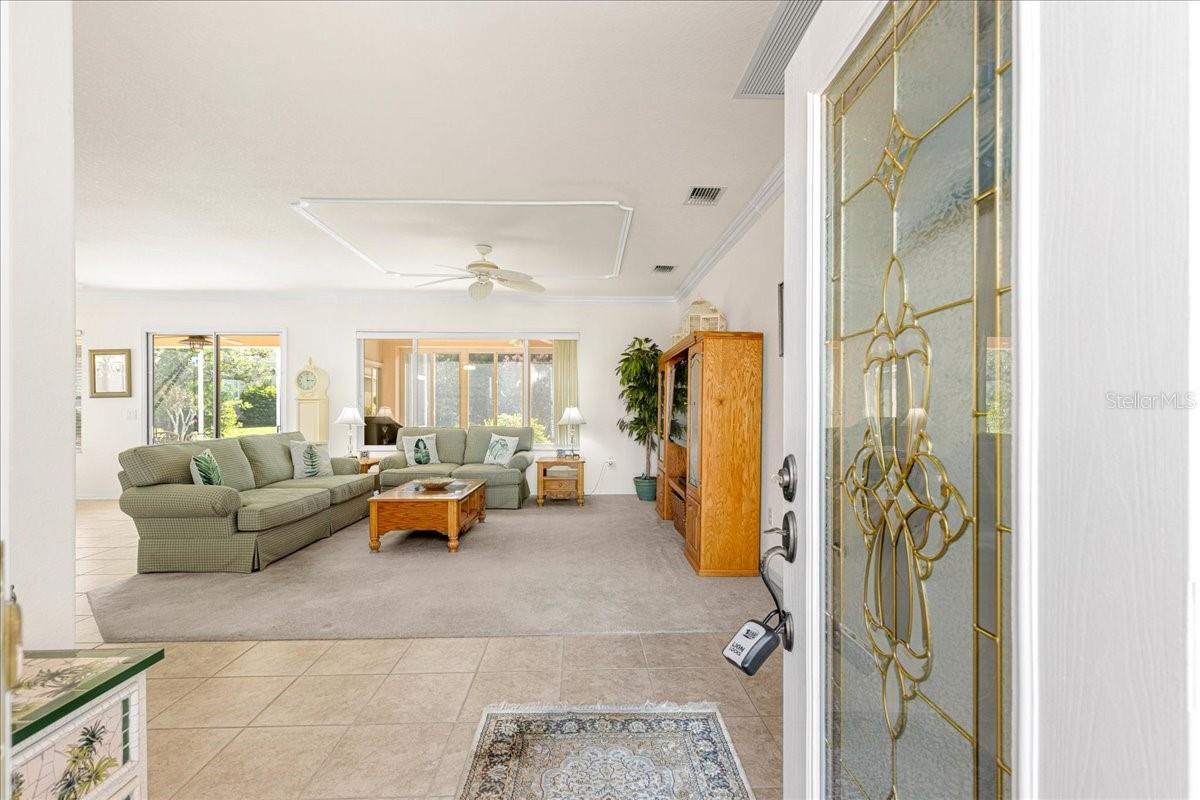 Discover this well-maintained 2 bedroom, 2 bath home plus a den in the highly sought after 55 plus premier golf community of Del Webb Spruce Creek Golf & Country Club. This stunning Madeira floor plan offers exceptional curb appeal with a stained driveway, stacked-stone landscape walls, and a welcome and inviting courtyard entry leading to an elegant leaded glass entry door. Step inside to find touches such as crown molding and plantation shutters, adding sophistication to every room. Tile flooring graces the foyer and all wet areas, while the separate den features parquet wood flooring, making it a perfect home office or flex space. The updated kitchen is a true showstopper, boasting white cabinetry, glass tile backsplash, Corian countertops, newer stainless-steel appliances, recessed lighting, and pendant lighting above the breakfast bar, while above-cabinet recipe windows allow for added light. Enjoy anytime dining in the breakfast nook with a charming bow window. The inside laundry and garage have added overhead storage. The spacious primary suite includes crown molding, plush carpet, a large walk-in closet, and a bow window for added space. The updated ensuite bath includes stone wainscoting, dual raised sinks, and a walk-in shower. The guest bedroom and bath are equally impressive, with crown molding and updates that include stone accents, a raised sink, and a therapeutic soaking tub. Additional highlights include extended garage for extra storage and housing the HVAC system, a tankless water heater for efficiency, and re-shingled roof in 2022. Designed for entertaining, the open floor plan flows seamlessly to the split Lania with one side having an expansive birdcage overlooking the well-landscaped backyard allowing for some privacy, while the other side is an enclosed lanai with a bonus second refrigerator and television. Furniture is available for purchase as a separate package. Enjoy resort-style living with golf, pools, fitness, dining, and endless activities in one of Florida’s premier active adult communities.
