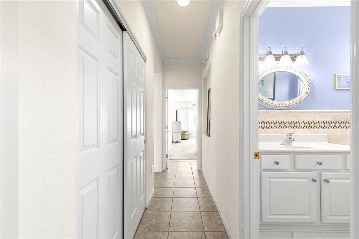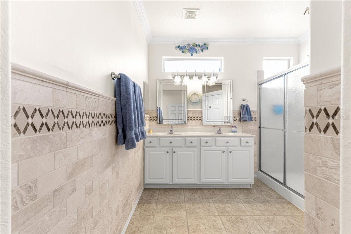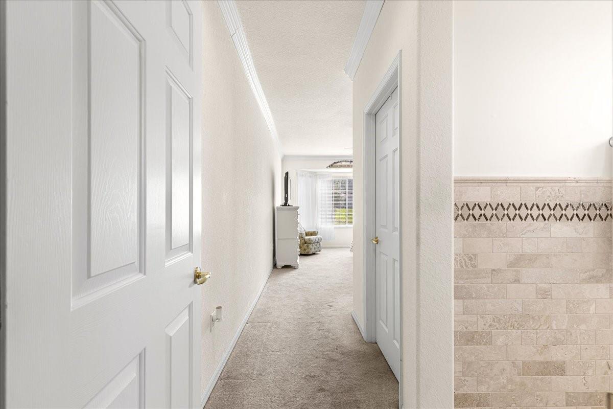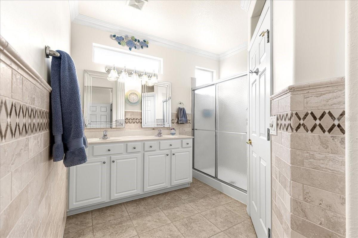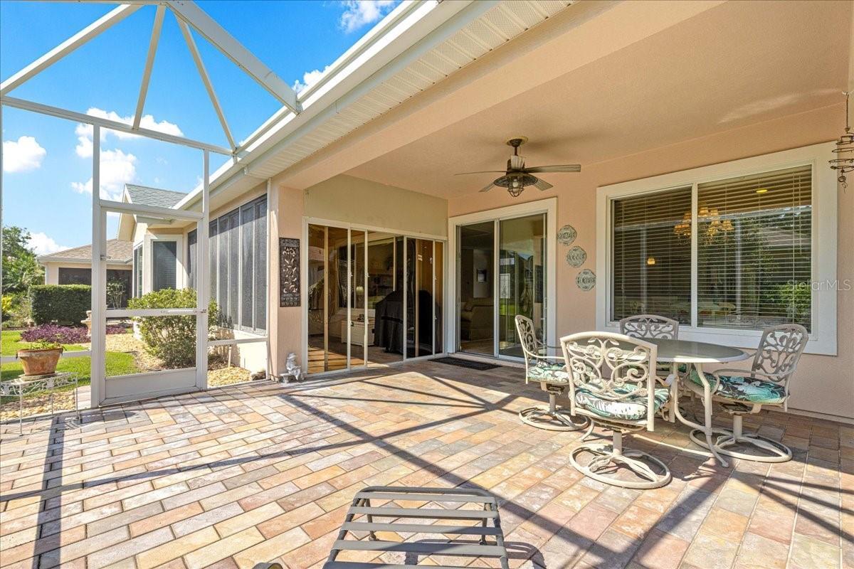 Discover this well-maintained 2 bedroom, 2 bath home plus a den in the highly sought after 55 plus premier golf community of Del Webb Spruce Creek Golf & Country Club. This stunning Madeira floor plan offers exceptional curb appeal with a stained driveway, stacked-stone landscape walls, and a welcome and inviting courtyard entry leading to an elegant leaded glass entry door. Step inside to find touches such as crown molding and plantation shutters, adding sophistication to every room. Tile flooring graces the foyer and all wet areas, while the separate den features parquet wood flooring, making it a perfect home office or flex space. The updated kitchen is a true showstopper, boasting white cabinetry, glass tile backsplash, Corian countertops, newer stainless-steel appliances, recessed lighting, and pendant lighting above the breakfast bar, while above-cabinet recipe windows allow for added light. Enjoy anytime dining in the breakfast nook with a charming bow window. The inside laundry and garage have added overhead storage. The spacious primary suite includes crown molding, plush carpet, a large walk-in closet, and a bow window for added space. The updated ensuite bath includes stone wainscoting, dual raised sinks, and a walk-in shower. The guest bedroom and bath are equally impressive, with crown molding and updates that include stone accents, a raised sink, and a therapeutic soaking tub. Additional highlights include extended garage for extra storage and housing the HVAC system, a tankless water heater for efficiency, and re-shingled roof in 2022. Designed for entertaining, the open floor plan flows seamlessly to the split Lania with one side having an expansive birdcage overlooking the well-landscaped backyard allowing for some privacy, while the other side is an enclosed lanai with a bonus second refrigerator and television. Furniture is available for purchase as a separate package. Enjoy resort-style living with golf, pools, fitness, dining, and endless activities in one of Florida’s premier active adult communities.