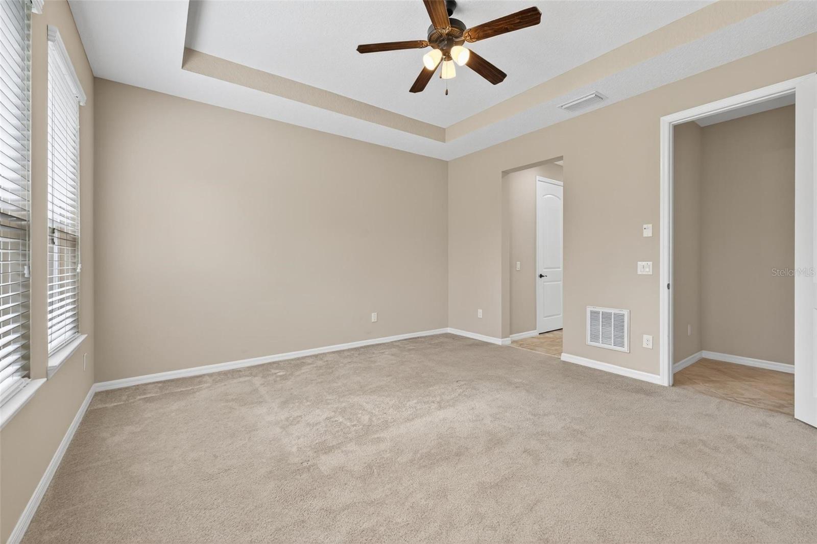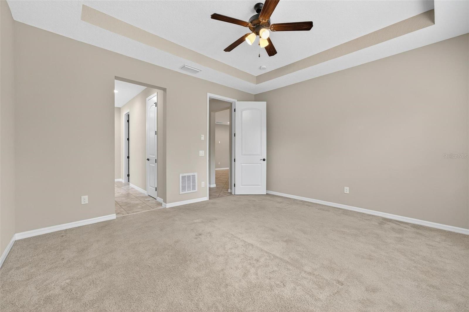 - High Ceilings, Kitchen/Family Room Combo, Open Floorplan, Primary Bedroom Main Floor, Solid Wood Cabinets, Stone Counters, Thermostat, Tray Ceiling(s), Walk-In Closet(s)