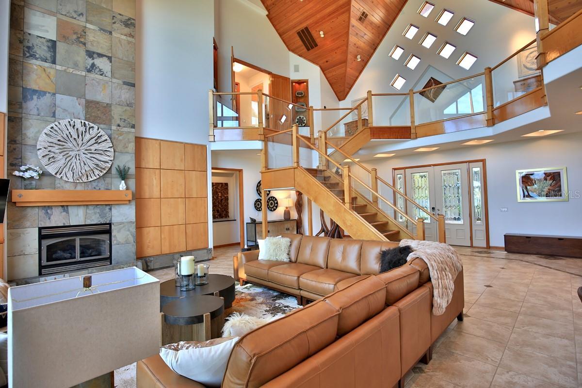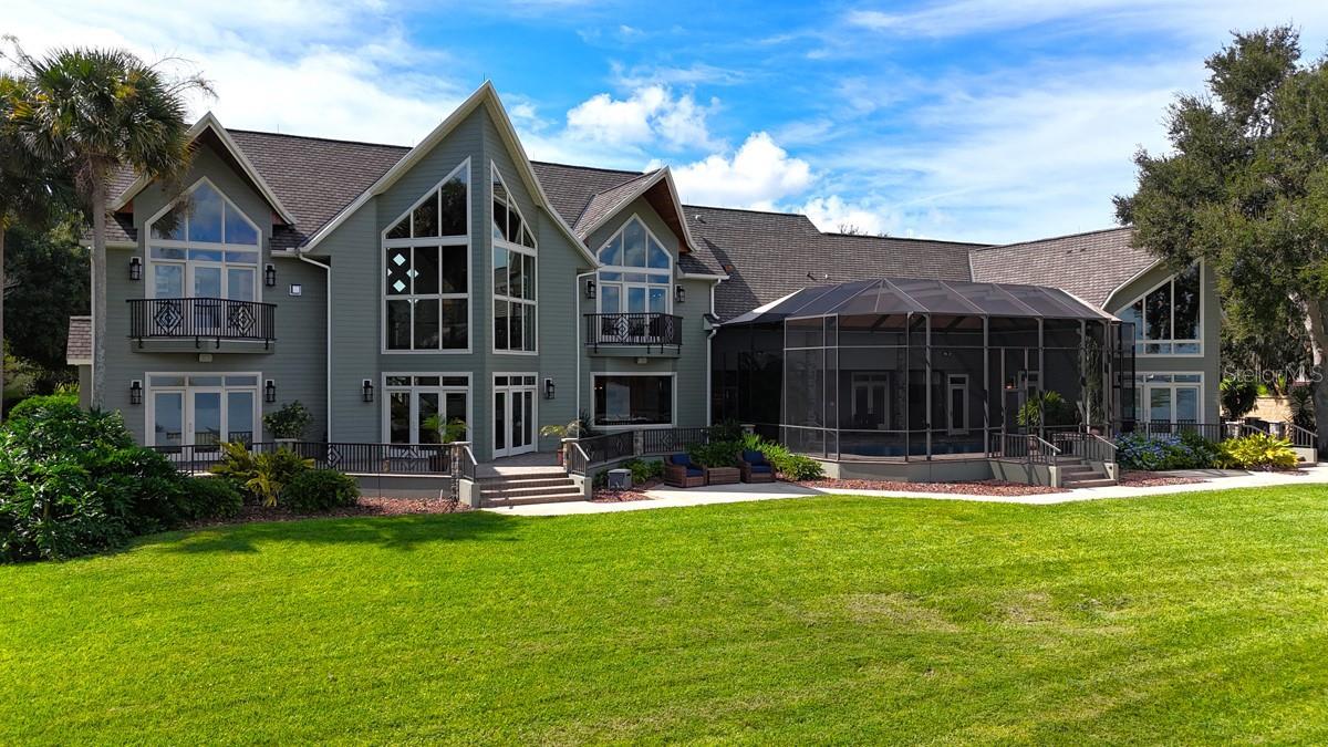Your Dream Home at Sunset Harbor Boulevard! Welcome to an extraordinary waterfront estate like no other! Nestled on over 3 private, pristine acres, this luxury residence greets you with a gated, winding driveway leading to a stunning paver portico, complete with tongue and groove ceilings and a built-in surround sound system that fills the entire home with music. As you enter through the impressive double doors, prepare to be captivated by breathtaking lake views and an expansive open floor plan accentuated by floor-to-ceiling glass windows in the great room, a custom grand staircase, and a striking gas fireplace. With over 200 feet of picturesque lake frontage, this home is truly a waterfront paradise. Culinary enthusiasts will love the chef-inspired kitchen featuring premium appliances, generous cabinet and counter space, and a cozy eat-in nook offering panoramic views. The primary suite serves as a tranquil retreat with stunning lake views, a private sitting balcony, and a luxurious bathroom that includes a walk-in shower and a relaxing garden tub. With four bedrooms on the main level and two additional upstairs—each with its own bathroom—this layout ensures privacy for everyone. A dedicated office space is perfect for those working from home, while the upstairs game room, complete with a half bath and built-in bar, is ideal for entertainment. Don't miss the state-of-the-art theater room, perfect for movie nights or cozy gatherings. Step outside to the beautifully screened pool area, complete with an entertainer's bar that overlooks the tranquil lake and a custom outdoor bar—perfect for summer afternoons with friends. The property also features a guest house or in-law suite with its own entrance, kitchen, and living area, offering privacy and comfort for guests. The waterfront amenities include a private sandy beach, boathouse with storage for paddleboards and kayaks, double boat lifts, and jet ski lifts for easy access to the lake. Enjoy nearby dining at Gator Joe's or Eaton's Beach, both popular lakeside spots. Located close to the numerous amenities offered by The Villages, including shopping, dining, and medical facilities, this residence is a must-see. Contact us today to arrange your visit and experience firsthand a home that will resonate with you from the moment you arrive!
