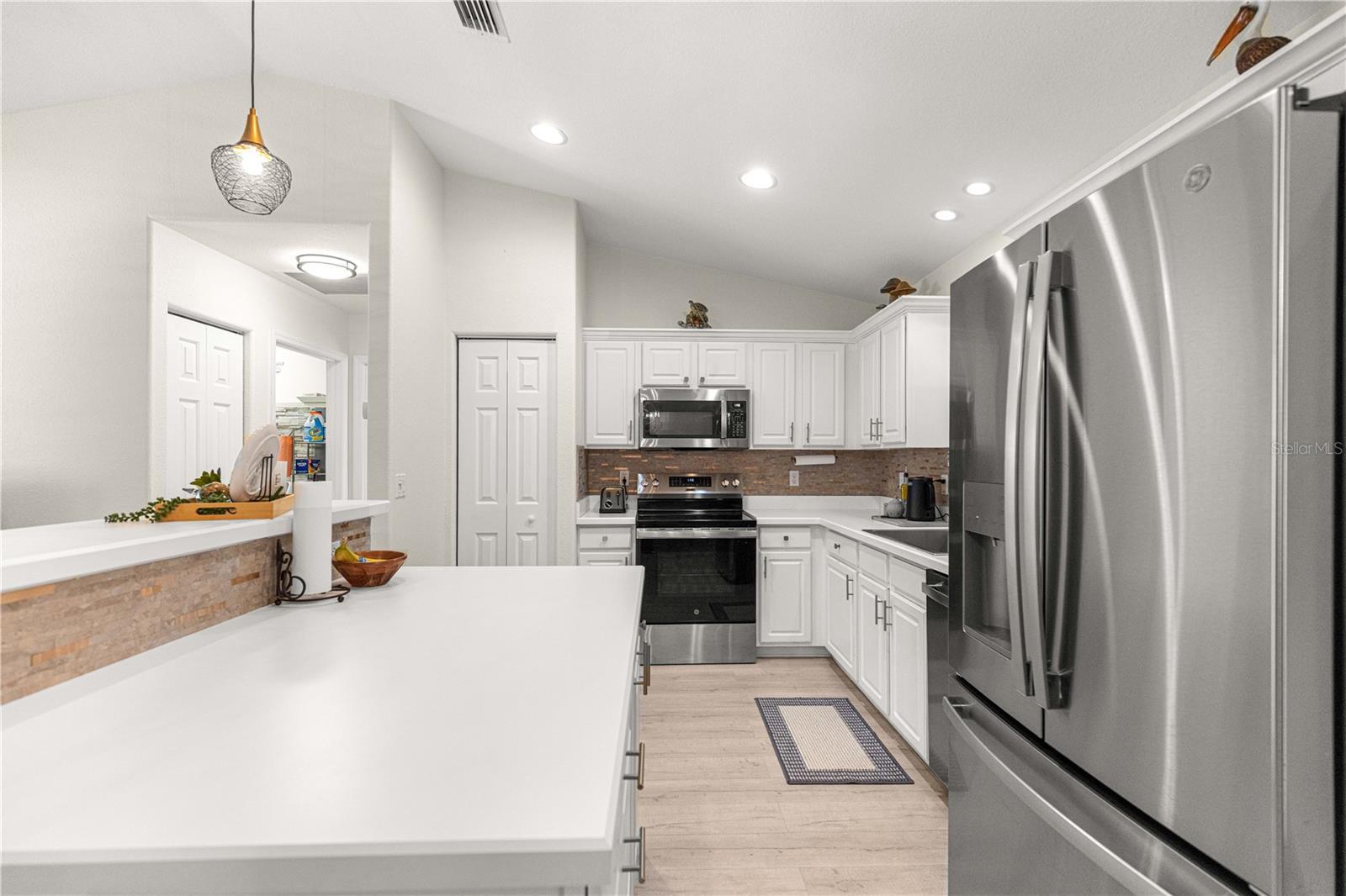 Welcome to this beautifully maintained and thoughtfully updated 2 bedroom, 2 bath Chesapeake floor plan. Located in the highly desirable 55+ Del Webb Spruce Creek Golf & Country Club. This stucco home offers 1,555 sq. ft. of living space, including the light filled Florida room, perfect for relaxing or entertaining. From the moment you arrive, you’ll notice the outstanding curb appeal, complete with a painted driveway and walkway, updated landscaping with concrete curbing, and a corner lot setting. Inside, the open floor plan is enhanced by a vaulted ceiling, recessed lighting, fresh interior paint, and a split floor plan. Interior highlights include Luxury vinyl plank flooring throughout (guest bedroom carpeted for comfort), newly purchased stainless steel appliances, plus washer and dryer (2025). White cabinetry with pull-outs, tiled back splash, and large farm style sink in the kitchen. Updated bathrooms, including an en-suite with a beautiful walk-in shower and new fixtures. Plantation shutters, updated lighting, and ceiling fans throughout, The primary suite features a bow window for added space, plus a large walk-in closet with custom organizers. Enjoy seamless entertaining with the open Florida room, kitchen pass-through, and a private outdoor patio-perfect for morning coffee, grilling out, or evening gatherings. Major updates for peace of mind are roofing re-shingled (2022) HVAC (2013), and new gutters with leaf guards (2025) for low-maintenance living. This home combines modern updates with a highly functional layout, all within a vibrant community offering golf, recreation, and endless amenities.