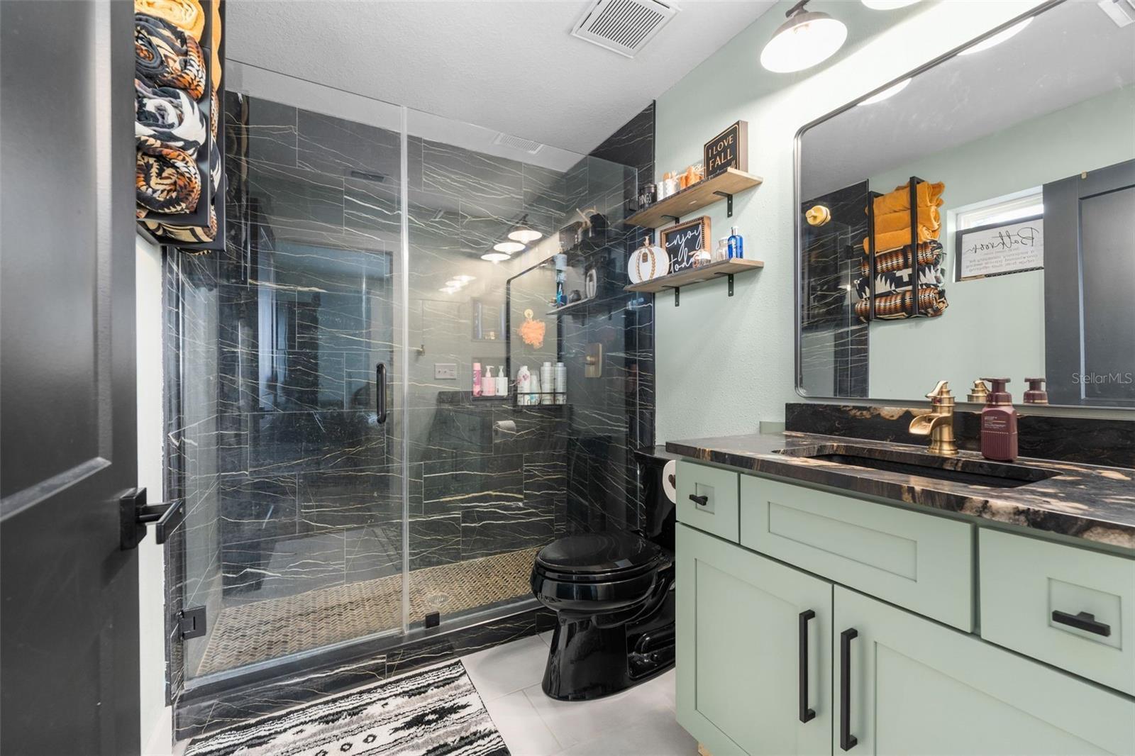 - Cathedral Ceiling(s), Ceiling Fans(s), High Ceilings, Kitchen/Family Room Combo, Primary Bedroom Main Floor, Solid Surface Counters, Solid Wood Cabinets, Split Bedroom, Stone Counters, Thermostat, Vaulted Ceiling(s), Walk-In Closet(s)