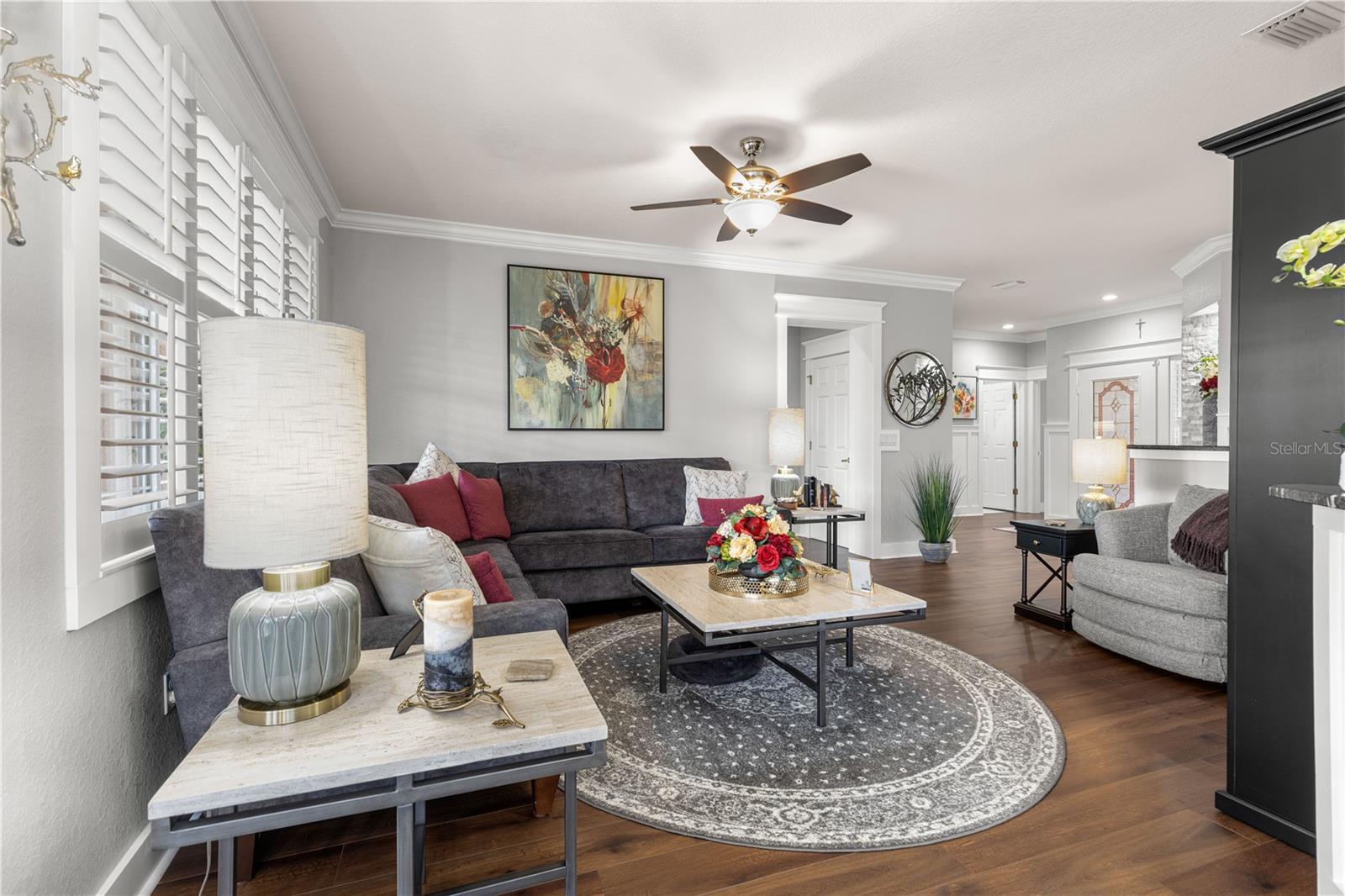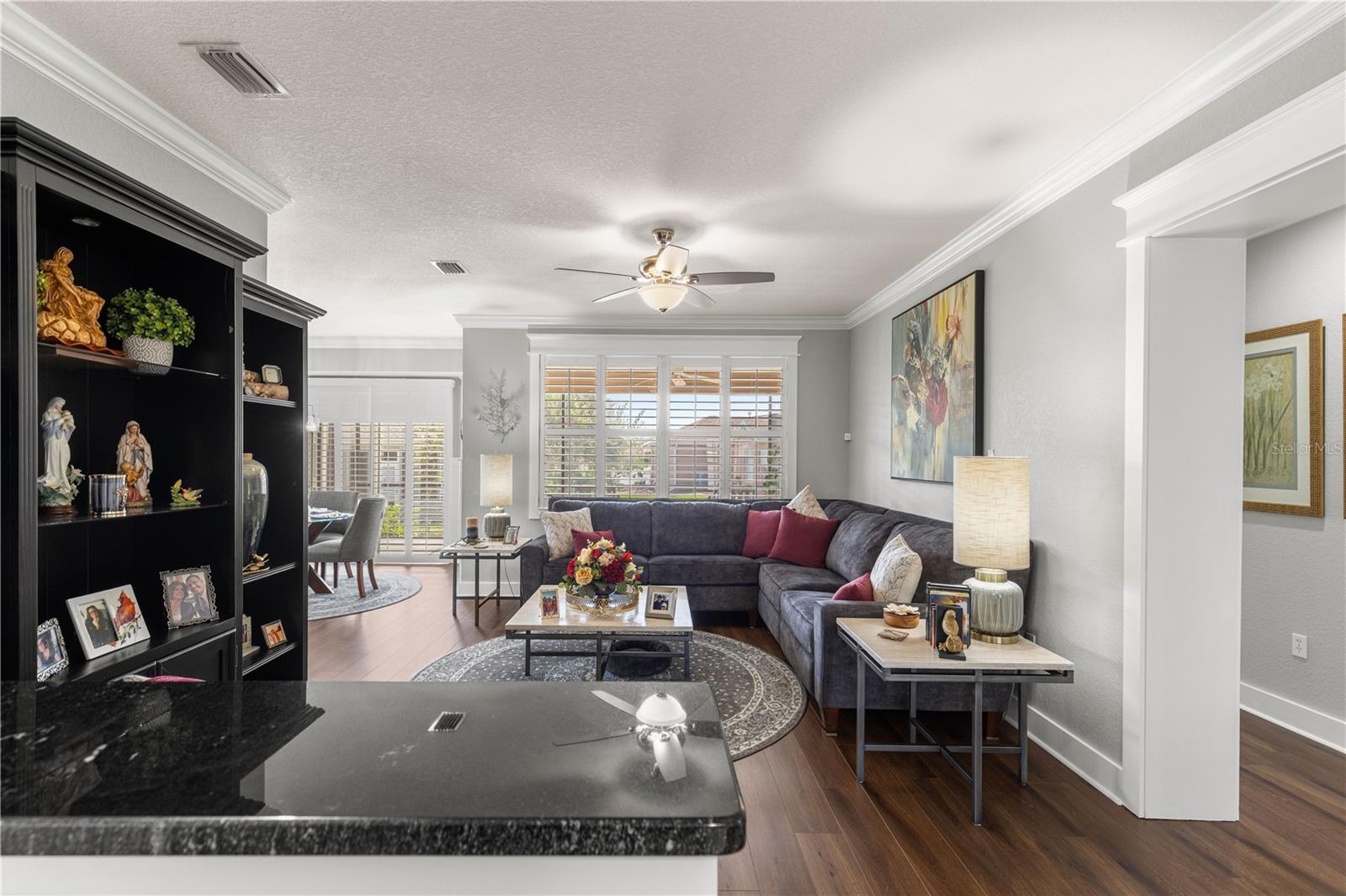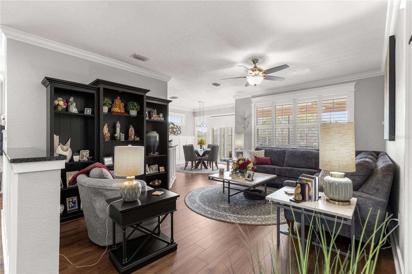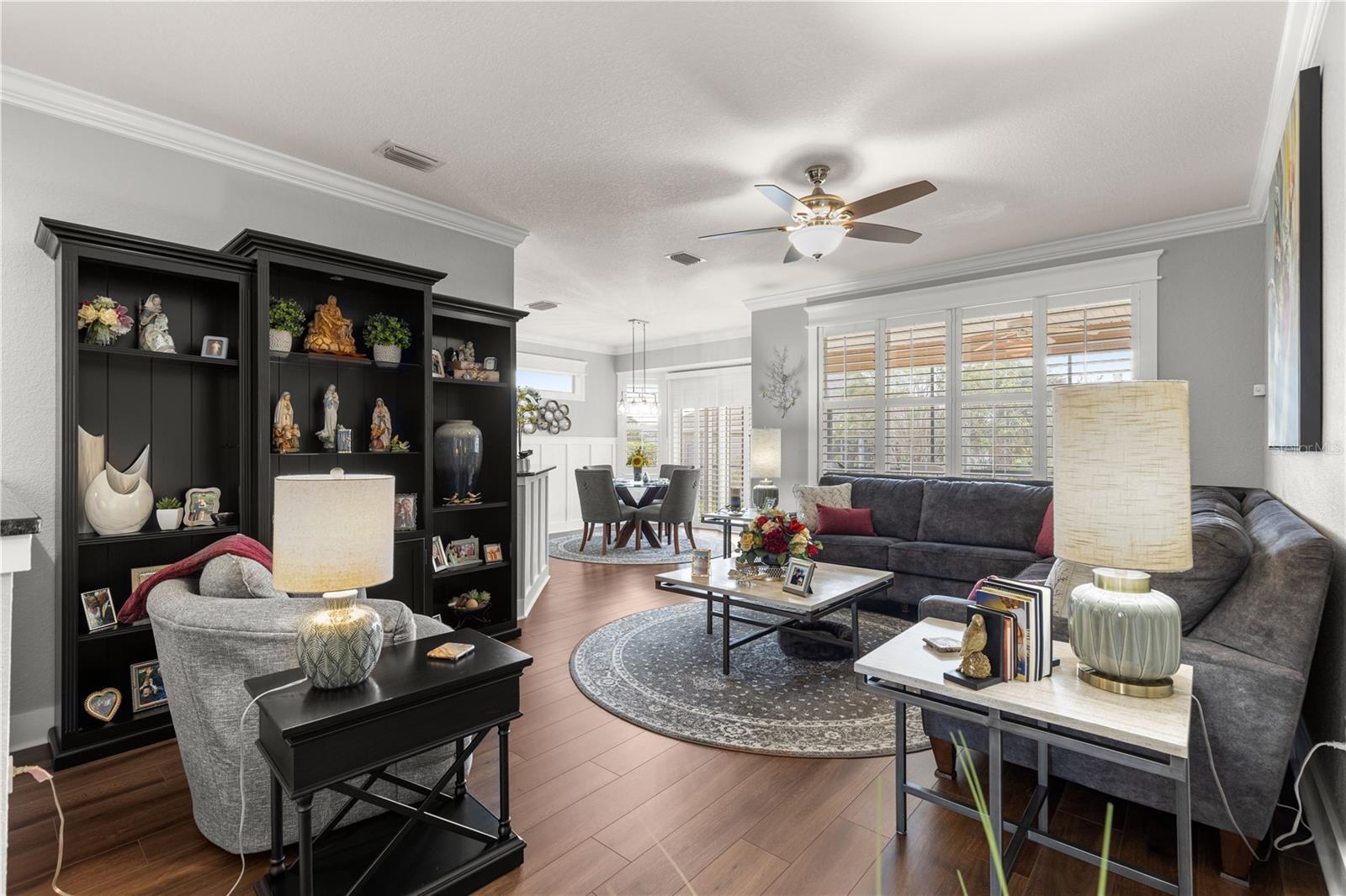 - Built-in Features, Ceiling Fans(s), Chair Rail, Crown Molding, Eat-in Kitchen, High Ceilings, In Wall Pest System, Kitchen/Family Room Combo, Living Room/Dining Room Combo, Open Floorplan, Primary Bedroom Main Floor, Solid Wood Cabinets, Stone Counters, Thermostat, Walk-In Closet(s), Window Treatments