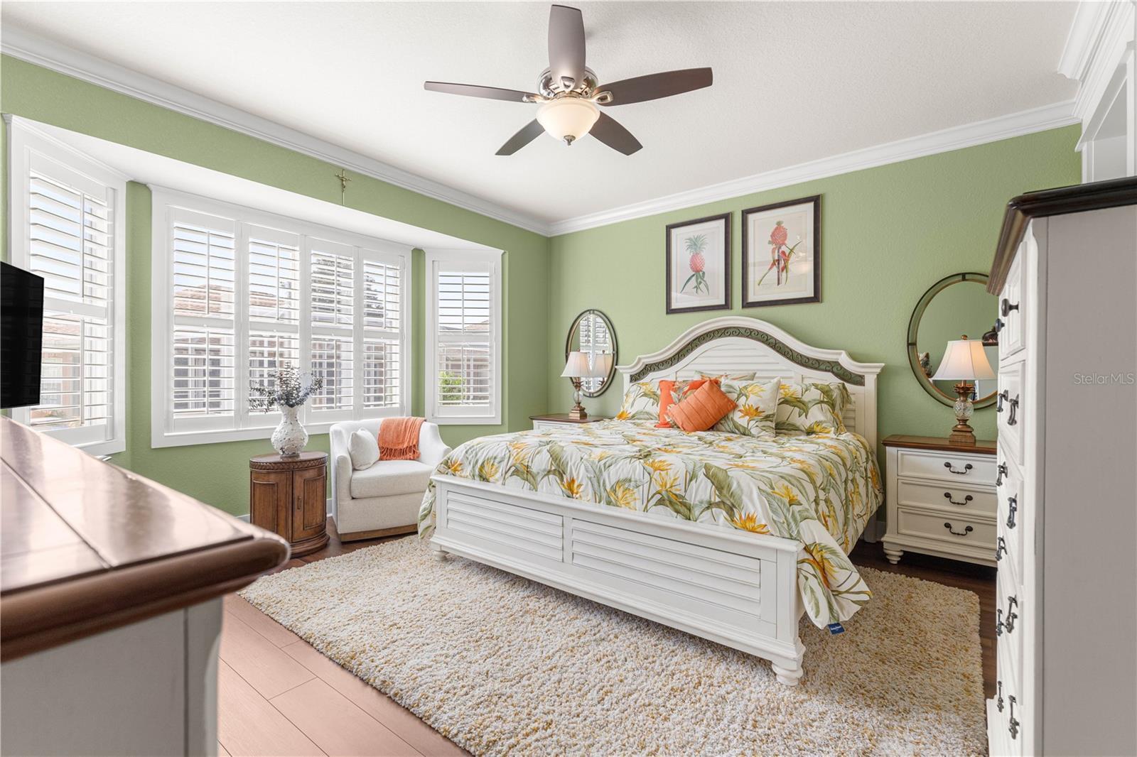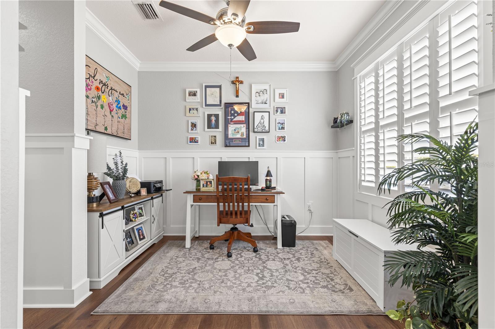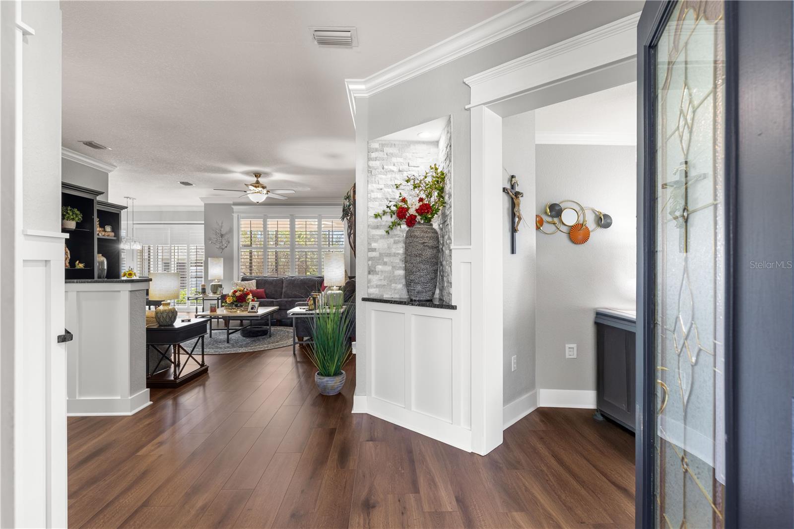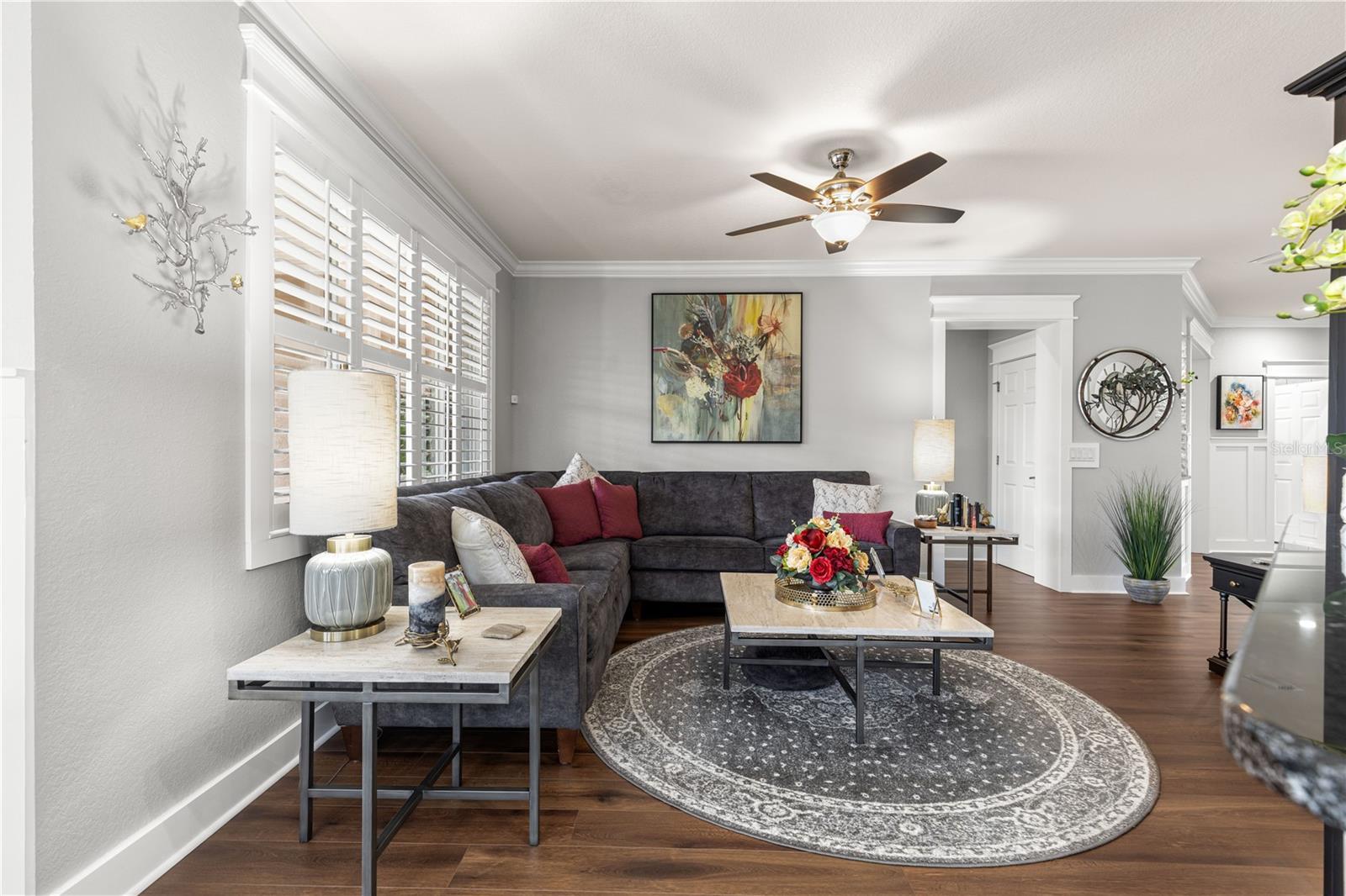 - Built-in Features, Ceiling Fans(s), Chair Rail, Crown Molding, Eat-in Kitchen, High Ceilings, In Wall Pest System, Kitchen/Family Room Combo, Living Room/Dining Room Combo, Open Floorplan, Primary Bedroom Main Floor, Solid Wood Cabinets, Stone Counters, Thermostat, Walk-In Closet(s), Window Treatments
