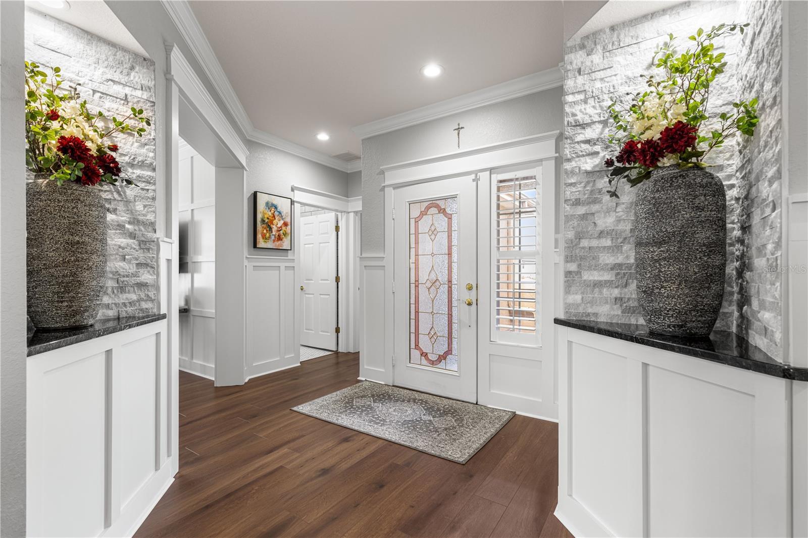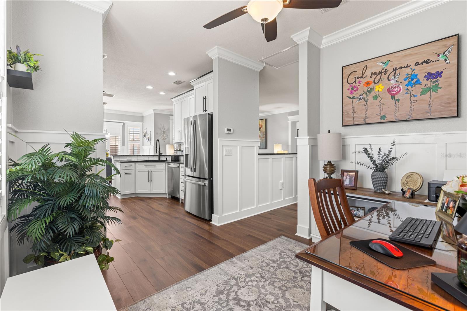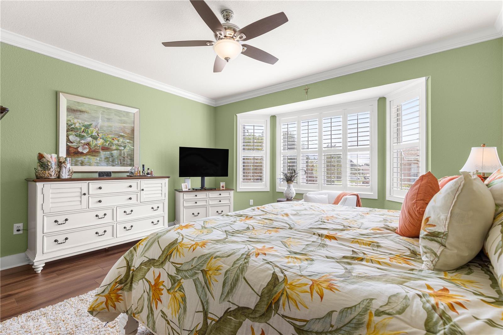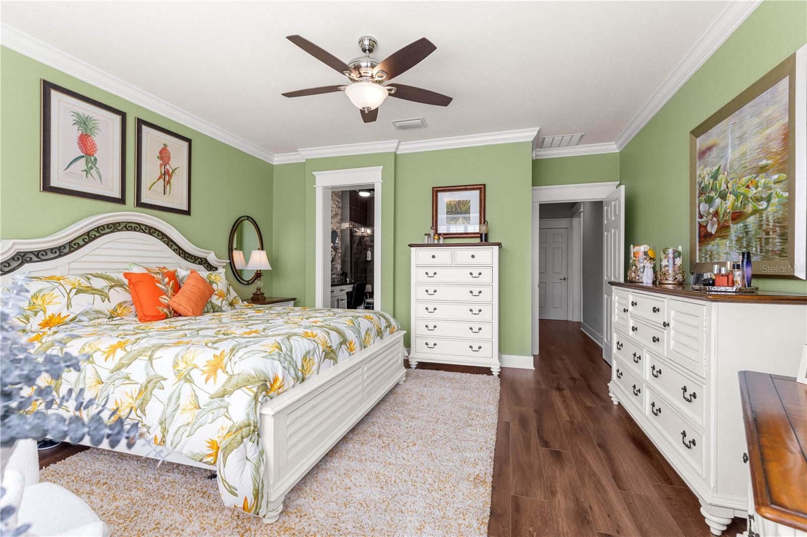 - Built-in Features, Ceiling Fans(s), Chair Rail, Crown Molding, Eat-in Kitchen, High Ceilings, In Wall Pest System, Kitchen/Family Room Combo, Living Room/Dining Room Combo, Open Floorplan, Primary Bedroom Main Floor, Solid Wood Cabinets, Stone Counters, Thermostat, Walk-In Closet(s), Window Treatments