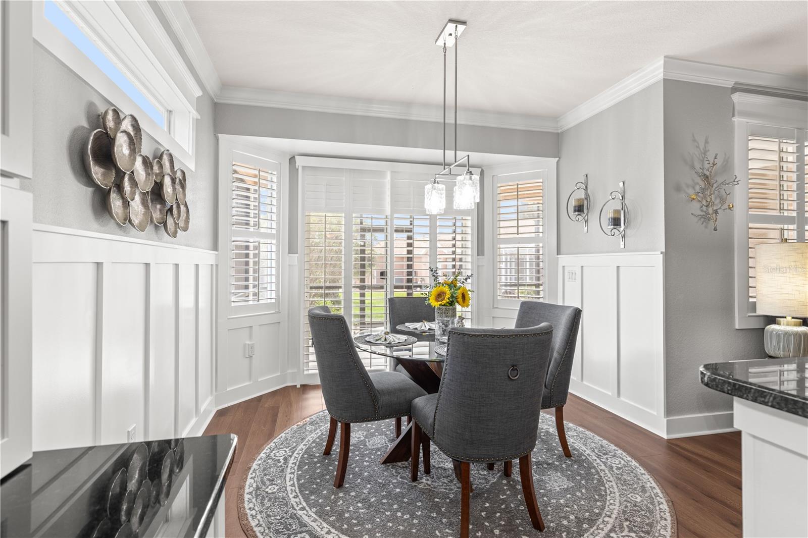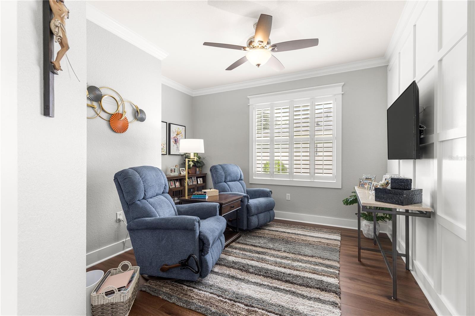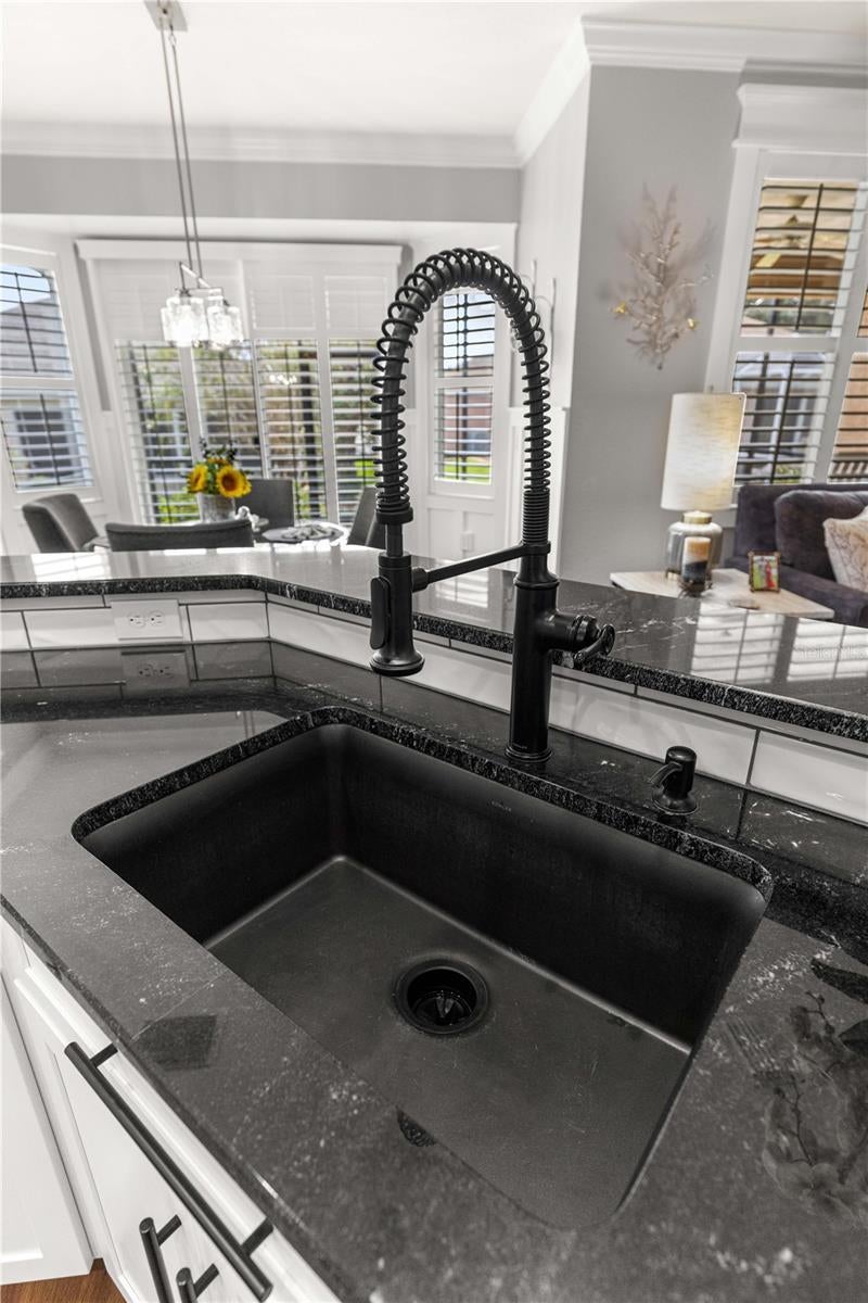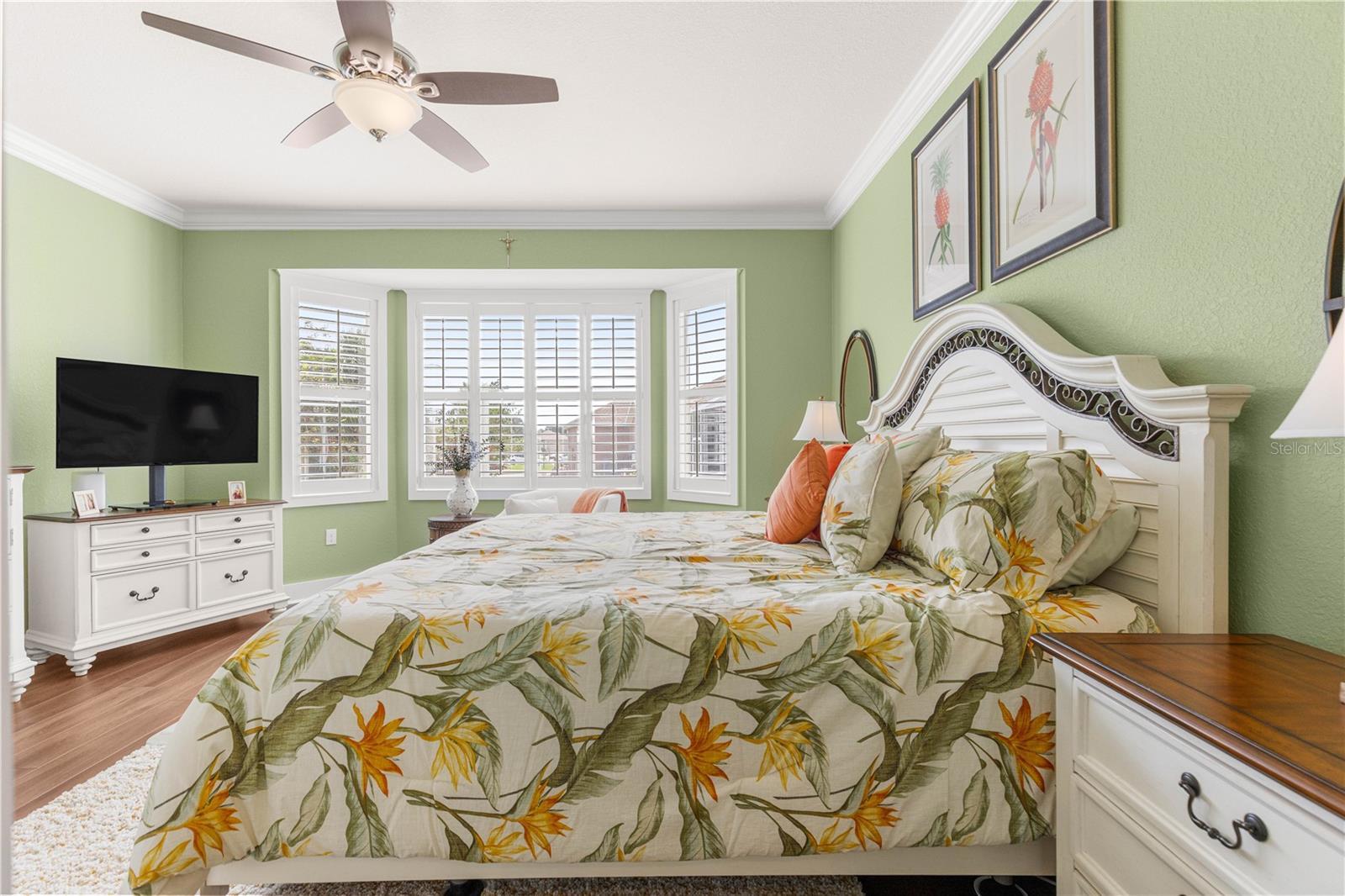 - Built-in Features, Ceiling Fans(s), Chair Rail, Crown Molding, Eat-in Kitchen, High Ceilings, In Wall Pest System, Kitchen/Family Room Combo, Living Room/Dining Room Combo, Open Floorplan, Primary Bedroom Main Floor, Solid Wood Cabinets, Stone Counters, Thermostat, Walk-In Closet(s), Window Treatments