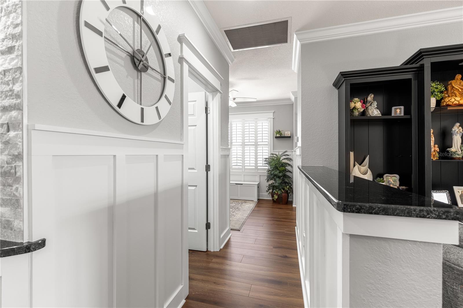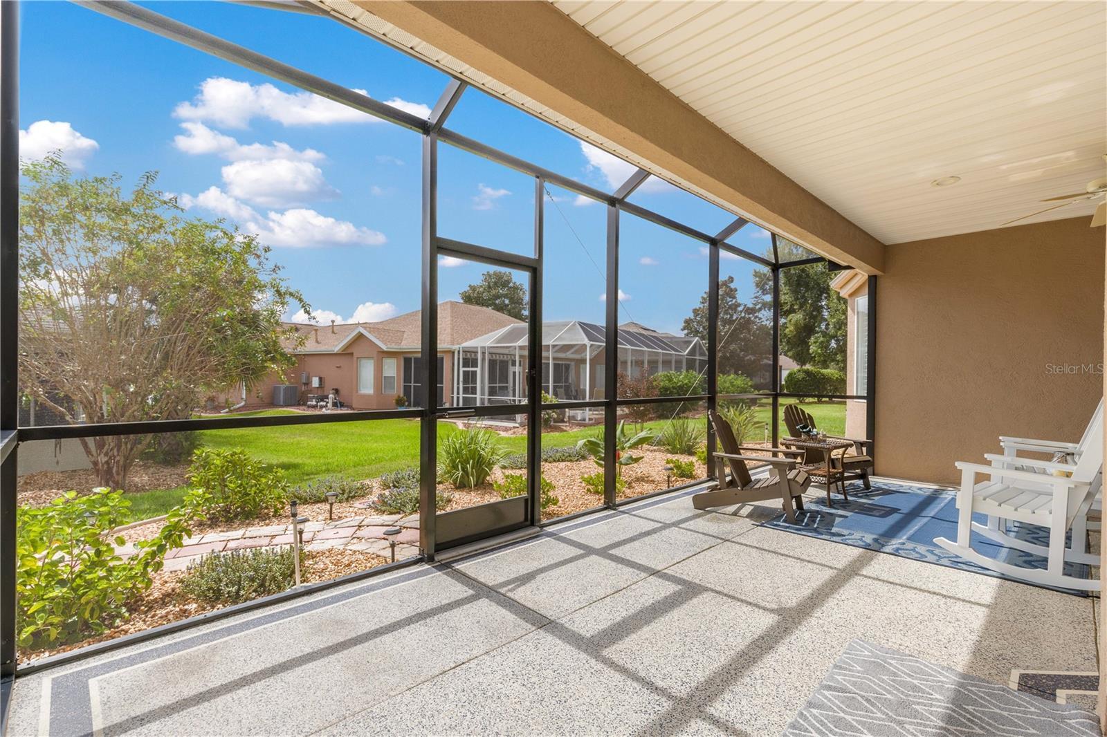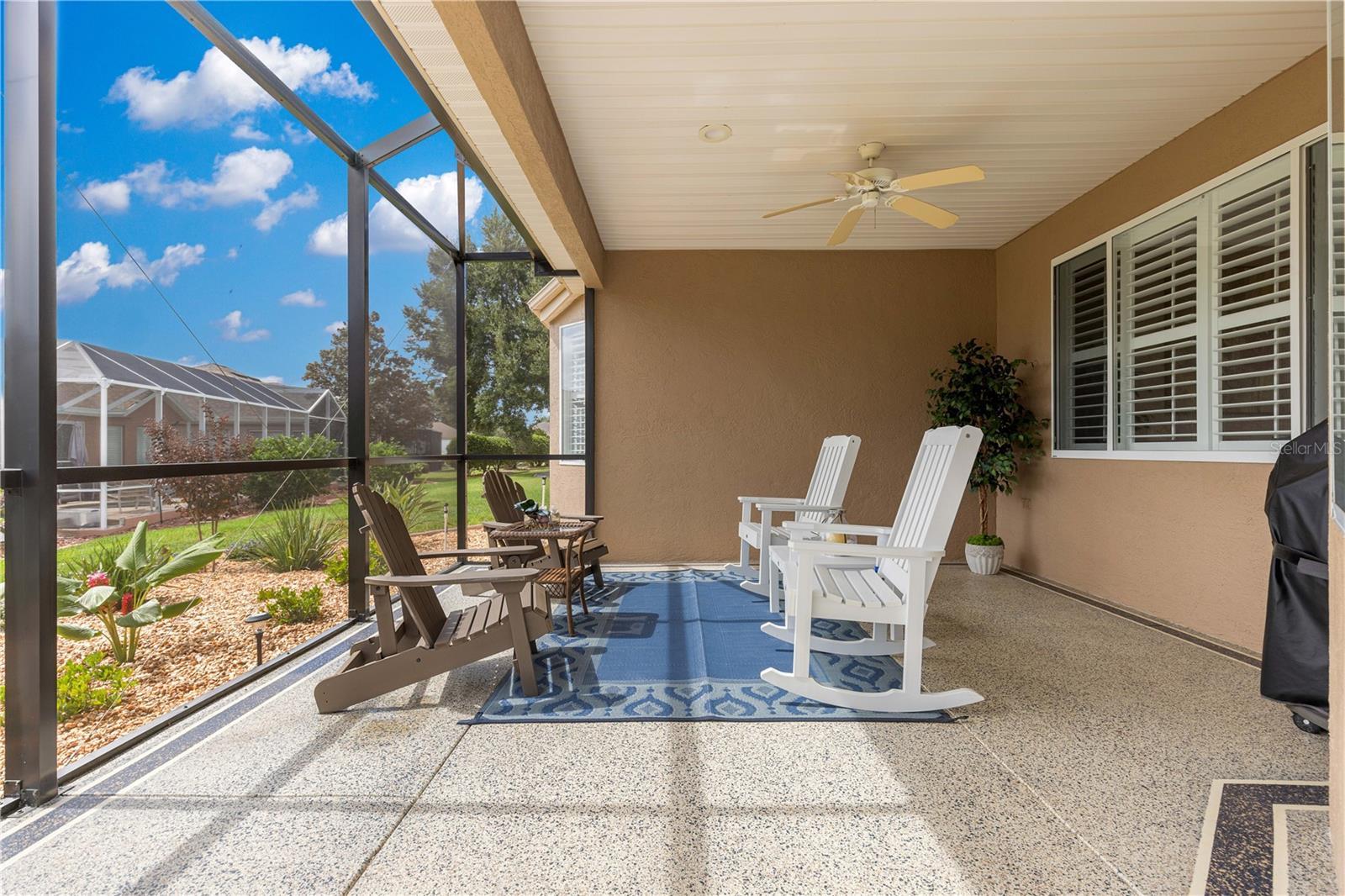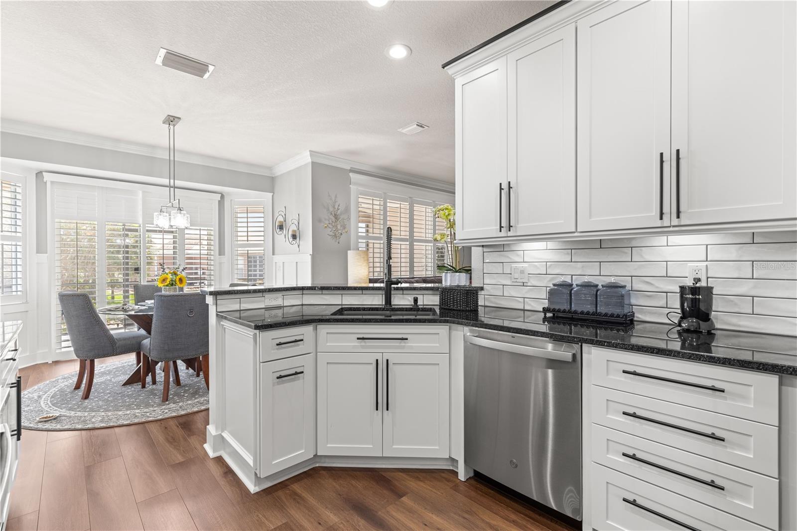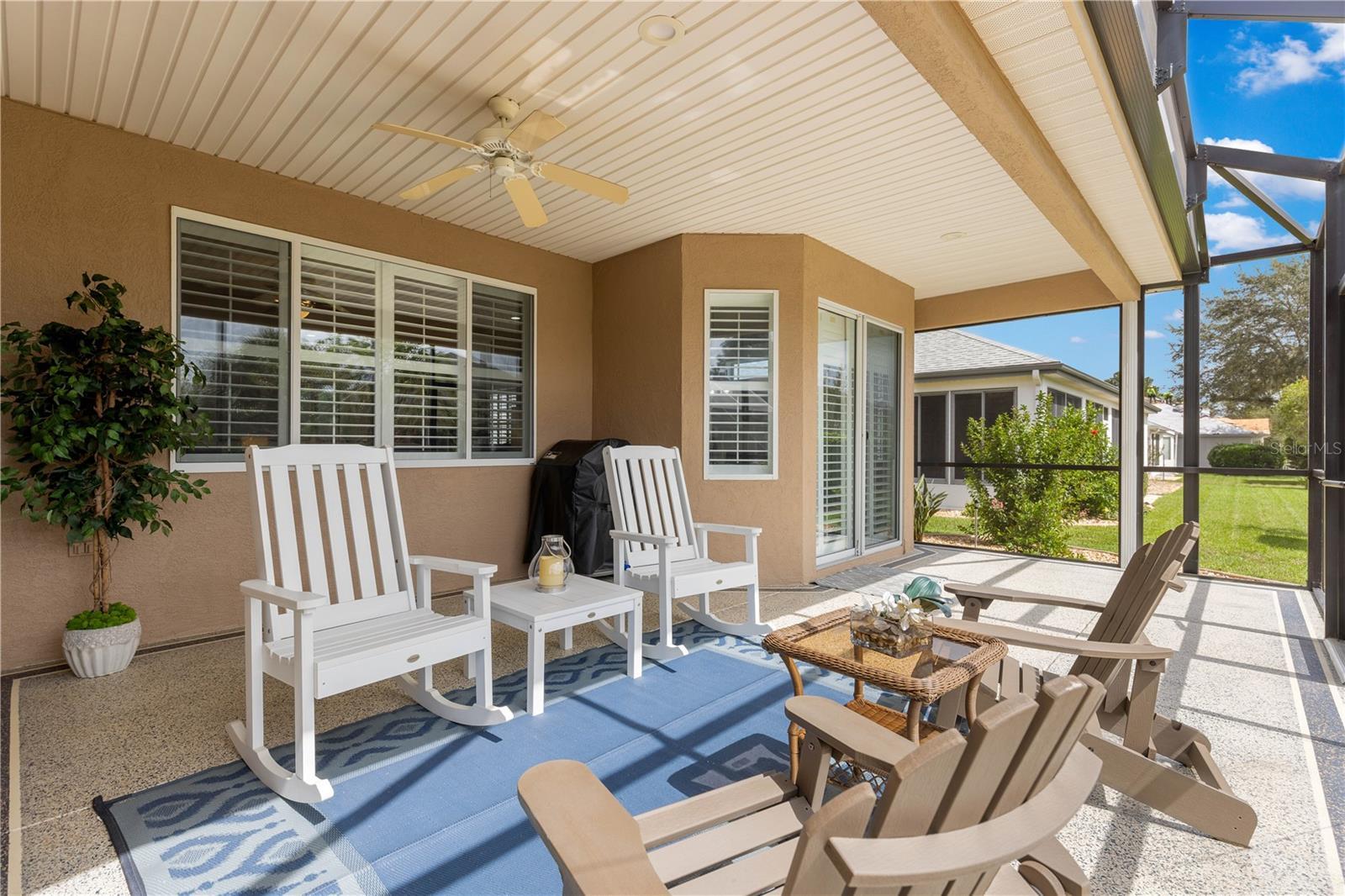The craftsmanship is seamless and impeccable— you have to see this home in person! Located in the highly sought-after Del Webb Spruce Creek community, this beautifully updated 2 Bedroom, 2 Bathroom home has been meticulously enhanced from 2023 through 2025, offering a truly move-in-ready retreat filled with style and quality. Step inside to find luxury vinyl flooring throughout, designer finishes, and custom decorative trim, crown molding, and plantation shutters that add timeless elegance. The updated kitchen (2023) boasts KraftMaid soft-close cabinetry with roller shelving and kick drawers, granite countertops, a deep sink with designer faucet, and a full suite of stainless steel appliances. The bonus flex room (perfect as an office or third bedroom) showcases batten wall detailing and upgraded lighting with dimmers for added ambiance. The primary suite feels like a private sanctuary with its 2023 spa-style bathroom featuring a white KraftMaid vanity with makeup area, granite counters, decorative tile shower, and updated mirrors, lighting, and remote fan. The walk-in closet includes custom shelving for maximum storage. The second bedroom and bath have also been completely refreshed — from rain glass shower doors to designer tile, vanity, and lighting — everything is move-in ready and beautifully done. Outside, enjoy your expanded lanai and birdcage (2023), perfect for morning coffee or evening relaxation. The home’s freshly painted exterior (2023), new landscaping (2024), updated lighting, and new front storm door (2025) create wonderful curb appeal. The garage is just as impressive with Husky storage cabinetry (2025), interlocking flooring tiles (2025), attic fans (2024), and built-in functionality. Major mechanicals bring peace of mind with a new HVAC system (2024) serviced regularly, roof (2022), and water heater (2018) — all contributing to a worry-free lifestyle. Every update has been made with care, combining comfort, beauty, and practicality. This home truly offers the best of Del Webb Living - in a vibrant, active 55+ community with resort-style amenities, 36 holes of Championship Golf, Pickleball, Tennis, Fitness Center, 3 Pools (1indoor) Shuffleboard, Horseshoes, Bocce Ball, Walking path in Wooded Area and more clubs than you can imagine!!!!