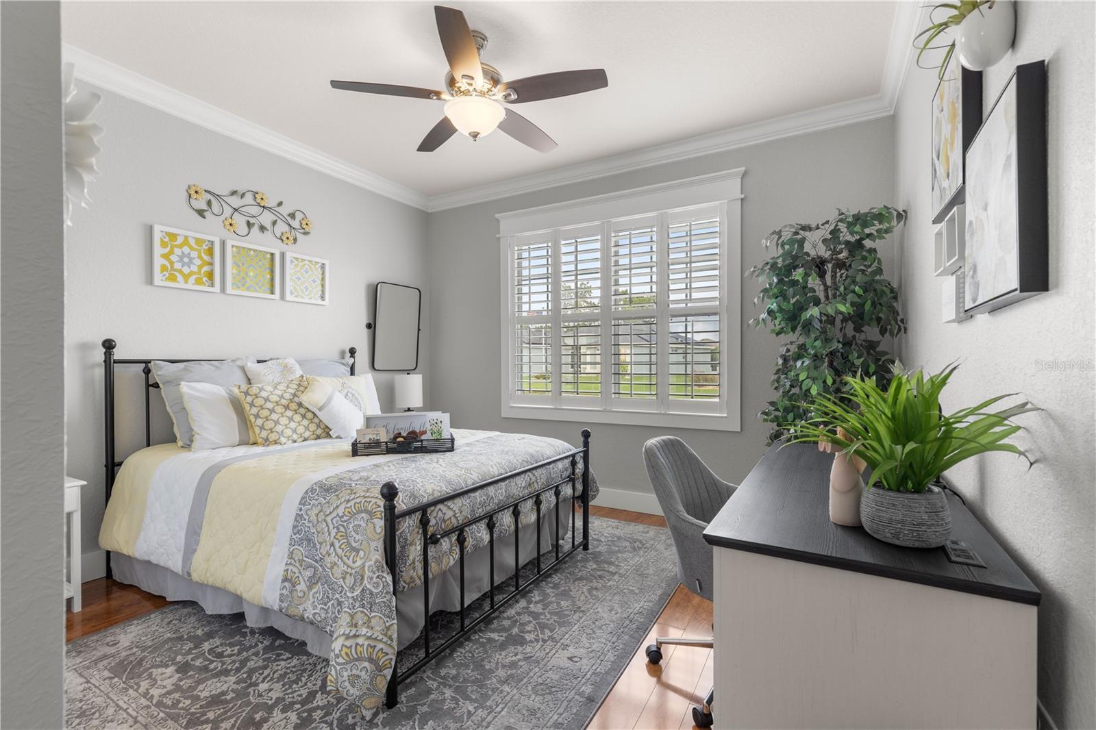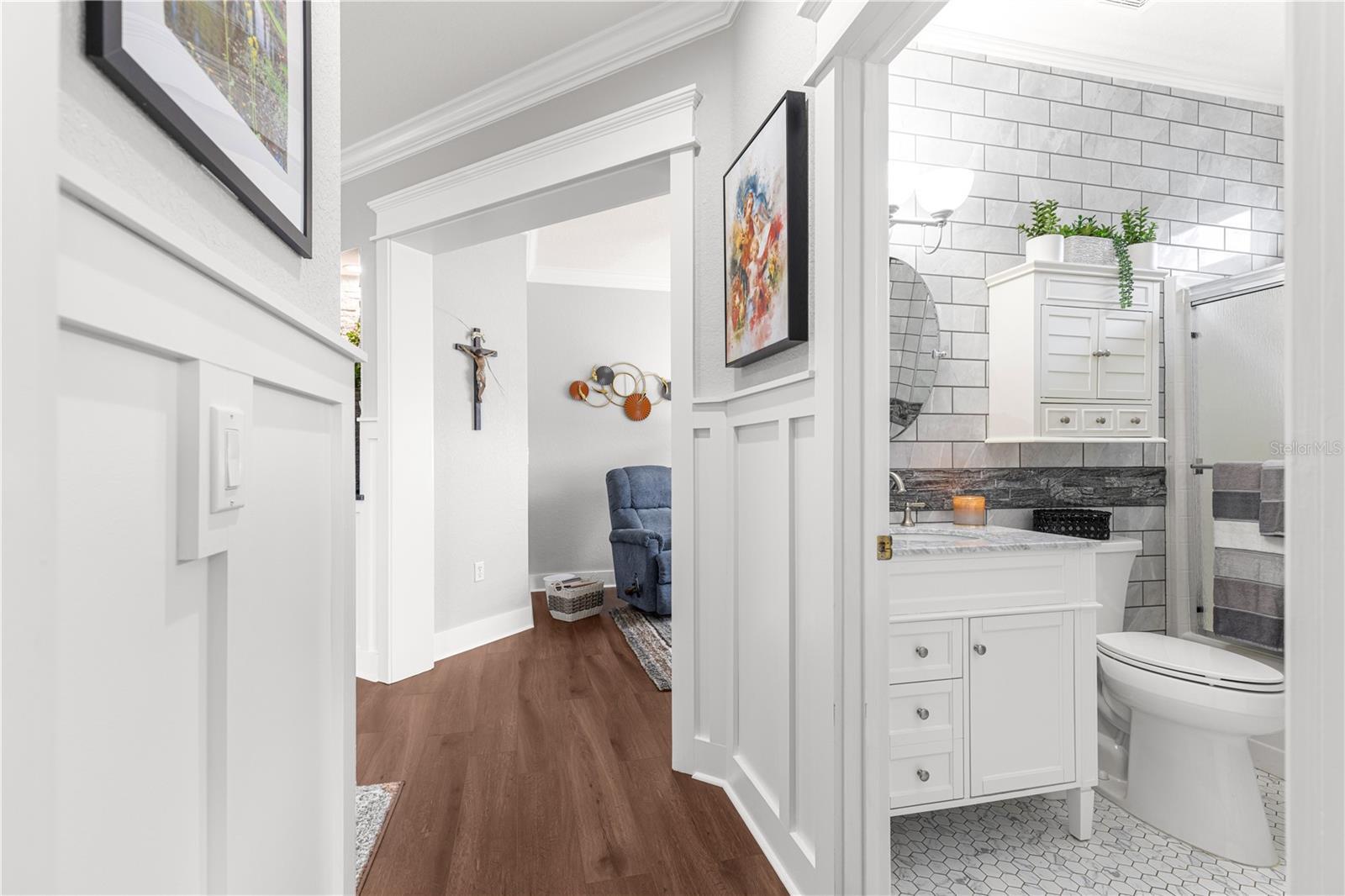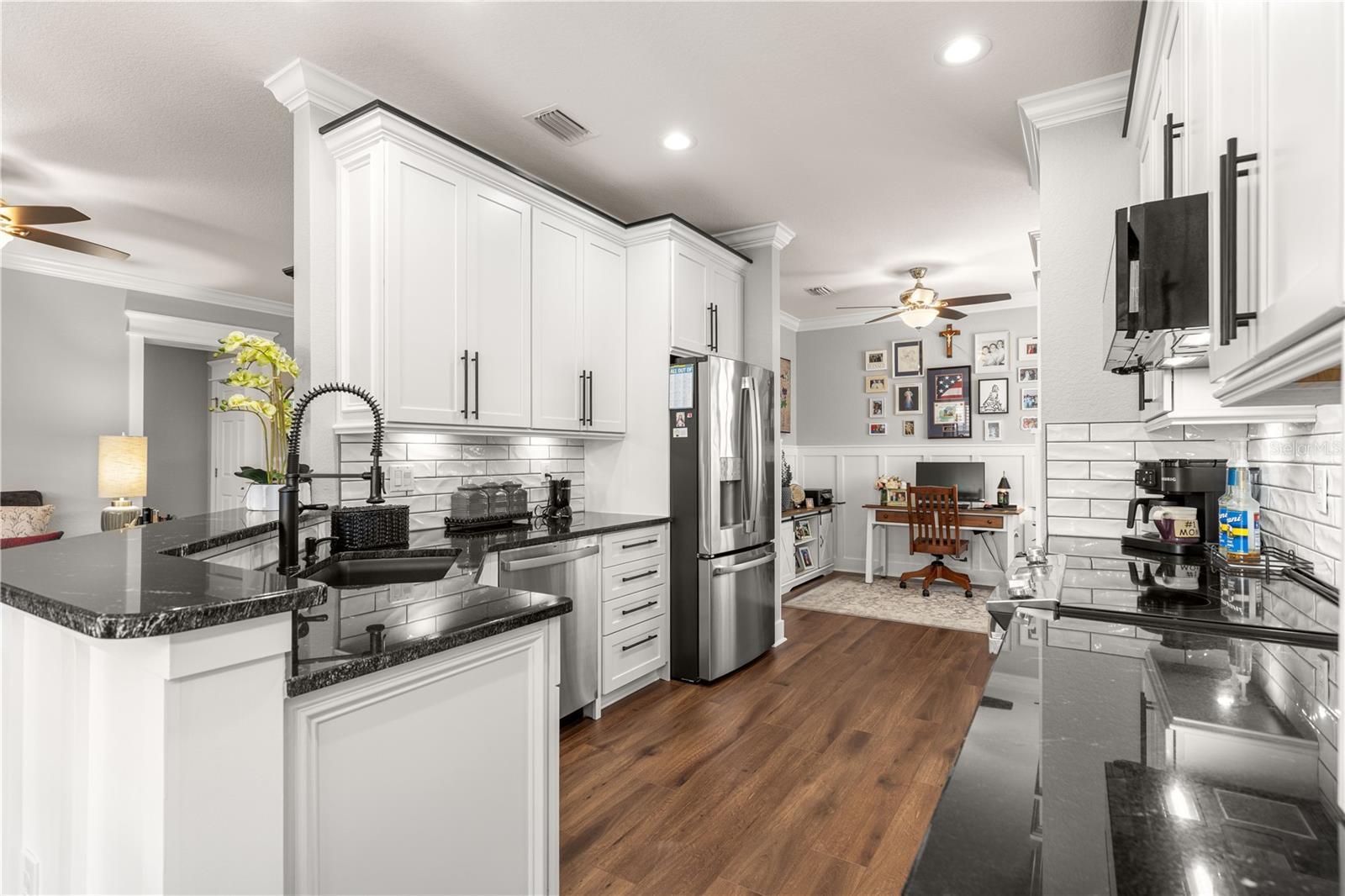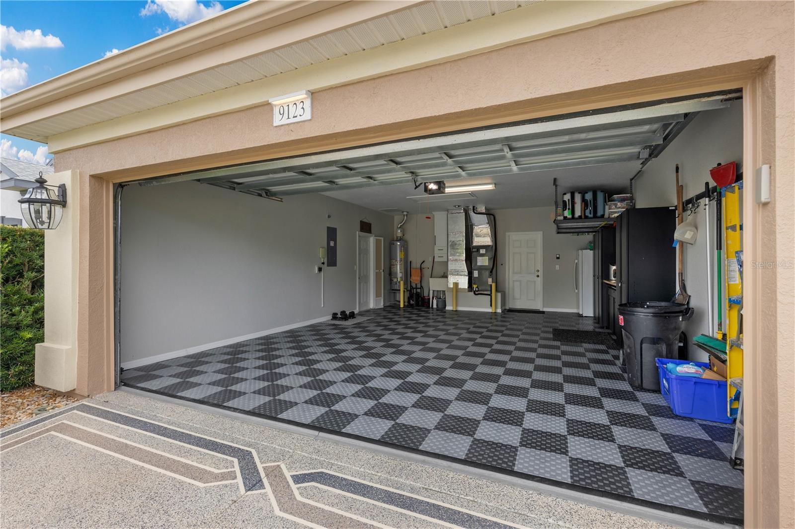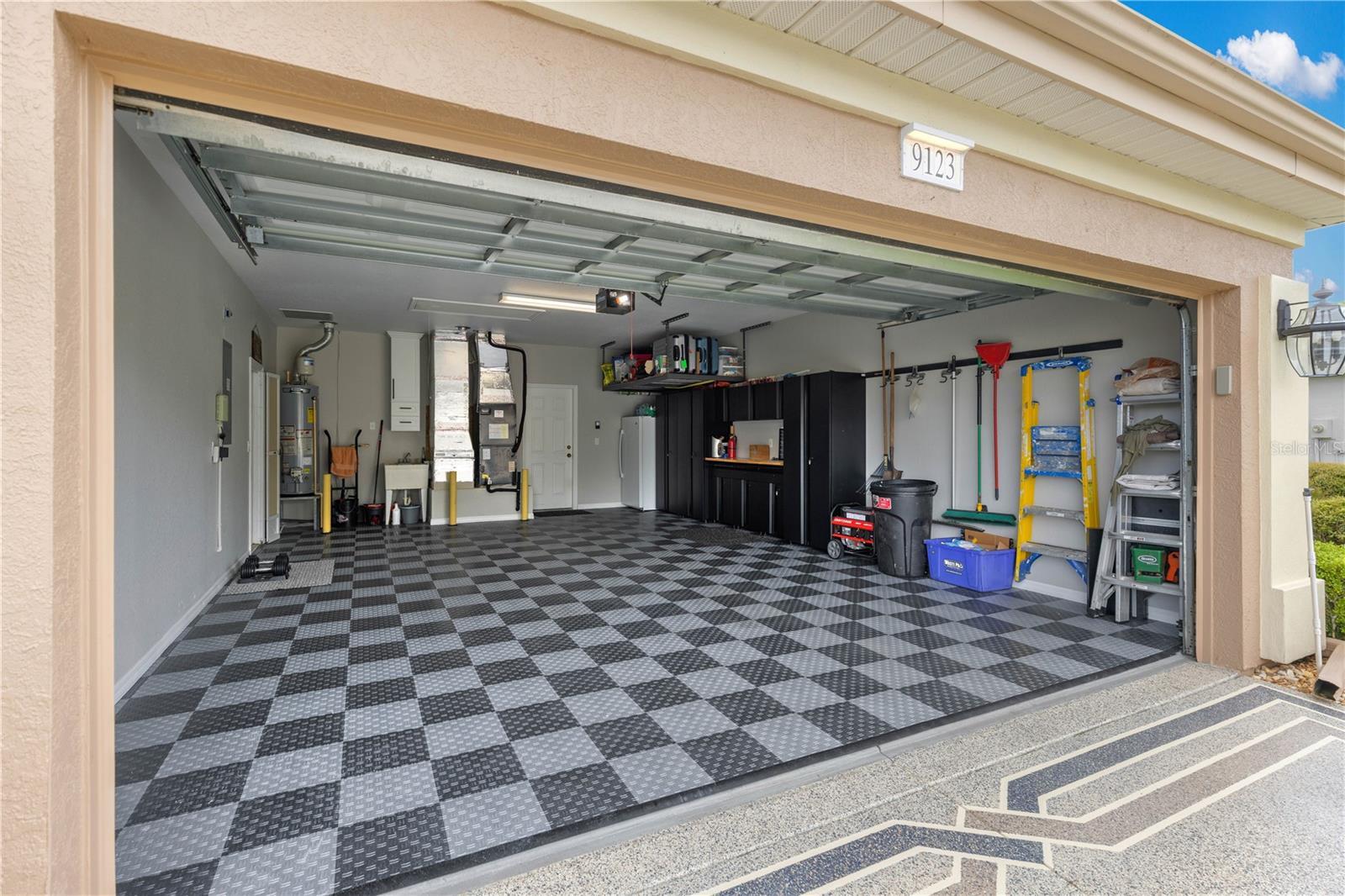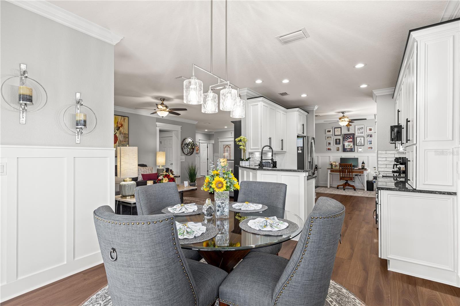 The craftsmanship is seamless and impeccable— you have to see this home in person! Located in the highly sought-after Del Webb Spruce Creek community, this beautifully updated 2 Bedroom, 2 Bathroom home has been meticulously enhanced from 2023 through 2025, offering a truly move-in-ready retreat filled with style and quality. Step inside to find luxury vinyl flooring throughout, designer finishes, and custom decorative trim, crown molding, and plantation shutters that add timeless elegance. The updated kitchen (2023) boasts KraftMaid soft-close cabinetry with roller shelving and kick drawers, granite countertops, a deep sink with designer faucet, and a full suite of stainless steel appliances. The bonus flex room (perfect as an office or third bedroom) showcases batten wall detailing and upgraded lighting with dimmers for added ambiance. The primary suite feels like a private sanctuary with its 2023 spa-style bathroom featuring a white KraftMaid vanity with makeup area, granite counters, decorative tile shower, and updated mirrors, lighting, and remote fan. The walk-in closet includes custom shelving for maximum storage. The second bedroom and bath have also been completely refreshed — from rain glass shower doors to designer tile, vanity, and lighting — everything is move-in ready and beautifully done. Outside, enjoy your expanded lanai and birdcage (2023), perfect for morning coffee or evening relaxation. The home’s freshly painted exterior (2023), new landscaping (2024), updated lighting, and new front storm door (2025) create wonderful curb appeal. The garage is just as impressive with Husky storage cabinetry (2025), interlocking flooring tiles (2025), attic fans (2024), and built-in functionality. Major mechanicals bring peace of mind with a new HVAC system (2024) serviced regularly, roof (2022), and water heater (2018) — all contributing to a worry-free lifestyle. Every update has been made with care, combining comfort, beauty, and practicality. This home truly offers the best of Del Webb Living - in a vibrant, active 55+ community with resort-style amenities, 36 holes of Championship Golf, Pickleball, Tennis, Fitness Center, 3 Pools (1indoor) Shuffleboard, Horseshoes, Bocce Ball, Walking path in Wooded Area and more clubs than you can imagine!!!!