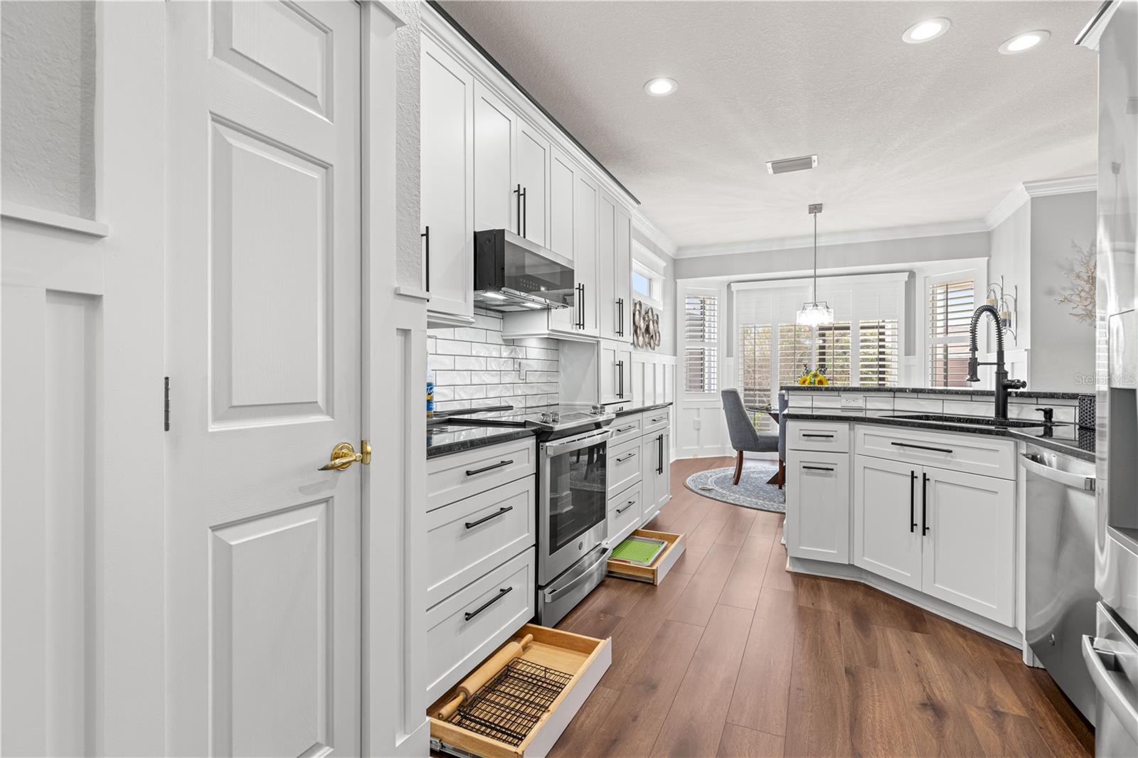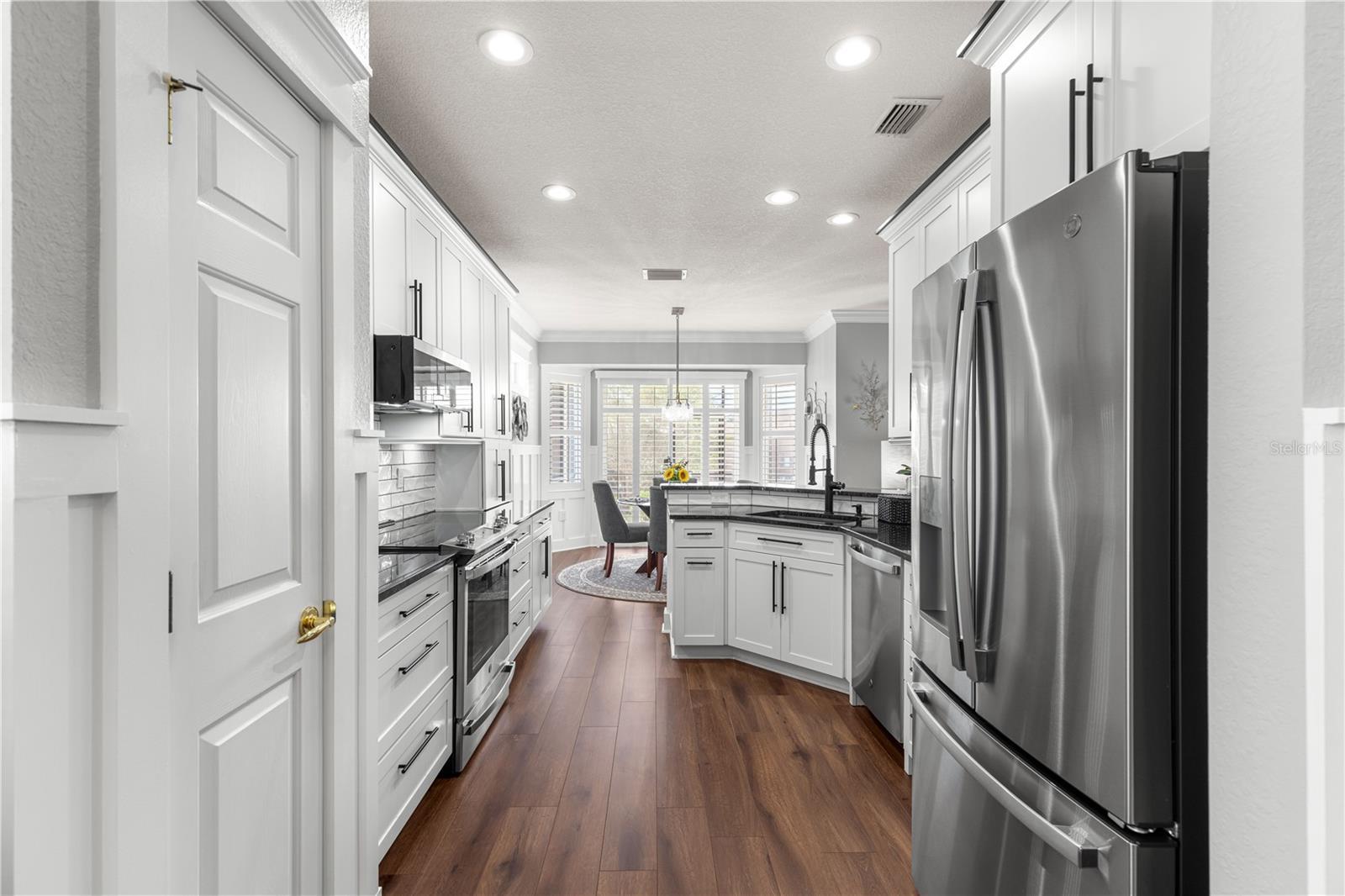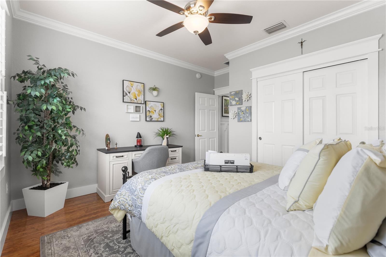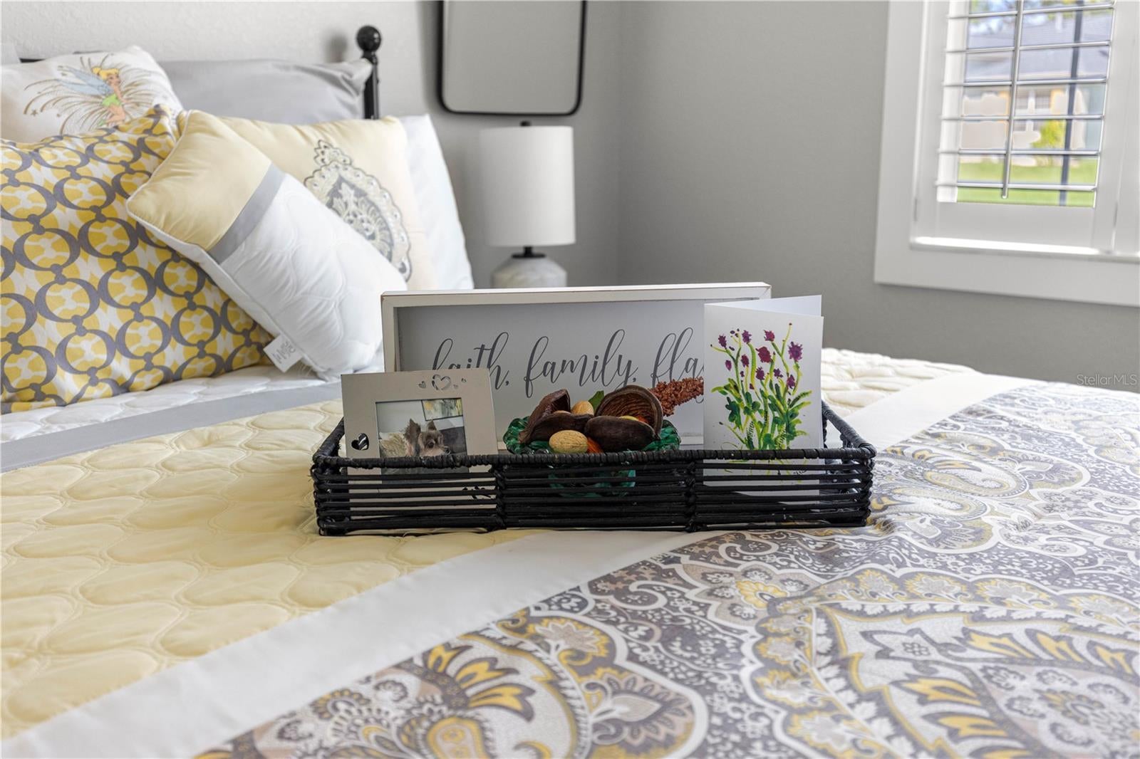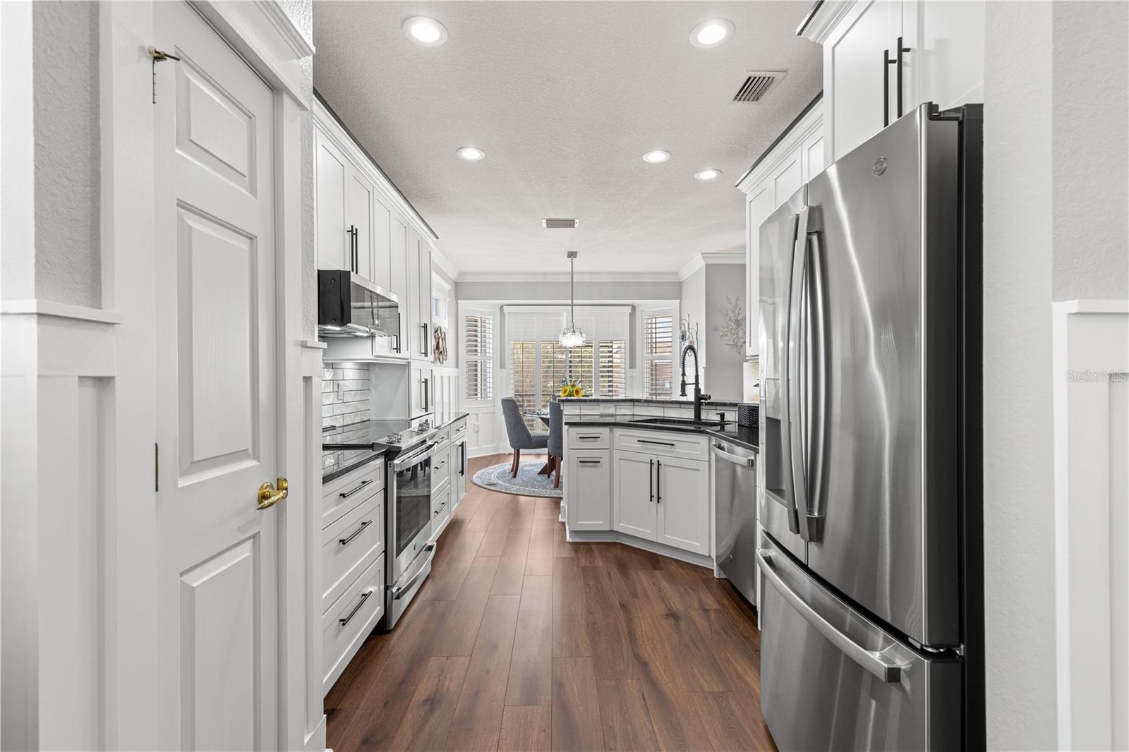 The craftsmanship is seamless and impeccable— you have to see this home in person! Located in the highly sought-after Del Webb Spruce Creek community, this beautifully updated 2 Bedroom, 2 Bathroom home has been meticulously enhanced from 2023 through 2025, offering a truly move-in-ready retreat filled with style and quality. Step inside to find luxury vinyl flooring throughout, designer finishes, and custom decorative trim, crown molding, and plantation shutters that add timeless elegance. The updated kitchen (2023) boasts KraftMaid soft-close cabinetry with roller shelving and kick drawers, granite countertops, a deep sink with designer faucet, and a full suite of stainless steel appliances. The bonus flex room (perfect as an office or third bedroom) showcases batten wall detailing and upgraded lighting with dimmers for added ambiance. The primary suite feels like a private sanctuary with its 2023 spa-style bathroom featuring a white KraftMaid vanity with makeup area, granite counters, decorative tile shower, and updated mirrors, lighting, and remote fan. The walk-in closet includes custom shelving for maximum storage. The second bedroom and bath have also been completely refreshed — from rain glass shower doors to designer tile, vanity, and lighting — everything is move-in ready and beautifully done. Outside, enjoy your expanded lanai and birdcage (2023), perfect for morning coffee or evening relaxation. The home’s freshly painted exterior (2023), new landscaping (2024), updated lighting, and new front storm door (2025) create wonderful curb appeal. The garage is just as impressive with Husky storage cabinetry (2025), interlocking flooring tiles (2025), attic fans (2024), and built-in functionality. Major mechanicals bring peace of mind with a new HVAC system (2024) serviced regularly, roof (2022), and water heater (2018) — all contributing to a worry-free lifestyle. Every update has been made with care, combining comfort, beauty, and practicality. This home truly offers the best of Del Webb Living - in a vibrant, active 55+ community with resort-style amenities, 36 holes of Championship Golf, Pickleball, Tennis, Fitness Center, 3 Pools (1indoor) Shuffleboard, Horseshoes, Bocce Ball, Walking path in Wooded Area and more clubs than you can imagine!!!!