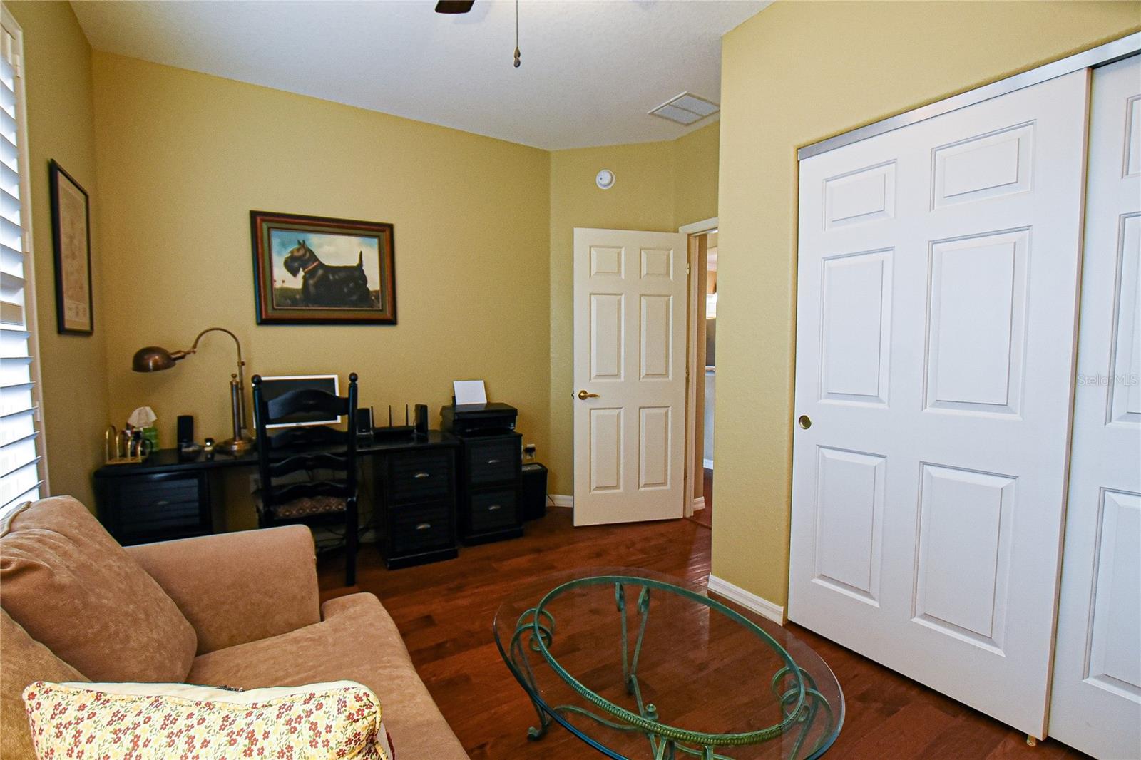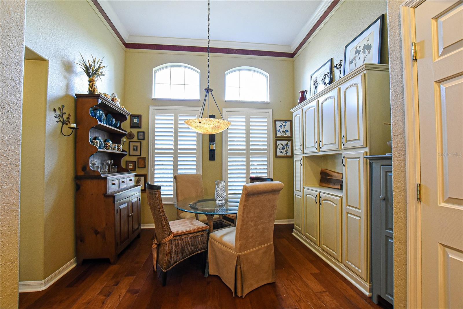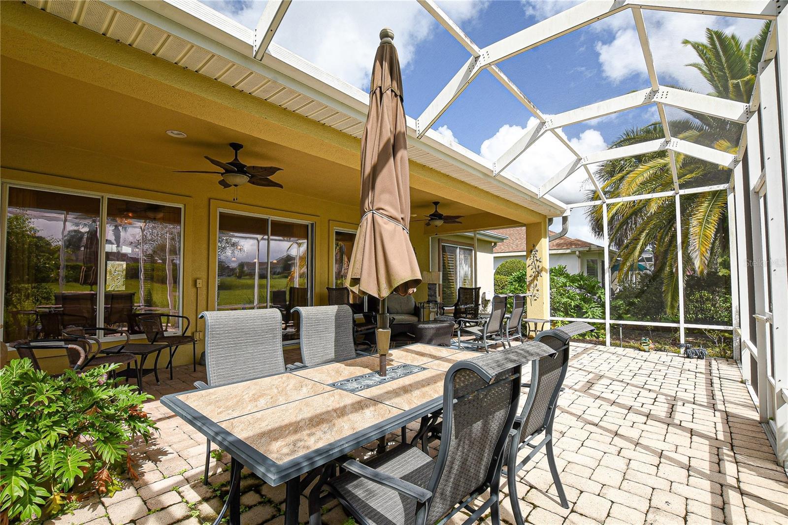 Discover your dream home in this exquisite 1936 sq. ft. Sanibel model sanctuary, where every detail has been thoughtfully curated to enhance your daily life. As you step into the inviting living room, you're greeted by warm, rich hardwood floors and a flood of natural light from large windows, creating an atmosphere of openness and tranquility. Plus, a beautiful glass entry door leading to an inviting foyer. The heart of this home is the beautifully appointed kitchen, featuring sleek stainless-steel appliances, elegant granite countertops, and crisp bisque cabinetry. This culinary haven is perfect for both everyday meals and entertaining guests, with ample space to unleash your inner chef. High ceilings and beautiful arched windows enhance the dining area. Retreat to the luxurious primary bedroom, a spacious 270 sq. ft. oasis designed for ultimate relaxation. The en-suite bathroom boasts a indulgent soaking tub and a separate shower, providing a spa-like experience in the comfort of your own home. For those who work from home, can the 3rd bedroom can be used as a den. The second bedroom is extended in size and provides versatility, easily transforming into a guest room or hobby space to suit your lifestyle needs. Throughout the home, stylish ceiling fans and carefully chosen light fixtures add both functionality and flair. Features include crown molding, Plantation shutters and more. The harmonious blend of warm and cool tones in the decor creates a welcoming ambiance that will make you feel instantly at home. Outside, lush greenery beckons through the windows, promising serene views and a connection to nature. This property isn't just a house; it's a canvas for your dreams, a place where memories are made, and a testament to your success. The enlarged lanai is great for relaxing and back yard is deep and semi-private. The garage is extended and has a golf cart garage that is enclosed and can be utilized as a large workshop or extra storage. Roof was re-shingled in 2021. HVAC new in 11/2017. Roomy inside laundry with extra cabinets. Embrace the lifestyle you've always desired in this thoughtfully designed, move-in ready home that perfectly balances comfort, style, and functionality.