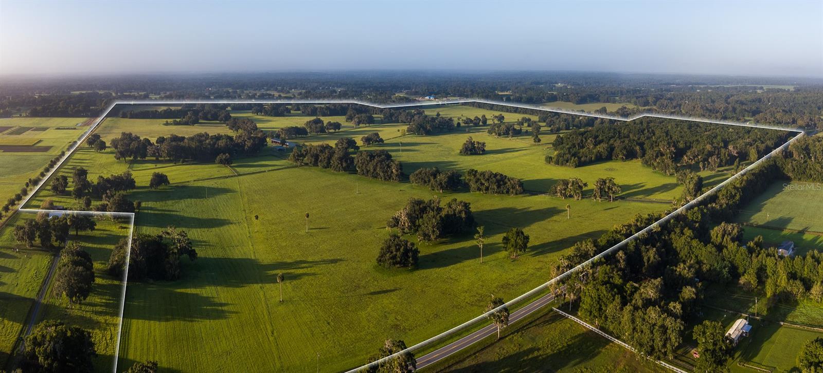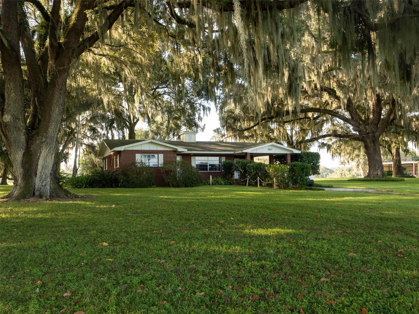 Located on 442+ acres, this remarkable property graced with elegant oak and magnolia trees offers expansive space, timeless Southern charm, and versatile living options. Ideally situated midway between Ocala and Gainesville, it’s just 8 minutes from the Jockey Club and approximately 25 minutes from the World Equestrian Center. A sense of peace washes over you as you drive through the open fields leading to the stunning two-story white Antebellum-style main residence, distinguished by its signature “welcoming arms” front entry. Inside, you’ll find 4 bedrooms, 4.5 baths, and 2 primary suites (one on each floor) with walk-in closets. The custom kitchen showcases wormy chestnut cabinetry and Carrera marble countertops. Rich cherry wood flooring flows throughout much of the home, complemented by tile and carpet in select areas. Expansive covered balconies span the upper level, with the back being completely screened, offering panoramic views of farm fields, woods, and wildlife, while matching brick patios extend below. An elevator ensures effortless movement between floors, and three fireplaces create inviting spaces throughout the home. The two-car garage with adjoining workshop adds practicality for everyday living and hobbies alike. The property also includes two additional residences, ideal for guest homes, family, or on-site staff. A true legacy estate offering privacy, beauty, and classic Southern elegance in a prime Central Florida location. Seller will consider subdividing.