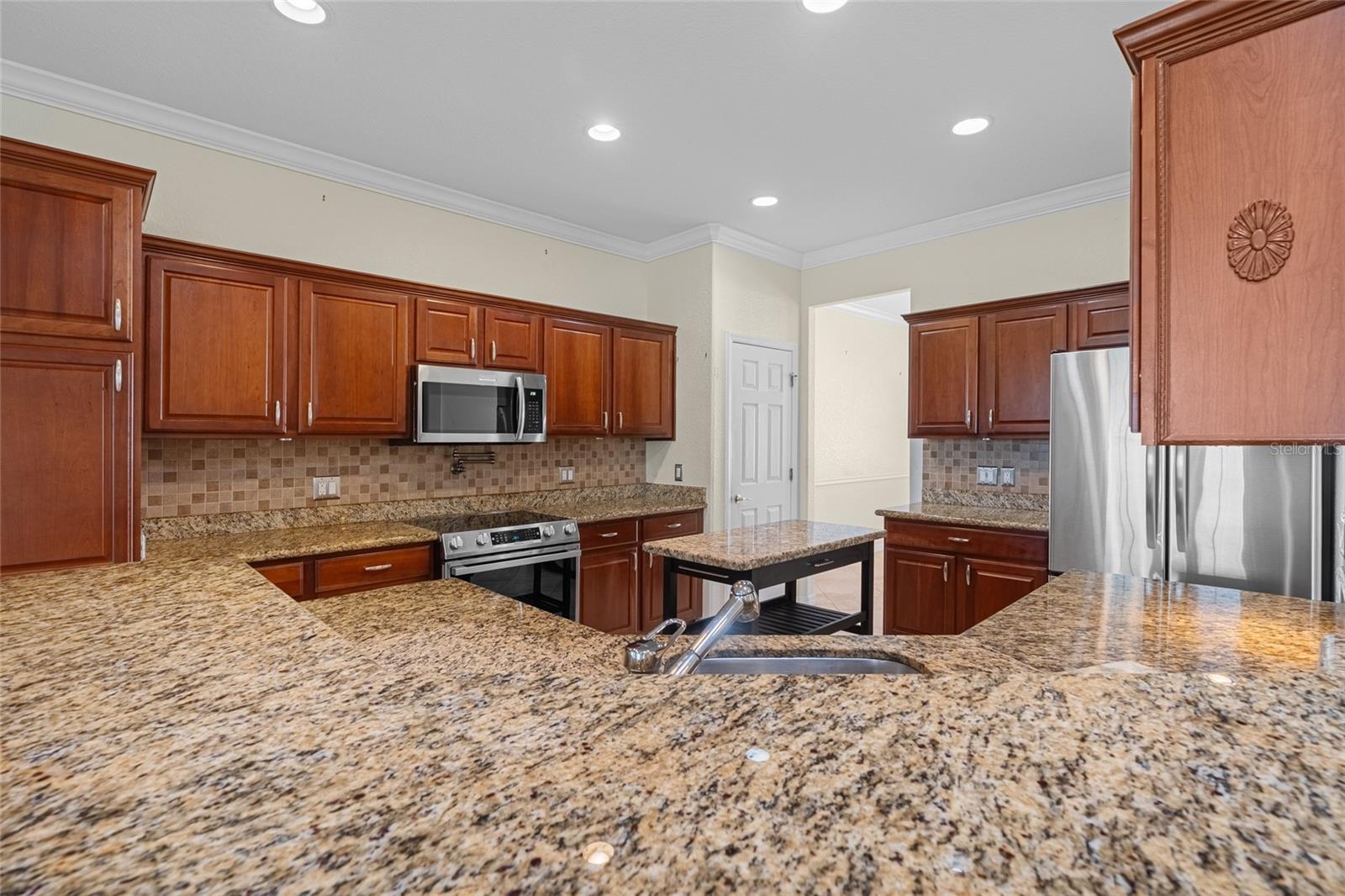 This home is what you are looking for in your next home. Elegance as soon as you walk in. 3br, 2 baths, crown molding. 20" diagonal tile, granite counter tops, newer microwave, stove, dishwasher plantation shutters and sliders, high ceilings, pantry with roll out cabinets under counter, kitchen island. pot filler, both bathrooms have been remodeled, retractable awnings with full cover looking out to a beautiful water view no homes to block your view. 2 car garage with golf cart garage with epoxy floors. Roof fan with padded aluminum sheets across the complete attic, and another fan to take the heat out of the garage. Pre wired generator, Landscaping with curbing. Sun tubes in the laundry and 2 between dining area and living room. painted driveway, garage screens. A/C (2019), new roof (2020), total re-pipe (2019). Don't miss the opportunity to make it yours.