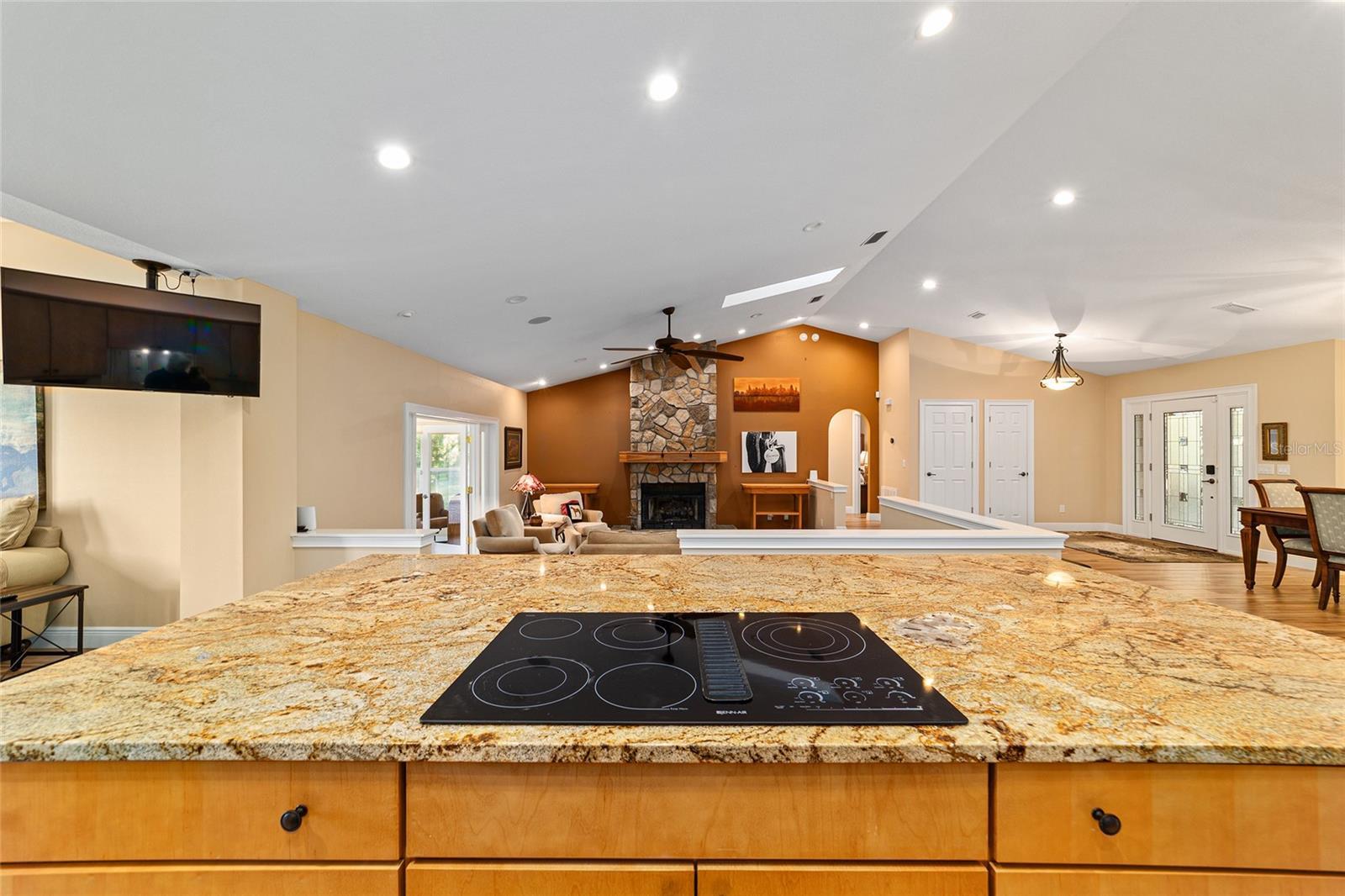 - Built-in Features, Cathedral Ceiling(s), Ceiling Fans(s), Crown Molding, Eat-in Kitchen, Kitchen/Family Room Combo, Open Floorplan, Primary Bedroom Main Floor, Smart Home, Solid Wood Cabinets, Split Bedroom, Stone Counters, Thermostat, Walk-In Closet(s), Wet Bar, Window Treatments