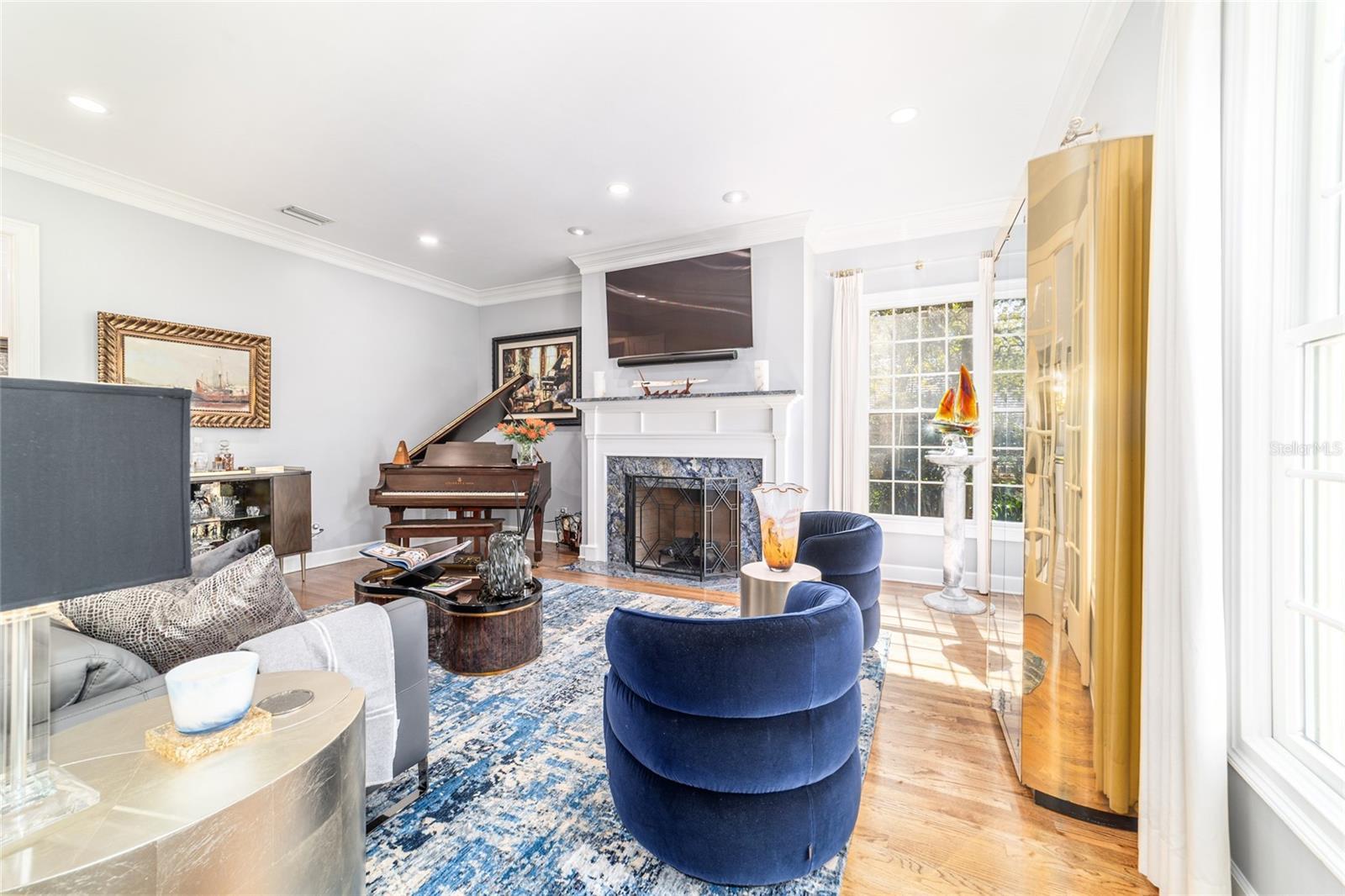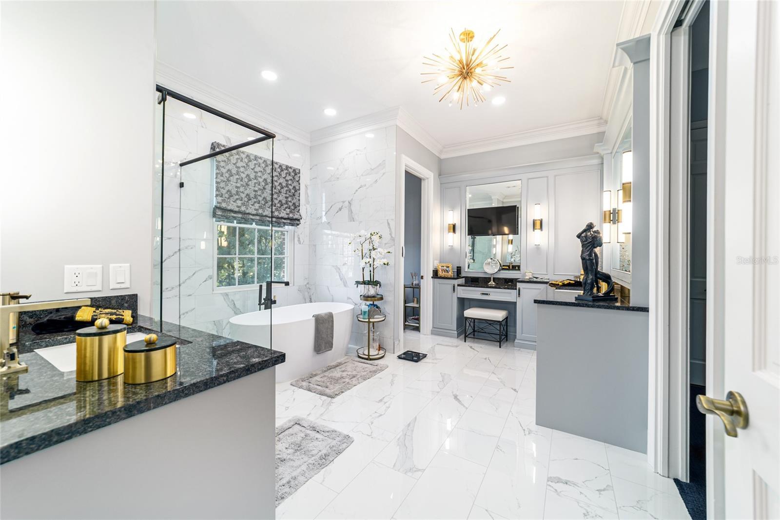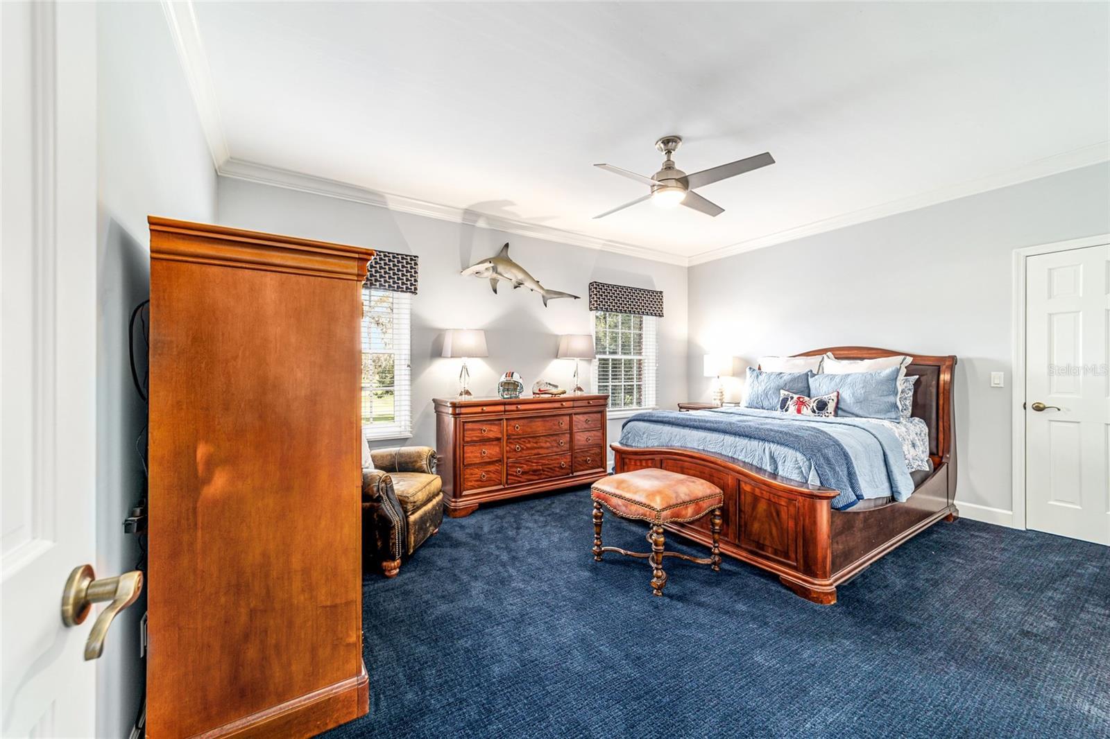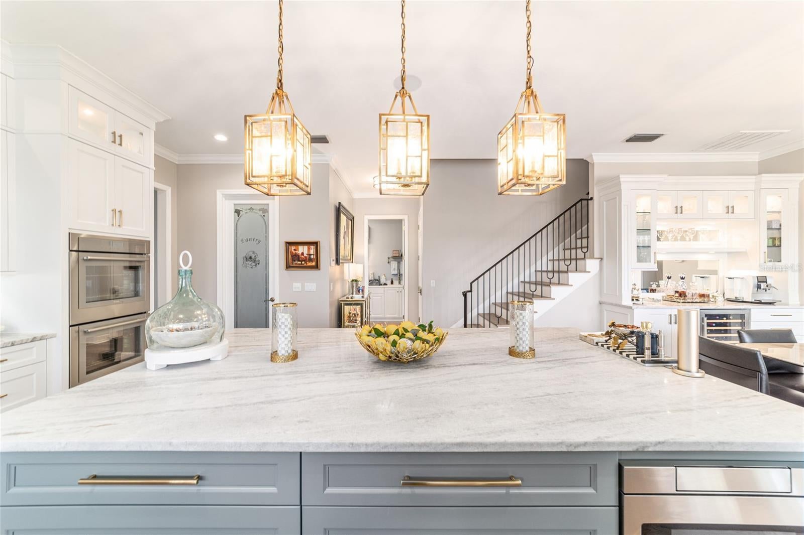 - Built-in Features, Crown Molding, Eat-in Kitchen, High Ceilings, Primary Bedroom Main Floor, Stone Counters, Walk-In Closet(s), Window Treatments