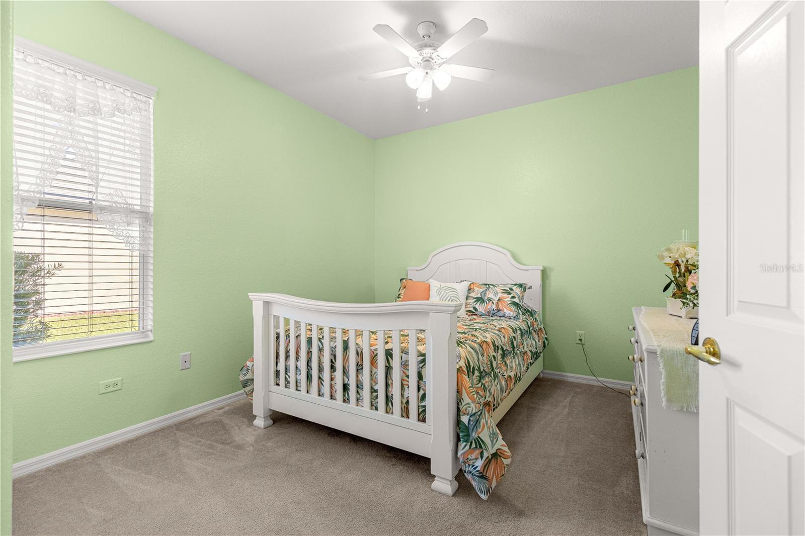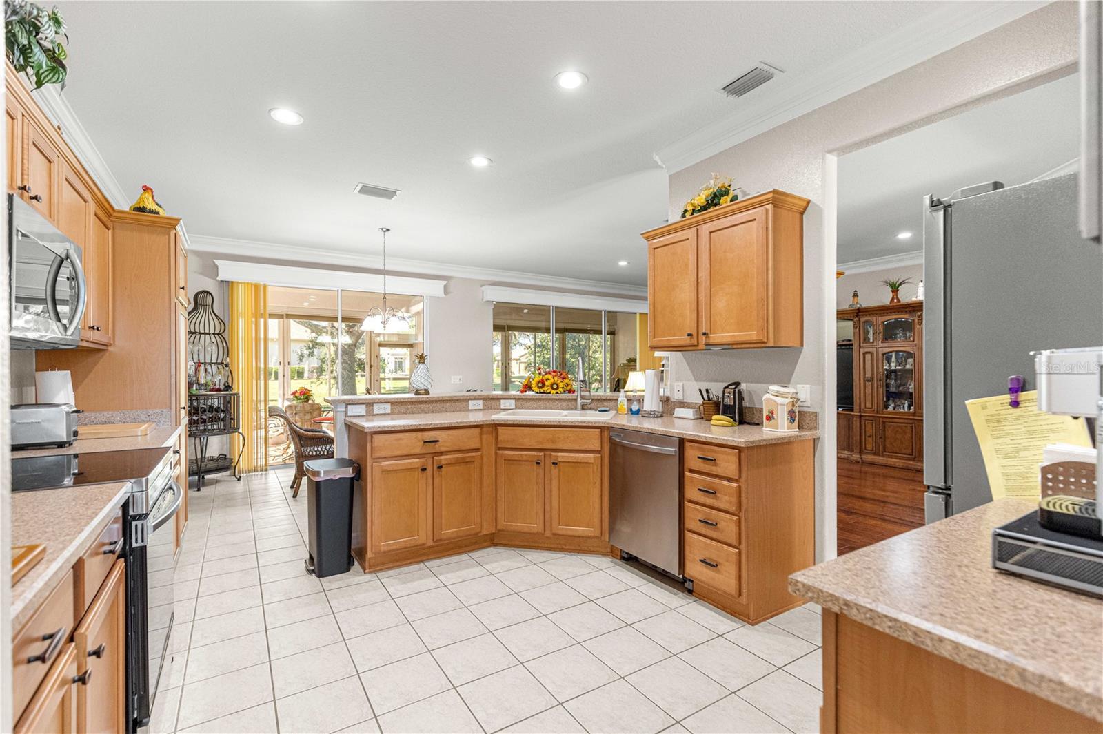 Welcome home to this beautifully maintained 3/2, Hanover floor plan with an extended garage and oversized semi-private lot (room for a pool), located in the sought after Del Webb Golf & Country Club, a premier 55 and better golf course community. From the moment that you arrive, you’ll notice the stamped concrete driveway and walkway, attractive landscape curbing, and inviting double leaded glass entry doors that lend itself to the curb appeal. Additional exterior highlights include an electric roller screen on the garage, gutters and downspouts, an in-ground bait system, new roof in 2023, new Hvac in 2023 for peace of mind. Inside, the home offers a warm, inviting, and open feel with the tile flooring in the foyer and wet areas, engineered hardwood floors in the dining and living room, and crown molding that adds a touch of elegance. The kitchen is a cook’s delight, featuring maple cabinetry with pullouts and crown molding, newer stainless-steel appliances, and recessed lighting. The primary suite features plush carpet, a spacious walk-in closet, and a primary bath with both a soaking tub and separate shower. The guest bedrooms are comfortably sized with carpeted floors and nearby access to the guest bath. The inside laundry is of ample size and conveniently located just off the hallway. The large, enclosed Lania is perfect for added entertaining space and year round use, overlooking the oversized, semi-private lot. Additional upgrades include an attic exhaust fan, an extended garage to fit a golf cart, epoxy-coated floors and pull-down attic stairs for extra storage. This home offers both space and tranquility all within an amenity rich friendly gated community, allowing for an active lifestyle.