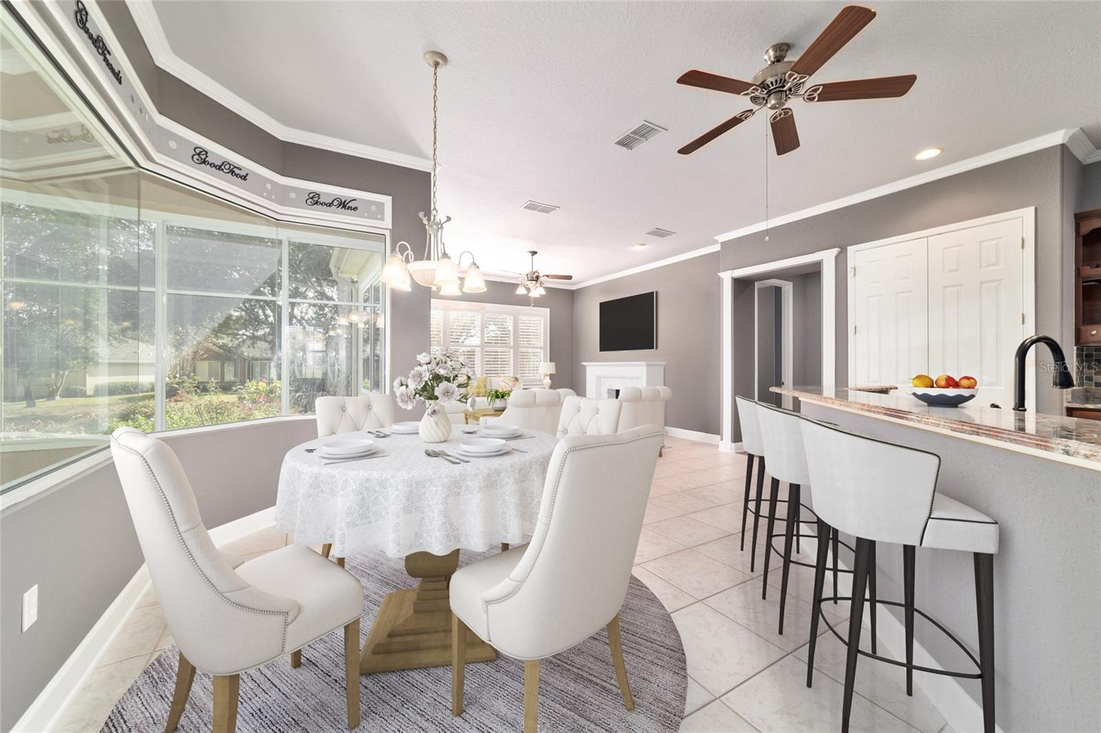 Del Webb Hampton Model features a desirable three-bedroom split-floor plan, two full bathrooms, and a half bath. The home offers recent upgrades, including a new roof (2018) and hot water tank dec 2025 & new Well tank 2024 The primary bedroom is enhanced with a tray ceiling and an updated en-suite bathroom boasting a walk-in shower. The expansive kitchen includes a breakfast bar, granite countertops, and an eat-in area. Additional living spaces include a family room, dining area, sitting area, and a large laundry room with cabinetry. Throughout the residence, you will find plantation shutters, crown molding, and no carpeting. An enclosed lanai with acrylic windows provides excellent views of the greenbelt. The extended garage features a separate golf cart bay, and private well for irrigation. Located within Spruce Creek Golf and Country Club, a 55+ community offering access to 70 clubs.
