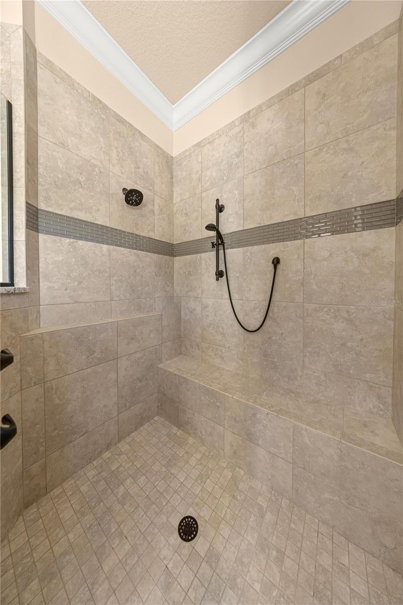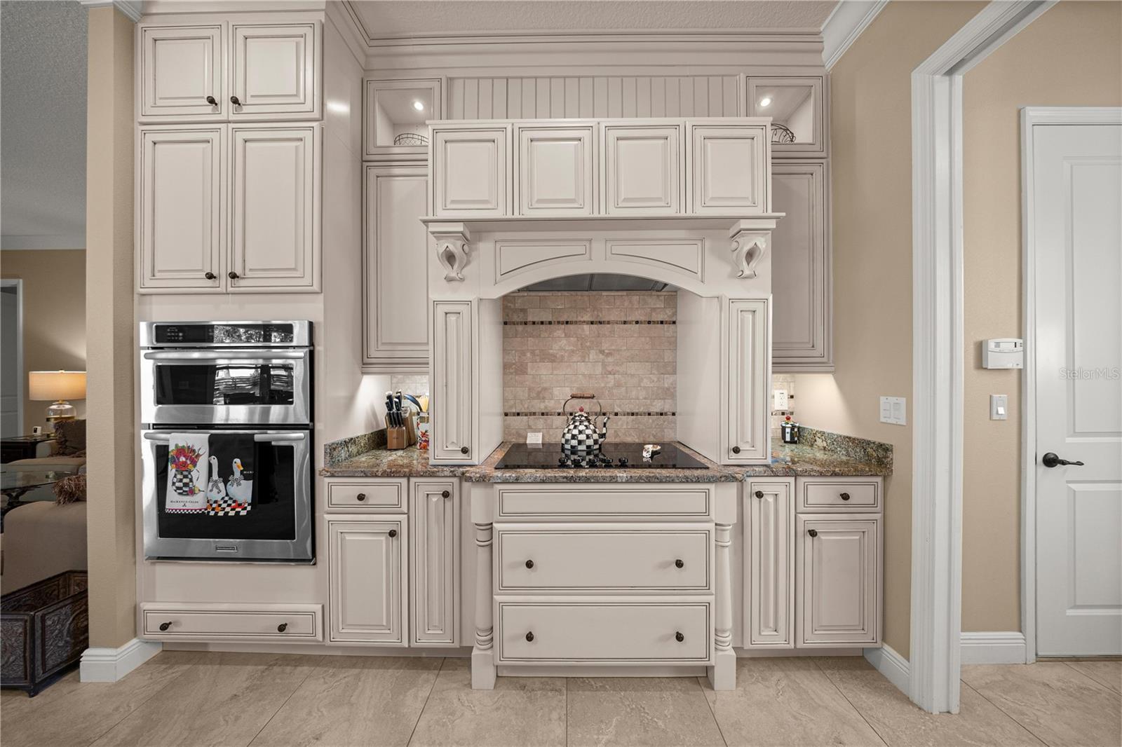 - Crown Molding, Eat-in Kitchen, High Ceilings, Kitchen/Family Room Combo, Living Room/Dining Room Combo, Primary Bedroom Main Floor, Solid Wood Cabinets, Split Bedroom, Stone Counters, Tray Ceiling(s), Walk-In Closet(s), Window Treatments