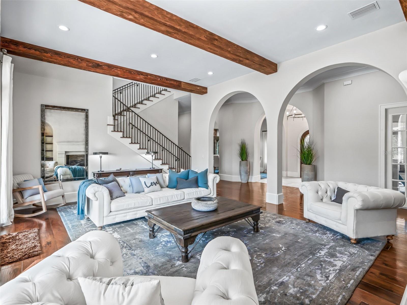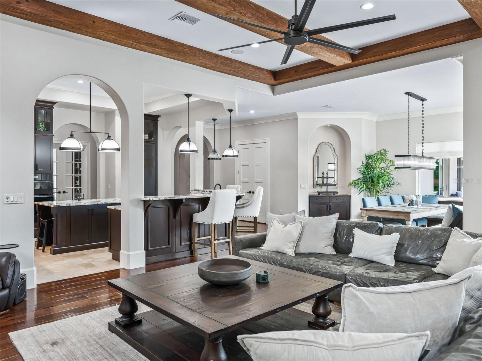 - Built-in Features, Ceiling Fans(s), Dry Bar, High Ceilings, Kitchen/Family Room Combo, Primary Bedroom Main Floor, Walk-In Closet(s)