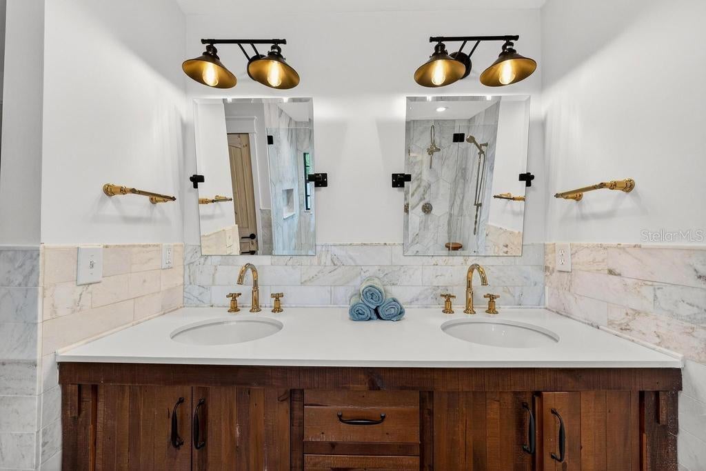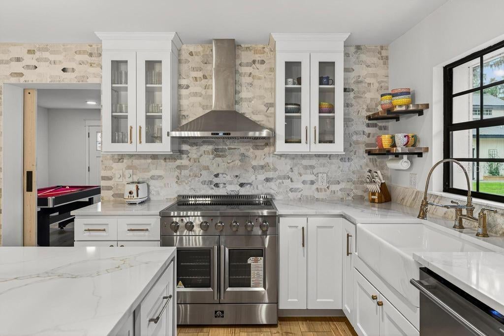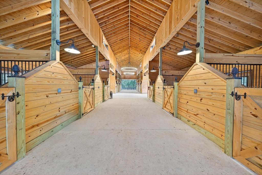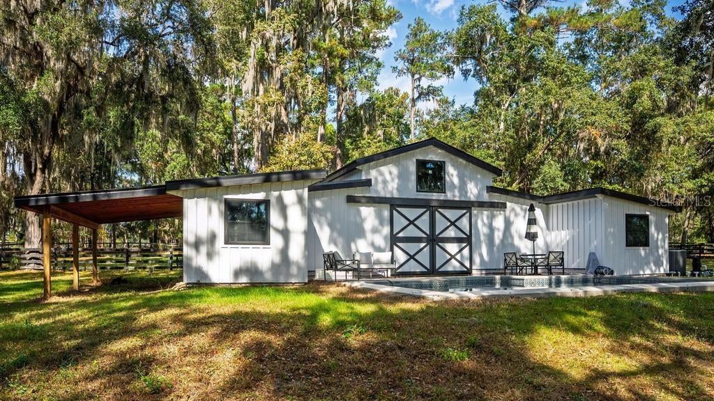Set beneath a breathtaking canopy of centuries-old granddaddy oaks in Ocala’s coveted Field of Dreams, this extraordinary 7-acre estate embodies the pinnacle of refined equestrian living. Surrounded by immaculate estate farms, the property offers unmatched privacy, natural beauty, and effortless access to the World Equestrian Center, HITS, and everyday conveniences—an exceptional blend rarely found. A picturesque, oak-lined drive leads to the fully renovated main residence, thoughtfully positioned deep within the property for peaceful seclusion. The impeccably designed 2,000± sq. ft. home features a welcoming front porch, three bedrooms, and three full designer baths, finished with curated materials and timeless elegance throughout. The chef’s kitchen is a true showpiece, boasting premium appliances, a dramatic waterfall island with seating for six, and panoramic views of the majestic oaks beyond. The private primary suite serves as a serene retreat, complete with a generous walk-in closet and spa-inspired bath featuring an oversized walk-in rain shower. A game room and oversized laundry room add both functionality and comfort to the home’s thoughtful layout. The equestrian amenities are nothing short of spectacular. A meticulously crafted Amish-built, monitor-style barn showcases a striking 24-foot center aisle adorned with chandeliers and clerestory windows, creating a light-filled, dramatic atmosphere. The barn includes twelve spacious 12’ x 12’ matted showcase stalls, dedicated tack and feed rooms, and conveniently located heated-water wash stalls. Just beyond, a 100’ x 200’ natural-footing arena sits beneath a magnificent centerpiece oak and overlooks a serene pond with a fountain, providing a truly postcard-worthy setting. Designed for both entertaining and relaxation, the pond is complemented by a charming gazebo featuring a full outdoor kitchen with gas pizza oven, BBQ, prep space, sink, and a dock where you can feed vibrant koi—an idyllic place to unwind after a ride or host unforgettable gatherings. Additional equestrian features include two birthing stalls, a workshop/garage, and seven paddocks, six equipped with automatic waterers for effortless care and equine comfort. A second matching monitor-style barn offers approved plans for conversion into a two-bedroom guest house with office, creating exceptional flexibility for guests, family, or staff. This structure enjoys its own private gated entrance and is paired with a sparkling pool overlooking a serene oak-framed pastoral vista. Every detail of this remarkable property speaks to intentional design, superior craftsmanship, and timeless elegance—from the board-and-batten farm architecture to the thoughtfully framed oak-studded views and seamless flow of the equestrian facilities. Located in the heart of Ocala’s horse country yet minutes from everything, 8583 NW 130th Street presents a rare opportunity to own a turnkey, luxury equestrian estate in one of the area’s most desirable neighborhoods.