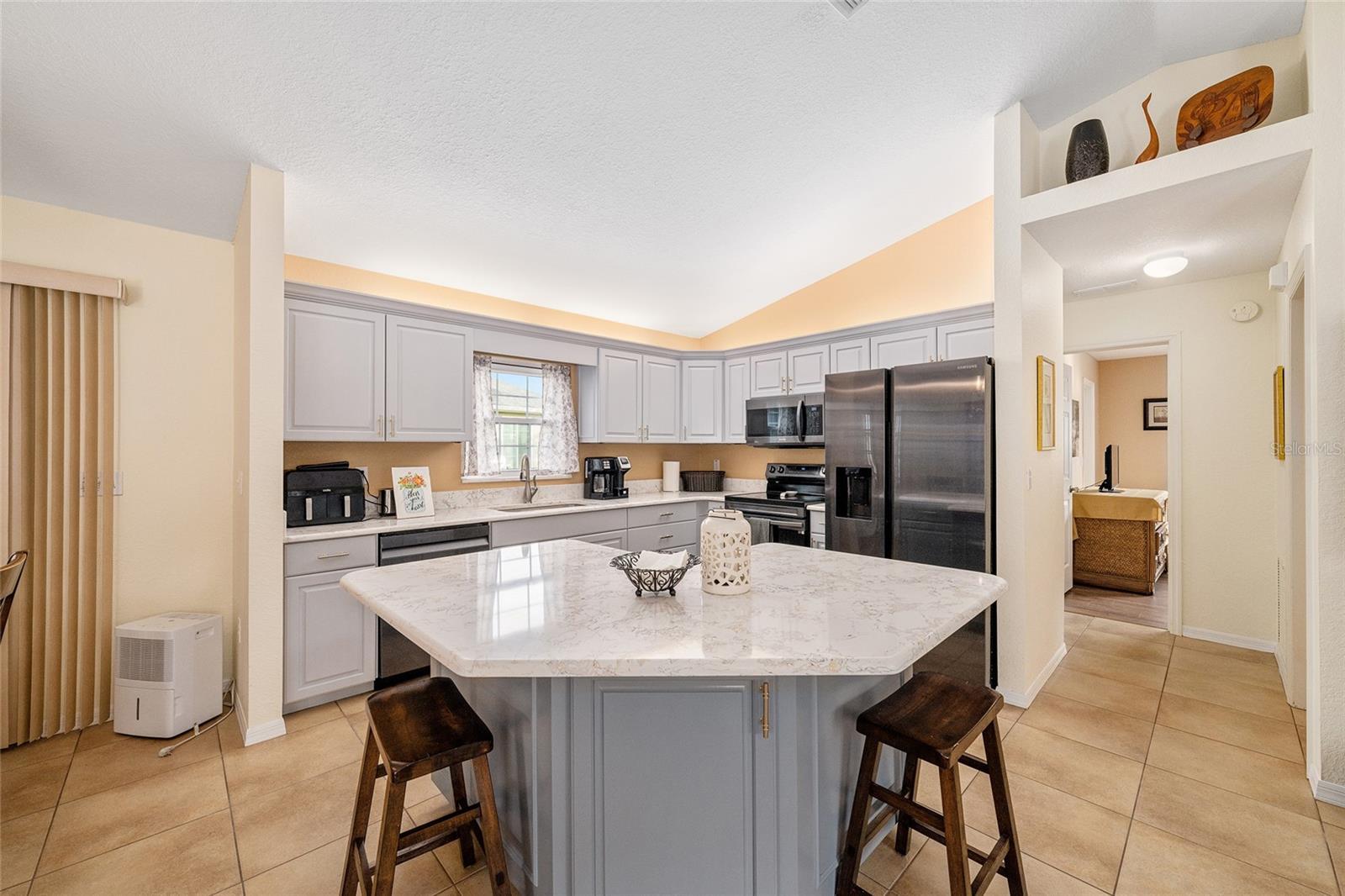 Perfect 2/2/2 Chestnut on a corner lot tucked away on a seldom traveled loop. The Front Porch measures 22 ft long and is the perfect place to have your morning coffee. You can also enjoy your coffee on the Lanai in privacy. This open floorplan Chestnut has been updated with beautiful, professionally painted kitchen cabinets and quartz countertops. The Kitchen features a large breakfast bar with storage underneath and new SS appliances as of 2021, has ambient lighting and was freshly painted a couple years ago. You will find vaulted ceilings in the Living Room, Dining Room & Kitchen and ceiling fans throughout. There is porcelain tile in the main areas and new water resistant laminate flooring (2024) in the bedrooms and both (2) walk in closets. There is an inside Laundry area with upper cabinets for storage. The enclosed Lanai has vinyl windows, vertical shades and indoor/outdoor carpeting. There is a 2 car garage with sliding privacy screens, a utility sink, key-less entry and a work bench. The windows were replaced in 2018. The HVAC was replaced in 2012 (Humidistat). Architectural shingles were installed in 2013. Water Heater in 2020. The Furniture can be part of the purchase with some exclusions (there is a Murphy Bed in the Guest Bedroom). Seller is offering a 1-year Broward Factory Home Warranty with an acceptable offer. Come see this home soon!