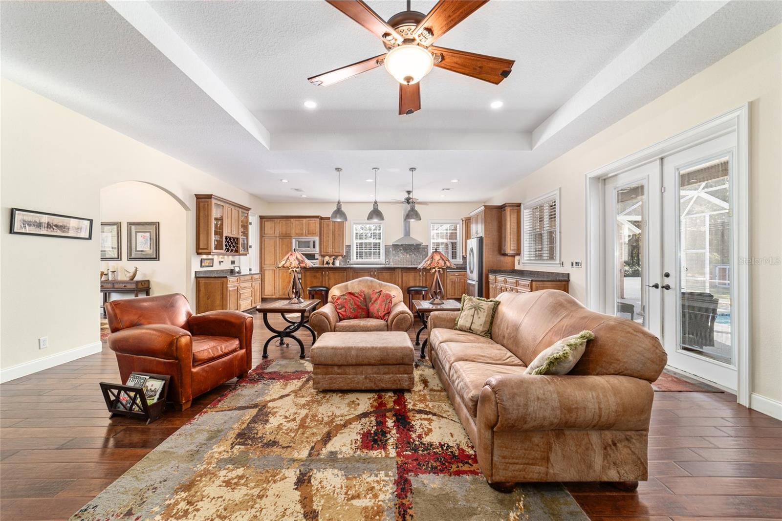- Ceiling Fans(s), High Ceilings, Kitchen/Family Room Combo, Open Floorplan, Primary Bedroom Main Floor, Solid Surface Counters, Solid Wood Cabinets, Split Bedroom, Stone Counters, Thermostat, Tray Ceiling(s), Walk-In Closet(s), Window Treatments