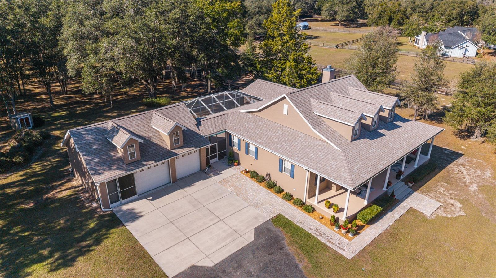 Under contract-accepting backup offers. Tucked away on a quiet dead-end road between established private farms, this thoughtfully designed 5.81 acre property offers privacy and timeless Florida charm. Perimeter fenced with an automatic gated entrance, the property is shaded by live oak trees and designed for both comfortable living and versatile use. At the heart of the property is a custom-designed 2-bedroom, 2-bath pool home featuring a dedicated office, ideal for remote work, creative pursuits, or use as a 3rd bedroom. The home boasts ample storage and includes a bonus room flooded with natural light that can accommodate a variety of needs. An oversized three-car garage and workshop provide ample space for vehicles, equipment, and hobbies and a whole house generator ensures that your activities are never interrupted by a power-outage. The inviting farmhouse-style front porch sets the tone—perfect for morning coffee while taking in peaceful views of neighboring pastures and daily equestrian training routines nearby. A separate guest house adds exceptional flexibility, offering a private, 450 sq. ft. studio apartment for family or guests, along with a two-bay, air-conditioned workshop—well suited for storage, projects, or climate-controlled workspace needs. Conveniently located just 4.5 miles from the HITS Show Grounds and approximately 14 miles from the World Equestrian Center, the property also provides easy access to numerous equestrian venues while maintaining a tranquil, country setting. Whether you’re seeking a private retreat, a functional mini-farm, or a property that balances rural serenity with proximity to Ocala’s renowned amenities, this offering delivers versatility, comfort, and location in equal measure. New Roof on Main Home and Guest Home in 2025. Exterior Paint on both homes 2025.
