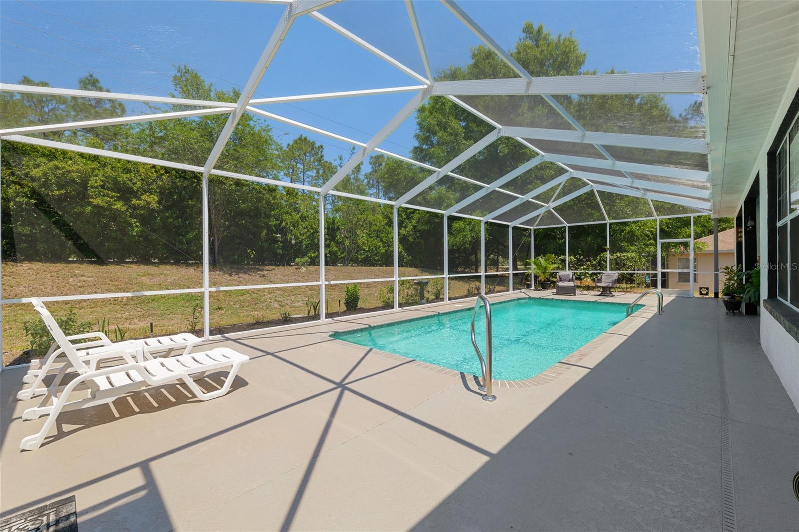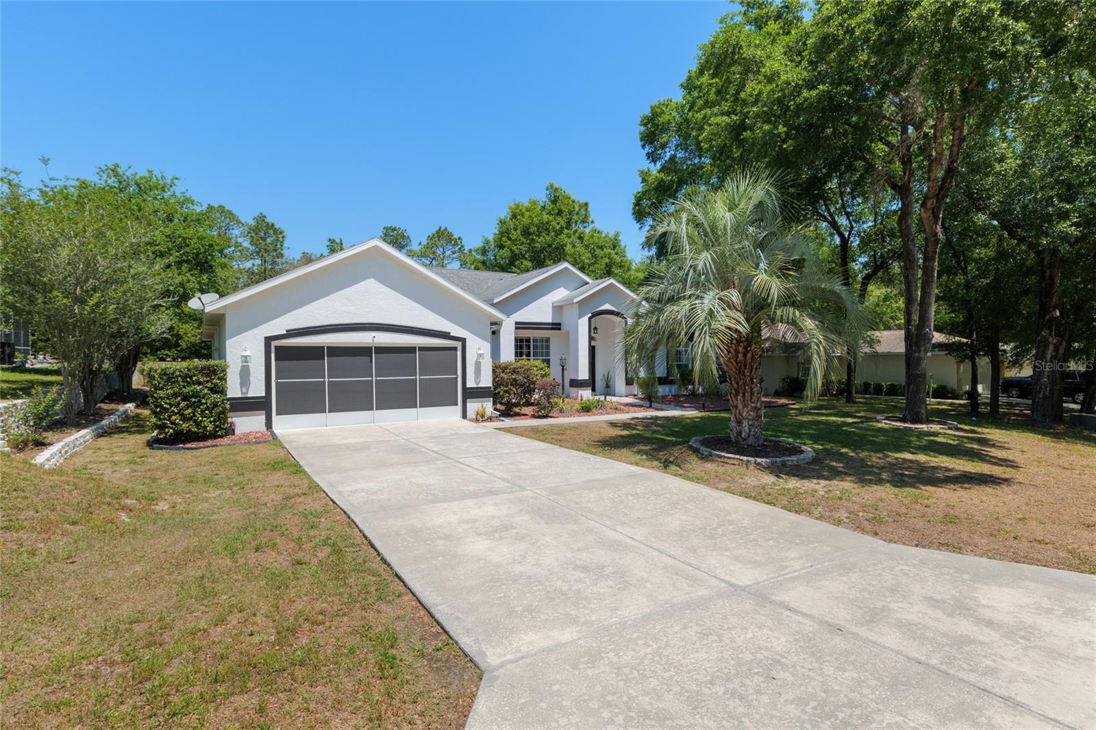 Welcome to this 3-bedroom, 2-bathroom pool home located in the highly sought-after Rainbow Springs Country Club. As part of Rainbow Springs Country Club, you’ll enjoy access to a vibrant community center offering a fitness room, game rooms, restaurant, swimming pool, and pickleball, basketball, and tennis courts. Residents also have private small vessel launch access to the crystal-clear Rainbow River for tubing, kayaking, and canoeing; plus a scenic riverside pavilion. If you are not on the river or enjoying community amenities, this home will be your private oasis to recharge for the next adventure. Step inside to find a formal dining room and living room, ideal for entertaining or relaxing in style. The heart of the home is the open-concept kitchen and family room, flooded with natural light from expansive windows and sliding glass door. The spacious Primary Suite is a true retreat, featuring his and hers walk-in closets, split vanities, a tile shower, a luxurious soaking tub, and private sliding glass door access to the lanai. On the opposite side of the home, two additional bedrooms share a well-appointed bathroom with convenient pool access—perfect for guests or family. Step outside to your own private oasis: a beautiful solar-heated saltwater pool with a covered patio area and screen enclosure making the space ideal for outdoor dining and entertaining. Additional highlights include an interior laundry room and an oversized garage, complete with a workshop area. Pride of ownership is evident throughout this home. Pool deck painted 2025. Saltwater generator and control panel 2024. New HVAC installed 2021. Exterior paint 2020. Pool Light 2019. Concrete Stone Retaining Wall 2019.