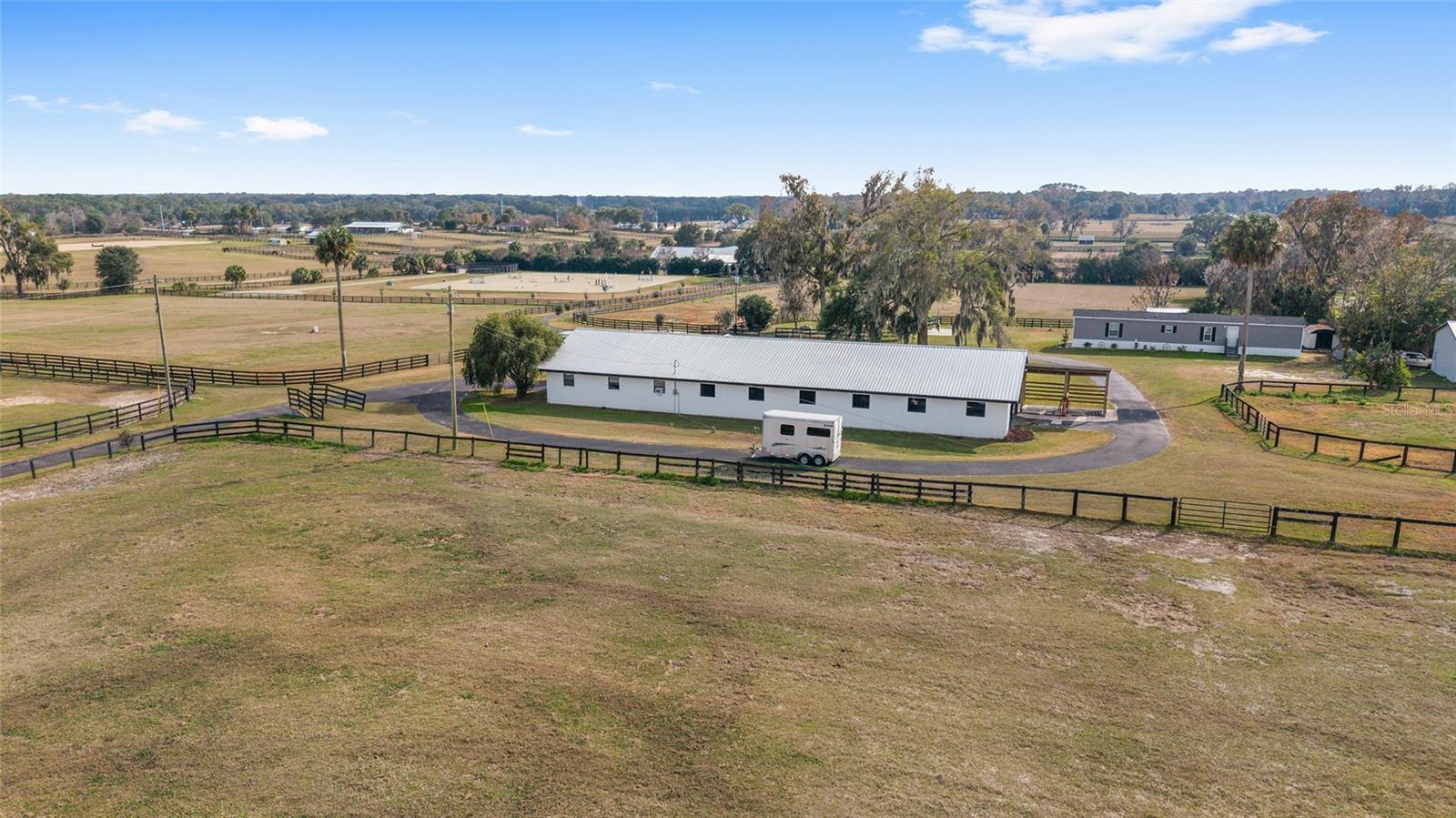 This fully built equestrian training and boarding facility is designed to support a professional program, offering the scale, layout, and infrastructure required for efficient daily operations. Located in Northwest Ocala’s highly sought-after Golden Corridor, this approximately 50-acre property is fully operational today while offering substantial room for expansion and long-term growth. The facility includes three barns totaling approximately 43 stalls, multiple on-site living quarters, and a complete training, conditioning, and recovery layout, thoughtfully designed to prioritize horse flow, labor efficiency, and functionality for serious operations. The main training barn features 14 oversized stalls with IDA rubber flooring throughout, insulated interior, updated electrical and lighting, new stall doors, industrial stall fans, and large ceiling-mounted HVLS fans for superior airflow and summer heat reduction, along with three cross-tie stations, a fly spray system, dedicated tack room, and laundry facilities. Attached to the main barn is an approximately 2,400 sq ft barn apartment with four bedrooms, one bath, full kitchen, living area, office, storage, and direct barn access—ideal for on-site management or owner-operator living. Adjacent is a 40’ x 60’ open-sided conditioning and recovery barn featuring additional wash racks, a six-horse European-style walker with IDA rubber flooring, a shavings container with hydraulic roof lift, and space currently configured for therapy and spa use; equipment may be negotiated separately. Training amenities include a 200’ x 200’ outdoor riding arena, 150’ gymnastic pad, 60’ lunge circle, and 60’ round pen, all constructed with GGT footing and integrated sprinkler systems. The second barn is a ~4,700 sq ft center-aisle block barn with approximately 15 stalls and a new metal roof (2024), updated electrical and lighting, fly spray system, tack room with laundry and half bath, interior cross-ties with rubber flooring, and a covered double wash rack with hot water. The third barn is a wood-frame run-in barn with metal roof servicing the rear grazing pastures, allowing flexible turnout and shelter for additional horses. A 24’ x 50’ hay barn with new siding and additional storage sits adjacent to the second barn, serviced by a newly paved asphalt driveway. A brand-new 2025 three-bedroom, two-bath manufactured home provides additional on-site housing, along with climate-controlled storage in a heated and cooled Tough Shed and a 30’ x 50’ enclosed metal-roof structure currently used as an animal enclosure. The property is divided into 26 paddocks with automatic waterers and mature shade, including front turnouts with large shade trees, several paddocks with lean-to shelters and fans, and larger grazing areas to the rear. With established infrastructure, multiple living quarters, automatic water systems, and a prime Northwest Ocala location, this property offers exceptional efficiency and scalability for a professional equestrian operation while retaining the flexibility to evolve into a premier estate-level property over time