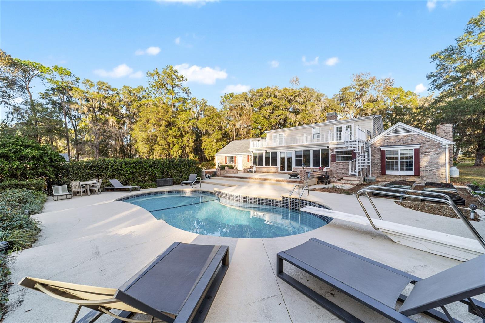 Nestled on a quiet stretch of Shady Road Ranches, this gated estate offers the perfect blend of privacy, beauty, and convenience. Set on just under 5 fully fenced acres, the property features professional landscaping, excellent curb appeal, and an owner-installed garden—ideal for starting a farm-to-table lifestyle or hobby farm. The multi-story 3BR/2.5 bath pool home offers high ceilings, abundant natural light, and an open layout. The main living area features a cozy fireplace and flows seamlessly into the well-appointed kitchen with stainless steel appliances, ample cabinetry, tiled backsplash, under-cabinet lighting, center island, and pass-through window to the sunroom—perfect for entertaining. The formal dining area includes beautiful built-in shelving. New Roof less than 2 years old, new AC in upstairs of main home. The first-floor primary suite is a private retreat with sitting area, fireplace, walk-in closet, and en-suite bath with dual vanities, soaking tub, and glass-enclosed shower. The air-conditioned sunroom includes a wet bar and entertainment space and opens through French doors to the expansive pool deck and sparkling in-ground pool. An upper balcony with exterior spiral staircase overlooks the pool and backyard. Upstairs bedrooms share a bath and provides direct access to the balcony. A private studio-style apartment with kitchen and full bath provides flexible space for guests, in-laws, or home office use. Located minutes from the Florida Horse Park and a short drive to Ocala shopping, dining, medical, and entertainment. A rare opportunity to enjoy peaceful country living with modern comfort and convenience.**