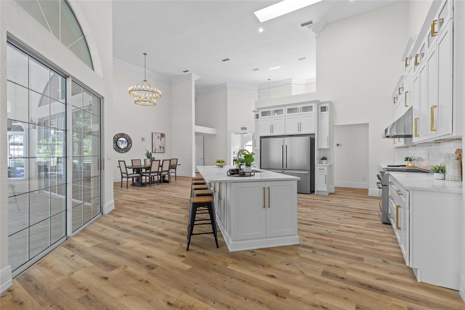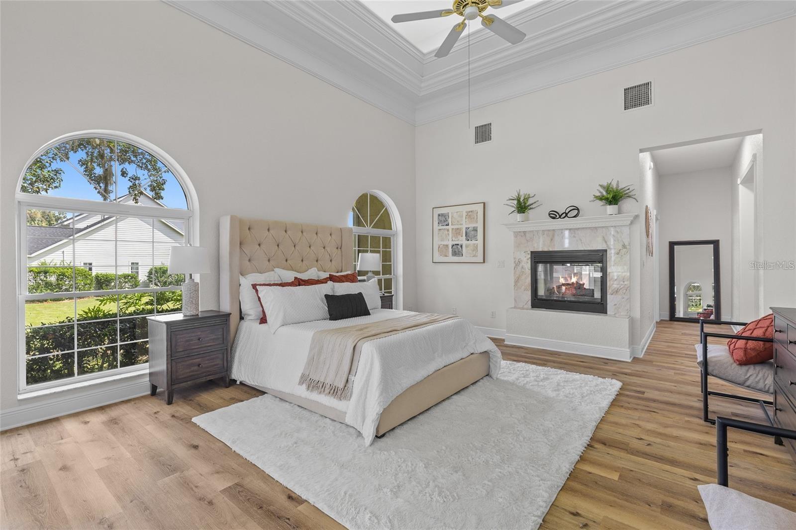 Welcome to this stunning, fully renovated luxury residence situated on a spacious one-acre lot within the exclusive, guard-gated Country Club of Ocala. This exquisite five-bedroom pool home boasts breathtaking views of the immaculate golf course, seamlessly blending classic charm with contemporary enhancements for an unparalleled living experience. Step inside to be captivated by the impressive eighteen-foot ceilings and the generous natural light that pours in through the magnificent arched windows. The open-concept kitchen is truly a chef’s paradise, showcasing high-end stainless-steel appliances that blend style with functionality. The centerpiece is a professional-grade gas range, complete with a sleek hood that adds a modern touch. Custom cabinetry, designed for soft-close convenience, offers ample storage while exuding elegance. The generously sized center island serves as both a prep area and a gathering spot, seamlessly connected to a charming dining area that boasts picturesque views of the sparkling pool outside. The kitchen effortlessly transitions into the expansive living area, featuring a stunning gas fireplace that reaches from floor to ceiling, serving as a captivating centerpiece. The primary suite is a luxurious retreat, complete with soaring ceilings, elegant crown molding, a cozy private fireplace, and direct access to the pool. Adjacent to the kitchen, you'll find a spacious butler’s pantry that enhances the kitchen’s functionality, alongside a well-appointed laundry room. This practical space is equipped with extra cabinetry for even more storage solutions, a handy utility sink, and a washer and dryer that are included with the home, making laundry day a breeze. The master bathroom is a lavish escape, offering over 380 square feet of opulent amenities, including floor-to-ceiling tile work, a relaxing soaking tub, dual vanities, and a dual-headed walk-in shower, all crowned by a fireplace that enhances the spa-like experience. A generous walk-in closet with custom shelving completes the owner's wing. Each additional bedroom and bathroom has been tastefully remodeled with designer touches, ensuring comfort and style throughout the home. Outside, the screened-in pool and spa provide a serene oasis, perfect for entertaining while enjoying beautiful views of the golf course. With a brand-new roof installed in 2023, this home combines worry-free living with modern elegance in one of Ocala’s most desirable neighborhoods. This property exemplifies the ultimate in Country Club living, offering elegant interiors and a resort-style outdoor experience—a unique chance for those seeking an elevated lifestyle on the golf course.