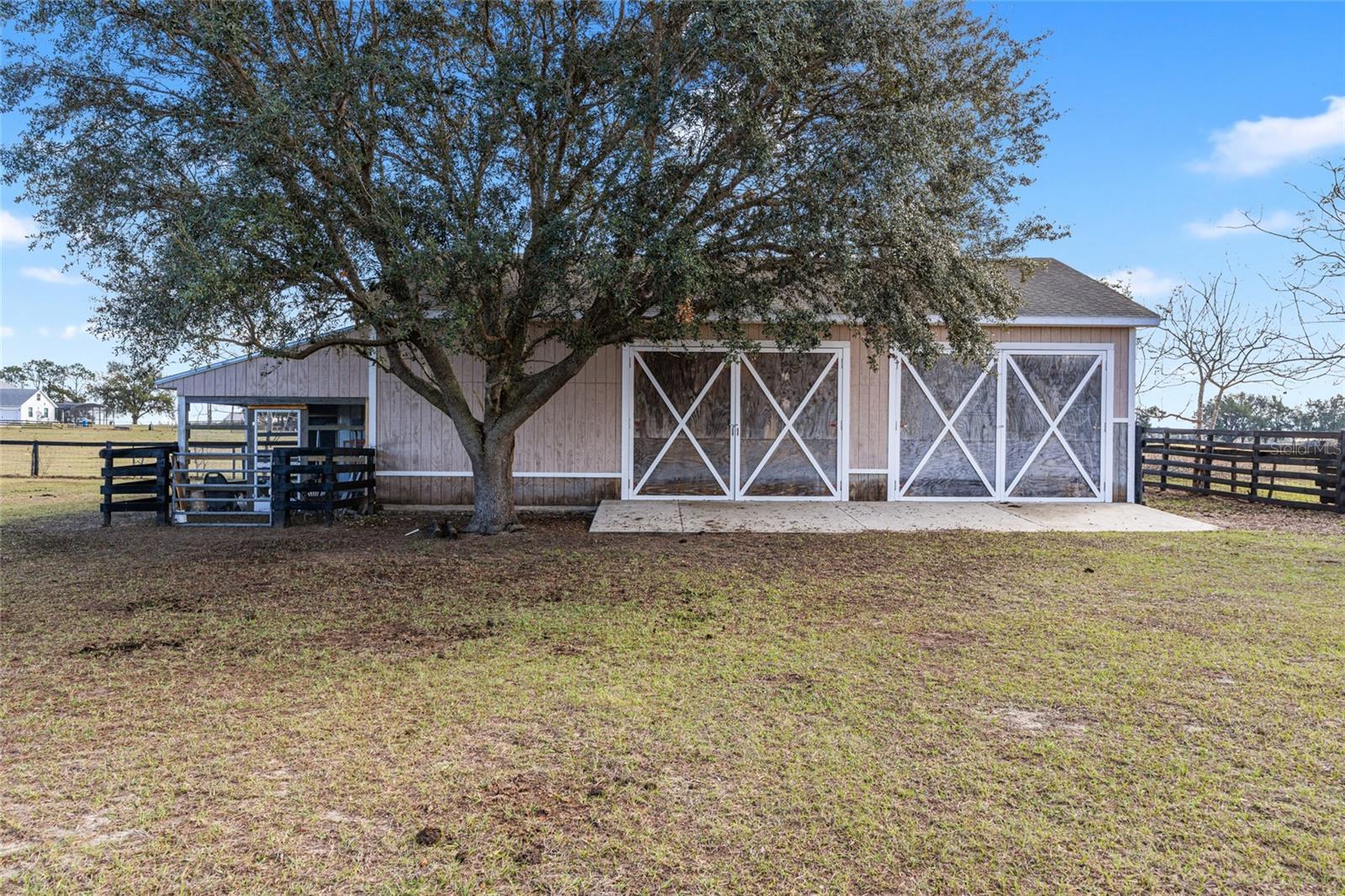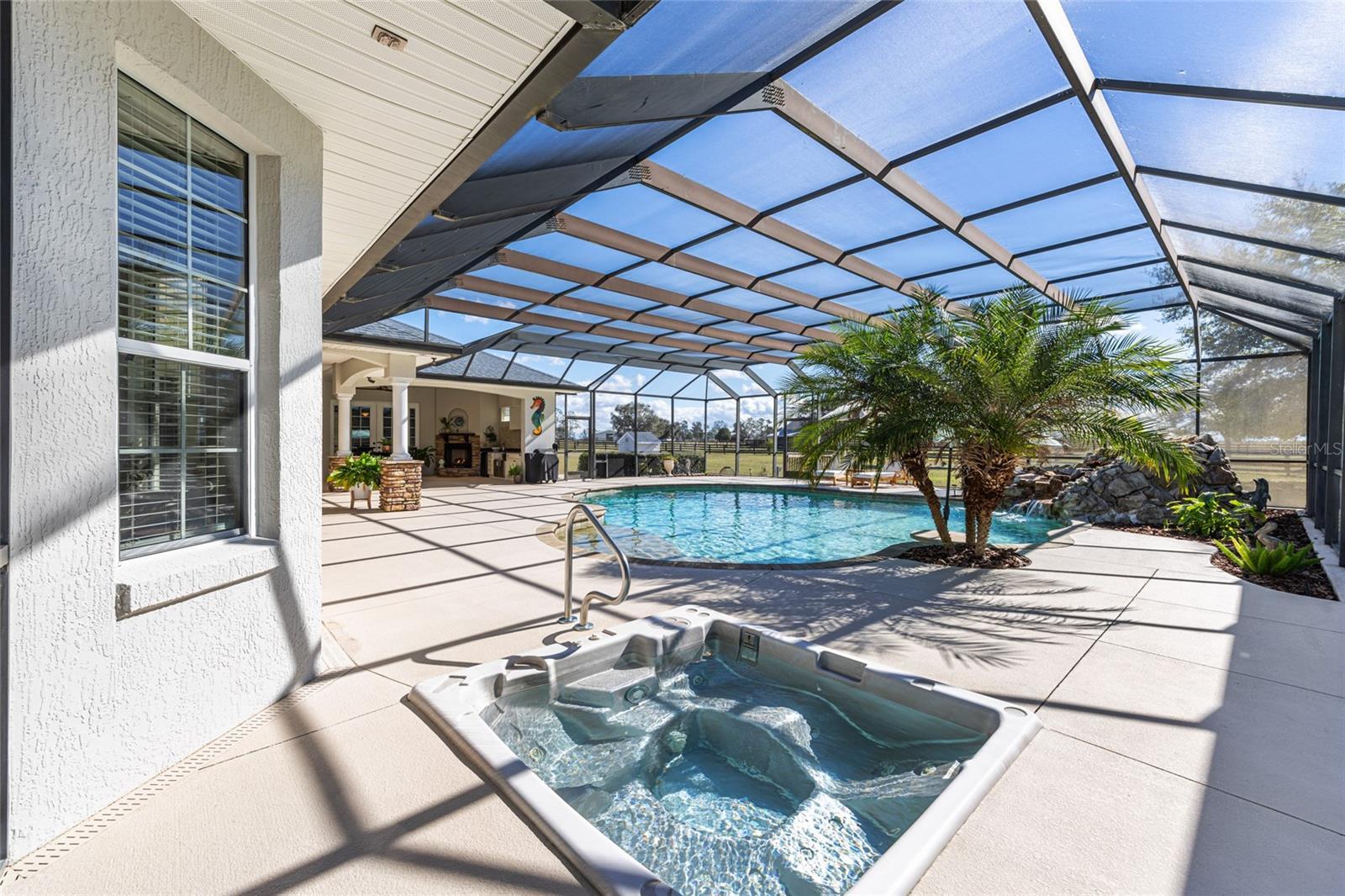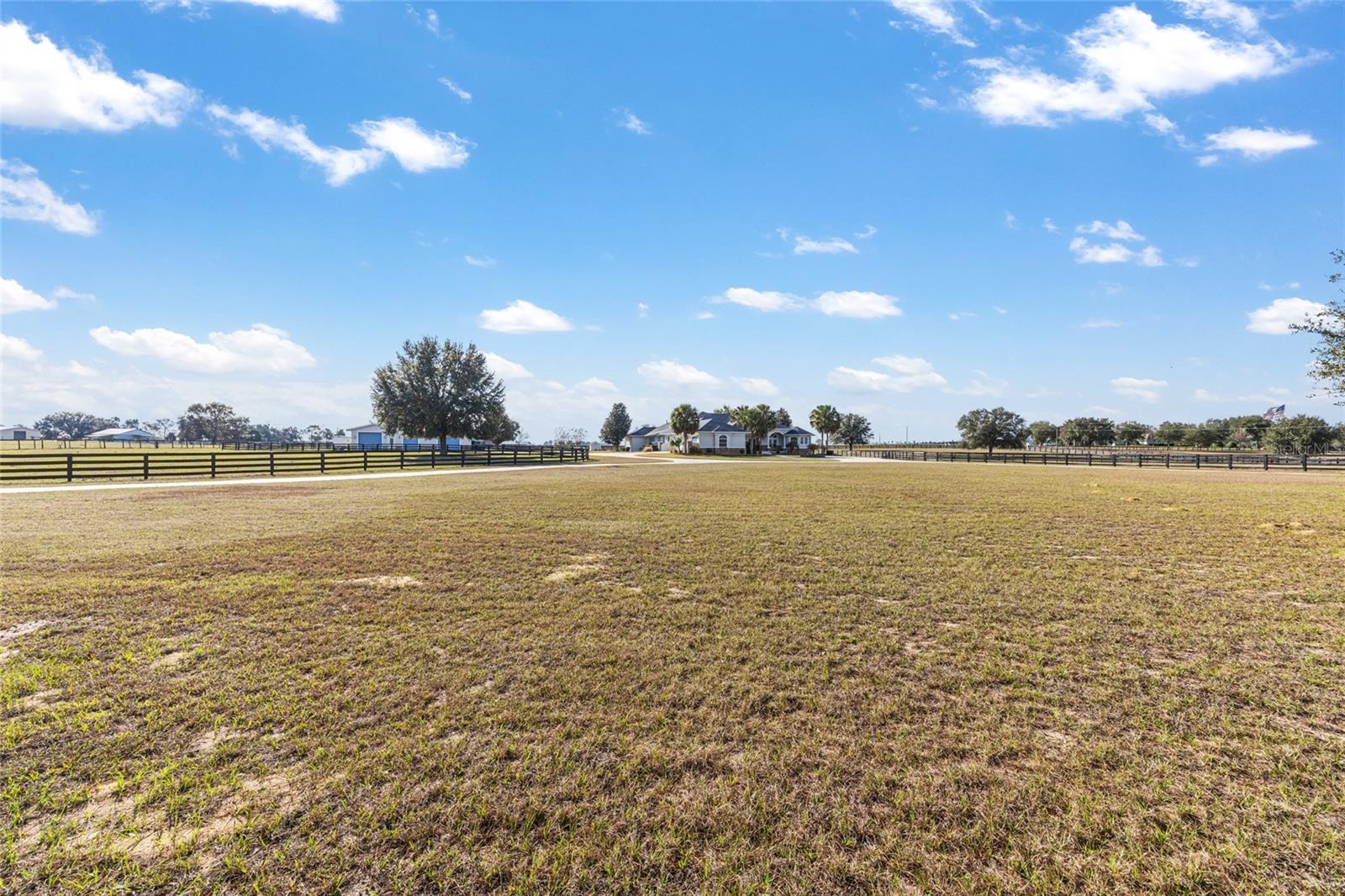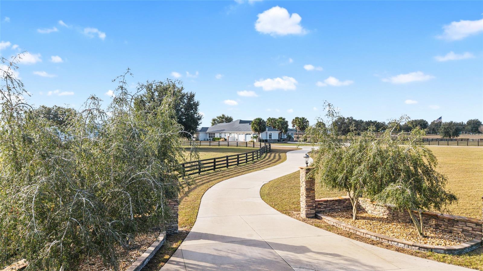 Welcome to this distinguished estate in the exclusive community of Equine Acres. Set on ten fully fenced and cross-fenced acres in Wildwood, just south of Ocala and moments from The Villages, this property offers a refined blend of luxury, privacy and functionality for both horse enthusiasts and those seeking an expansive country retreat. With two separate residences on the property, it is quite versatile. A stone-columned circular drive introduces the stately residence, which spans 4,829 square feet under air. Double doors open to a grand foyer and an airy floor plan designed for comfortable living and elegant entertaining. Beyond the entry, a wall of French doors frames serene views of the resort-style outdoor living area. Finishes include hardwood and tile floors, soaring ceilings with crown molding, and icynene foam insulation in both walls and ceilings for efficiency. Surround sound is integrated throughout. The well-appointed chef’s kitchen is equipped with stainless steel appliances, granite countertops, custom solid-wood cabinetry with a matching range hood, double wall ovens, warming drawer, a walk-in pantry, and a breakfast bar overlooking the family room. A stone gas fireplace anchors the family gathering space, while the adjacent breakfast nook invites morning sunlight and views of the pool. The owner’s suite provides a private sanctuary with lanai access, sitting area, dual walk-in closets, and a spa-style bath featuring dual vanities, a roman shower and a jetted tub. Two additional bedrooms each offer walk-in closets and ensuite baths, complemented by a powder room, full pool bath, and large laundry room. The bonus room allows flexible use for a theater, fitness or recreation space and connects to an attached three-car garage. Designed for year-round enjoyment, the outdoor area showcases a heated saltwater pool with rock waterfall and spa, framed by a tropical silhouette screen enclosure. The covered lanai and full outdoor kitchen create an ideal setting for entertaining or quiet relaxation. A separate 40-by-40-foot structure, designed to mirror the main home’s architecture, includes a full one-bedroom guest apartment, full kitchen and half bath that is plumbed for a shower, along with garage and workshop space. Four cross-fenced pastures with water access accommodate horses, cattle or hay production. There is also a 50' x 60' barn with loft in the rear of the property. Located on a paved, no-through street among similar acreage estates, this property offers serenity and space with proximity to dining, shopping and equestrian venues. A comprehensive features list is available upon request. Schedule a private showing to experience this exceptional estate firsthand.